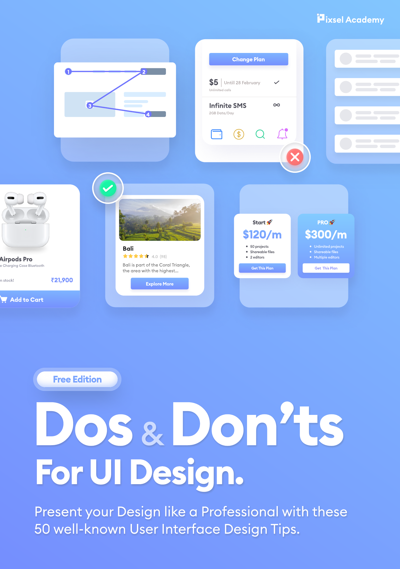 1 2 3 4 Change Plan $5 Infinite SMS 2GB Data/Day Untill 28 February Unlimited calls Bali Bali is part of the Coral Triangle, the area with the highest... 4.0 (98) Explore More Start PRO 50 projects Shareable files 2 editors $120/m $300/m Get This Plan Get This Plan APPLE Airpods Pro ₹21,900 with MagSafe Charging Case Bluetooth Headset Only left in stock! Add to Cart Dos Don’ts & Present your Design like a Professional with these 50 well-known User Interface Design Tips. For UI Design. Free Edition ixsel Academy Dos & Don’ts For UI Design01 An Introduction First of all, Thank You so much for getting this “Dos and Don’ts For UI Design” for yourself. Secondly, let us introduce ourself – “We are the team of qualified designer at Pixsel who aim to provide the best knowledge to upcoming Designers. We think that sharing the knowledge we have, will bring the community together. With this hope, the Instagram page named – Pixsel Academy was created. Soon we saw a massive increase in the community. We’re extremely happy to receive the love of such a massive community. As we were sharing the knowledge through our posts yet, we decided to make this freebie for our followers that contains around 50 UI design tips. 50 UI Do’s & Don’ts by pixsel academy02 I hope, this will help you in a way and that’s what our mission is. Providing the knowledge and resourses that we can. Let’s all grow together and grow this community even bigger. Thank You so much. 50K Follow Message 38123 Pixsel - UX UI Design Tips Let’s learn the language of design Quick UI/UX Tips Follow and Join with us Posts Followers Following 50K Let’s begin pixselacademy Use language to connect labels and values. human-like Dos & Don’ts For UI Design04 Human-like LanguageTip - 1 Avoid using Robotic language, this will make user confused. APPLE Airpods Pro APPLE Airpods Pro ₹21,900 ₹21,900 with MagSafe Charging Case Bluetooth Headset with MagSafe Charging Case Bluetooth Headset In stock: 7 Cart Only left in stock!7 Add to Cart Button Button pixselacademy Limit SaturationTip - 2 Title Title Adding elements with high saturation will damage the contrast of your dark UI. Avoid going beyond of tone level when using colors. 200 - 500 Dos & Don’ts For UI Design05 pixselacademy Most of the people prefer light theme. So, make a different color palette with darker shades. 06 Making 2 Color PalettesTip - 3 Avoid using same color palettes for both Dark and Light mode. Dos & Don’ts For UI Design pixselacademy Using alignment make user’s orient much better and faster in forms. horizontal Horizontal AlignmentTip - 4 Inconsistent alignment looks very unprofessional and hard to follow. Name Name Email Email Contact Contact Submit Submit Dos & Don’ts For UI Design07 pixselacademy Use + representation to create rational and emotional impact. Icon Label Menu RepresentationTip - 5 Avoid using only labels for complex or abstract functions. New Tab New Tab New Incognito New Incognito Recent Tabs Recent Tabs Downloads Downloads History History Bookmark Bookmark Dos & Don’ts For UI Design08 pixselacademy Property Feature Breaking Up Content Beautiful Waterfront Location Fast check-in experience Free secure parking PROPERTY FEATURES Beautiful waterfront location. 98% of recent guests gave this location a 5- star review. Fast check-in experience. 95% of recent guests gave the check-in experience a 5-star review. Free secure parking. This property features a single lock-up garage with storage. 98% of recent guests gave this location a 5-star review. 95% of recent guests gave the check- in experience a 5-star review. This property features a single lock- up garage with storage. Tip - 6 Allow people to quickly scan content by using and . descriptive headings icons Avoid using only text for showing important features. Dos & Don’ts For UI Design09 pixselacademy Use a consistent icon set for better communication among the users. Icon ConsistencyTip - 7 Inconsistent icons could create a risk of confusion and can hurt brand’s visual credibility. Icons Icons See our Icons collections: See our Icons collections: A B C Dos & Don’ts For UI Design10 pixselacademy Having options with clear description helps the users to take decision as per his/her choice. Descriptive OptionsTip - 8 This is an example of bad UX. It creates confusion for users to select an option. Discard draft Discard draft Are you sure you want to cancel your upload? Are you sure you want to cancel your upload? Cancel Don’t Cancel OK Yes, Cancel Dos & Don’ts For UI Design11 pixselacademy Use a to indicate the user’s status in the process flow. process bar Process Bar Payment Shipping Detals Payment Card Card Tip - 9 Here user won’t be able to track their process in the flow. Card Number: Card Number: Cardholder Name: Cardholder Name: Expires on: Expires on: CVV: CVV: Pay Now Pay Now 32 Dos & Don’ts For UI Design12 pixselacademy Show the user and the error occurred. This help users to do the necessary changes. where why Tooltips & Guides Here users will find it difficult to locate the error and the reason for the same. Tip - 10 Cancel Cancel Login Login Username: Username: pixselacademy pixselacademy ********* ********* Password: Password: Username not valid! 1 error found Dos & Don’ts For UI Design13 pixselacademy Fitt’s LawTip - 11 Keep main CTA and . This will help users to identify easily. big closer to the thumb Small and Distanced CTA will acquire more time for users to take action. Dos & Don’ts For UI Design14 Are you sure you want to delete your account? Cancel Yes, Delete pixselacademy Color PsychologyTip - 12 Blue color for destructive action looks normal. Red color for destructive action alerts the users and act as a warning sign. Delete Account Delete Account Are you sure you want to delete your account? Cancel Yes, Delete Dos & Don’ts For UI Design15 pixselacademy Try to differentiate the font only between sections and actions. 16 Sig