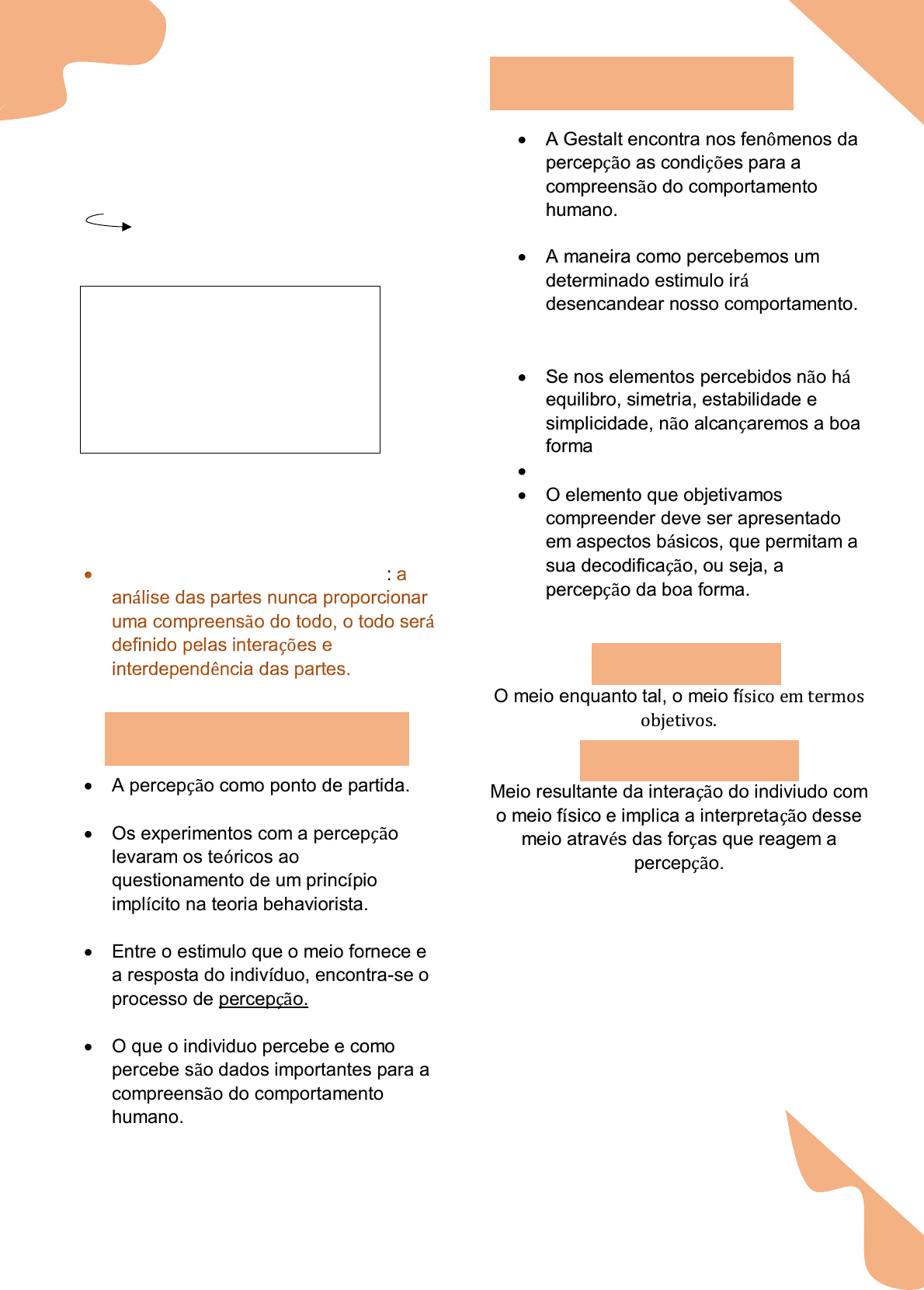 A psicologia da forma Termo alemão de difícil tradução Forma ou configuração Max Wertheimer, Wolfgang Kôhler, Kurt Koffka Postulava a necessidade de se compreender o homem como uma totalidade. Principio da abordagem gestálica: a análise das partes nunca proporcionar uma compreensão do todo, o todo será definido pelas interações e interdependência das partes. A percepção como ponto de partida. Os experimentos com a percepção levaram os teóricos ao questionamento de um princípio implícito na teoria behaviorista. Entre o estimulo que o meio fornece e a resposta do indivíduo, encontra-se o processo de percepção. O que o individuo percebe e como percebe são dados importantes para a compreensão do comportamento humano. A Gestalt encontra nos fenômenos da percepção as condições para a compreensão do comportamento humano. A maneira como percebemos um determinado estimulo irá desencandear nosso comportamento. Se nos elementos percebidos não há equilibro, simetria, estabilidade e simplicidade, não alcançaremos a boa forma O elemento que objetivamos compreender deve ser apresentado em aspectos básicos, que permitam a sua decodificação, ou seja, a percepção da boa forma. O meio enquanto tal, o meio físico em termos objetivos. Meio resultante da interação do indiviudo com o meio físico e implica a interpretação desse meio através das forças que reagem a percepção. Gestalt Baseados no estudos psicofísicos que relacionaram a forma e sua percepção, construíram a base de uma teoria eminentemente psicológica. Percepção A boa forma Meio geográfico Meio comportamental