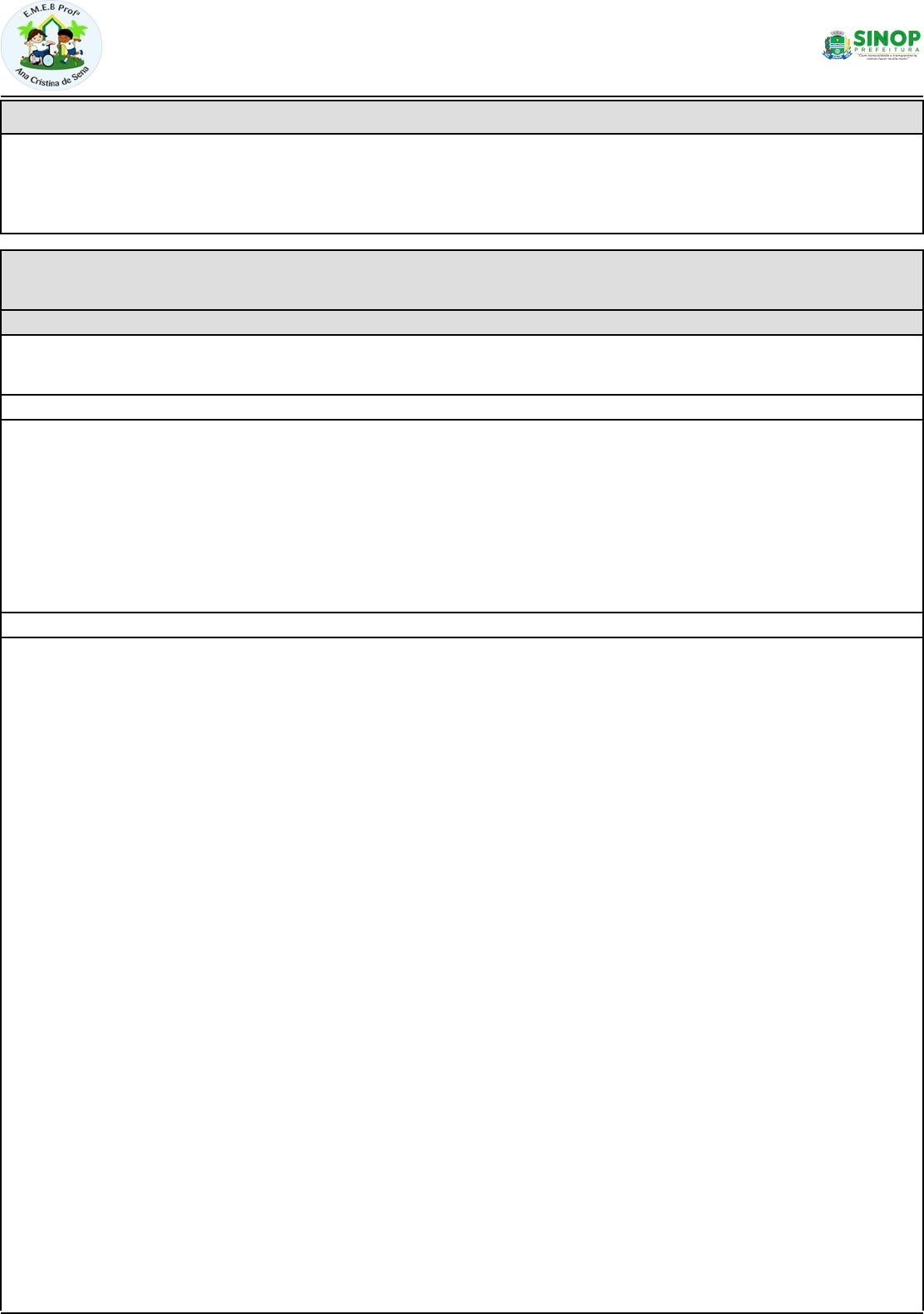 ESTADO DE MATO GROSSO PREFEITURA MUNICIPAL DE SINOP SECRETARIA MUNICIPAL DE EDUCAÇÃO ESPORTE E CULTURA RUA DOS CAMBARÁS 1942 JARDIM NOVO ESTADO 78553-703 ESCOLAANACRISTINADESENA@YAHOO.COM.BR PLANEJAMENTO DIÁRIO DE AULA - 2022 Escola: 001 - EMEB PROFESSORA ANA CRISTINA DE SENA Etapa: 001 - 1º ANO Turno: 02 - VESPERTINO (16/05/2022 à 27/05/2022)Período: Turma: 003 - 1º ANO E Professor: 080 - SUZANA MACHADO RODRIGUES Data-Aula: 16/05-1, 16/05-2, 17/05-1, 17/05-2, 17/05-3, 17/05-4, 18/05-1, 18/05-2, 18/05-3, 18/05-4, 19/05-1, 19/05-2, 19/05-3, 19/05-4, 20/05-1, 20/05-2, 20/05-3, 20/05-4, 23/05-1, 23/05-2, 24/05-1, 24/05-2, 24/05-3, 24/05-4, 25/05-1, 25/05- 2, 25/05-3, 25/05-4, 26/05-1, 26/05-2, 26/05-3, 26/05-4, 27/05-1, 27/05-2, 27/05-3, 27/05-4 Componentes: Língua Portuguesa | Arte | Matemática | Ciências | História | Geografia | Ensino Religioso Unidade temática: Terra e Universo; Vida e evolução; Artes visuais; Números; Álgebra; Geometria; Identidades e alteridades; Manifestações religiosas; Mundo pessoal: meu lugar no mundo; Mundo pessoal: eu, meu grupo social e meu tempo; O sujeito e seu lugar no mundo. Campo de atuação: Campo artístico-literário. Objeto de conhecimento: Escalas de tempo.; Corpo humano. Respeito à diversidade.; Contextos e práticas.; Materialidades.; Quantificação de elementos de uma coleção: estimativas, contagem um a um, pareamento ou outros agrupamentos e comparação.; Construção de fatos básicos da adição.; Padrões figurais e numéricos: investigação de regularidades ou padrões em sequências.; Localização de objetos e de pessoas no espaço, utilizando diversos pontos de referência e vocabulário apropriado.; Figuras geométricas planas: reconhecimento do formato das faces de figuras geométricas espaciais.; Protocolos de leitura.; Construção do sistema alfabético e da ortografia.; Conhecimento do alfabeto do português do Brasil.; Construção do sistema alfabético.; Imanência e transcendência.; Sentimentos, lembranças, memórias e saberes.; As diferentes formas de organização da família e da comunidade: os vínculos pessoais e as relações de amizade.; A escola, sua representação espacial, sua história e seu papel na comunidade.; Situações de convívio em diferentes lugares.. Práticas de linguagem: Leitura/escuta (compartilhada e autônoma); Análise linguística/semiótica (Alfabetização). Habilidades a serem Desenvolvidas: (EF01CI05) Identificar e nomear diferentes escalas de tempo: os períodos diários (manhã, tarde, noite) e a sucessão de dias, semanas, meses e anos. (EF01CI05.1MT) Identificar as estações do ano, compreendendo os fenômenos que alteram sua regularidade em Mato Grosso. (EF01CI03) Discutir as razões pelas quais os hábitos de higiene do corpo (lavar as mãos antes de comer, escovar os dentes, limpar os olhos, o nariz e as orelhas etc.) são necessários para a manutenção da saúde. (EF15AR01) Identificar e apreciar formas distintas das artes visuais tradicionais e contemporâneas, cultivando a percepção, o imaginário, a capacidade de simbolizar e o repertório imagético. (EF15AR04) Experimentar diferentes formas de expressão artística (desenho, pintura, colagem, quadrinhos, dobradura, escultura, modelagem, instalação, vídeo, fotografia, artesanato local, etc.), fazendo uso sustentável de materiais, instrumentos, recursos e técnicas convencionais e não convencionais. (EF01MA02) Contar de maneira exata ou aproximada, utilizando diferentes estratégias como o pareamento e outros agrupamentos. (EF01MA06) Construir fatos básicos da adição e utilizá-los em procedimentos de cálculo para resolver problemas. (EF01MA09) Organizar e ordenar objetos familiares ou representações por figuras, por meio de atributos, tais como cor, forma e medida. (EF01MA12) Descrever a localização de pessoas e de objetos no espaço segundo um dado ponto de referência, compreendendo que, para a utilização de termos que se referem à posição, como direita, esquerda, em cima, em baixo, é necessário explicitar-se o referencial. (EF01MA14) Identificar e nomear figuras planas (círculo, quadrado, retângulo e triângulo) em desenhos apresentados em diferentes disposições ou em contornos de faces de sólidos geométricos. (EF01LP01) Reconhecer que textos são lidos e escritos da esquerda para a direita e de cima para baixo da página. (EF01LP06) Segmentar oralmente palavras em sílabas. (EF01LP07) Identificar fonemas e sua representação por letras. (EF01LP08) Relacionar elementos sonoros (sílabas, fonemas, partes de palavras) com sua representação escrita. (EF01LP10) Nomear as letras do alfabeto e recitá-lo na ordem das letras. (EF01LP13) Comparar palavras, identificando semelhanças e diferenças entre sons de sílabas iniciais, mediais e finais. (EF01ER03) Reconhecer e respeitar as características físicas e subjetivas de cada um. (EF01ER06) Identificar as diferentes formas pelas quais as pessoas manifestam sentimentos, ideias, memórias, gostos e crenças em diferentes espaços. (EF01HI03) Descrever e distinguir os seus papéis e responsabilidades relacionados à família, à escola e à comunidade. EscolaNet: v.8.05.161148 Data/Hora: 16/05/2022 16:40:30www.omegaeducacional.comUsuário: 937.528.651-72 de 2Página: 1 ESTADO DE MATO GROSSO PREFEITURA MUNICIPAL DE SINOP SECRETARIA MUNICIPAL DE EDUCAÇÃO ESPORTE E CULTURA RUA DOS CAMBARÁS 1942 JARDIM NOVO ESTADO 78553-703 ESCOLAANACRISTINADESENA@YAHOO.COM.BR PLANEJAMENTO DIÁRIO DE AULA - 2022 Escola: 001 - EMEB PROFESSORA ANA CRISTINA DE SENA Etapa: 001 - 1º ANO Turno: 02 - VESPERTINO (16/05/2022 à 27/05/2022)Período: Turma: 003 - 1º ANO E Professor: 080 - SUZANA MACHADO RODRIGUES (EF01HI08) Reconhecer o significado das comemorações e festas escolares, diferenciando-as das datas festivas comemoradas no âmbito familiar ou da comunidade. (EF01GE03) Identificar e relatar semelhanças e diferenças de usos do espaço públi