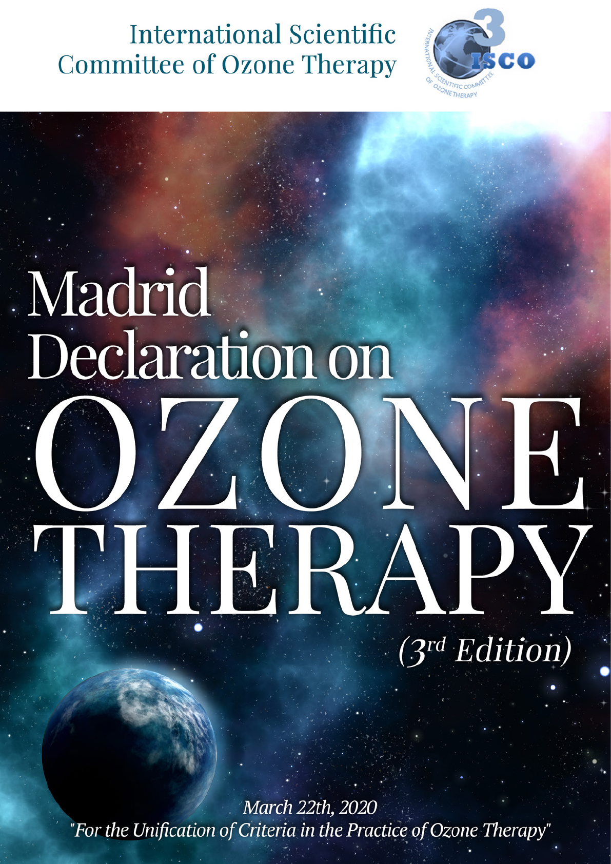 MADRID DECLARATION ON OZONE THERAPY (3rd edition) Official document of ISCO3 EDITION No. 01 ISSUE DATE: June 4th, 2010 EDITION No. 02 ISSUE DATE: June 12th, 2015 EDITION No. 03 ISSUE DATE: May 14th, 2020 Copyright (©) 2010, 2015, 2020. ISCO3 (International Scientific Committee of Ozone Therapy) Avenida Juan Andrés 60, local 1 bajo, 28035, Madrid (Spain). All rights reserved. www.isco3.org info@isco3.org Tel. + 34 91 351 51 75 / +34 669 685 429 ISBN: 978-84-09-19932-7 Statutory Deposit: M-11427-2020 Original language: English. Reviewers: Adriana Schwartz, M.D. Gregorio Martínez Sánchez, Pharm. Dr., Ph.D. Cum Laude. Roberto Quintero, Lawyer Revision of English style: Wayne McCarthy and other members of ISCO3. The only official version of the Madrid Declaration on Ozone Therapy (ISCO3, 3rd edition, 2020) is published in English. Graphic design: Clara Barrachina. Secretarial support: Olga Moreno. Layout and printed by Grafox Imprenta, S.L. (Spain). Official document of ISCO3 (3rd ed., 2020) “For the Unification of Criteria in the Practice of Ozone Therapy” International Scientific Committee of Ozone Therapy 1st edition: Approved at the “International Meeting of Ozone Therapy Schools” held at the Royal National Academy of Medicine in Madrid on June 4th, 2010, under the auspices of AEPROMO (Spanish Association of Medical Professionals in Ozone Therapy). 2nd edition with updates and addendum on Dentistry: Approved by ISCO3 on May 10th, 2015 and officially presented at the “International Meeting of the Madrid Declaration on Ozone Therapy (2nd ed.)” held at the Spanish Royal National Academy of Medicine in Madrid on June 12th, 2015, under the auspices of ISCO3 (International Scientific Committee of Ozone Therapy) and the administrative and logistical support of AEPROMO (Spanish Association of Medical Professionals in Ozone Therapy). 3rd edition with updates and addendums on Dentistry and Veterinary Medicine: Approved by ISCO3 (International Scientific Committee of Ozone Therapy) on March 22th, 2020. Suggestion on how to cite this paper ISCO3 (2020) Madrid Declaration on Ozone Therapy, 3rd ed. Madrid. www.isco3.org. International Scientific Committee of Ozone Therapy. • 4 • Madrid Declaration on Ozone Therapy (3rd edition, 2020) MADRID DECLARATION ON OZONE THERAPY 3rd EDITION, 2020 Official document of ISCO3 Authors of the Declaration (members of ISCO3) 1. Adriana Schwartz, M.D. 2. Gregorio Martínez Sánchez, Pharm. Dr., Ph.D Cum Laude. 3. Fadi Sabbah. DDS. Addendum A. Applications of Ozone in Dentistry. 4. Mercedes Hernández Avilés. D.V.M. Addendum B. Applications of Ozone in Veterinary Medicine. The Declaration was approved by the members of ISCO3 on March 22, 2020. Carmen Helena Acevedo, M.D. Froylán Alvarado Güémez, M.D. Dario Apuzzo, M.D. Robert Banner, M.D. Mauricio Carreño Peñaranda, M.D. Jaime Ulises Cachay Agurto, M.D. Francisco Ubiratan Ferreira de Campos, D.D.S. Bernardino Clavo, M.D. Ph.D. Cum Laude. Valerie Davis, M.D. Michael K. Gossweiler, D.D.S. Ana Gutiérrez Gossweiler, D.D.S. Mercedes Hernández Avilés, D.V.M. Suzanne Humphries, M.D. Gerardo Ibáñez Sánchez, D.V.M. Heinz Konrad, M.D. Víctor Leonel Llacsa Saravia, M.D. Kevin Logan, M.D. Gregorio Martínez Sánchez, Pharm. D., Ph.D. Cum Laude. Wayne McCarthy, N.D. Miguel Ángel Montoya Díaz, M.D., Ph.D. Carlos Goes Nogales, DDS., Ph.D. Sergey Peretyagin, M.D. Miriam Portero Fuentes, D.V.M., Ph.D. Cum Laude. Fadi Sabbah. D.D.S. Adriana Schwartz, M.D. Magda Siqueira, D.D.S. Roberto Siqueira, D.V.M. Roberto Quintero, Lawyer. Dr. Political Science. Expert, International Relations. Legal Adviser of ISCO3 (No ISCO3 member). • 5 • Madrid Declaration on Ozone Therapy (3rd edition, 2020) For the Unification of Criteria in the Practice of Ozone Therapy The updating process of the 3rd edition of the Madrid Declaration took nearly one year. Since July 2019 ISCO3 issued several international calls asking ozone therapists to send their proposals and suggestions for the updating of the Madrid Declaration on Ozone Therapy. Last day to receive proposals: November 30, 2019. Based on the proposals received the authors wrote different drafts until agreeing on the text. Then it was submitted for discussion among the ISCO3 members. After an intensive exchange of comments, suggestions, and revisions, finally, the 27 members of ISCO3 unanimously approved the 3rd edition of the Declaration on March 22, 2020 and it became an official document of the committee. ISCO3 wants to thank all those who participated and/or supported the committee in the challenging efforts of updating the Declaration. WHO IS ISCO3? ISCO3 is a scientific non-profit association founded in 2010 and its activities are governed by the Spanish legislation. ISCO3 is an independent scientific medical body from national and international associations or federations of ozone therapy; and commercial companies. As a consequence, its twenty- seven members do not represent any or various national or international ozone therapy associations, or commercial companies. Its members act within ISCO3 only in their own capacity. ISCO3 has been created with the clear intention that it has to turn into an international scientific authority due to the composition of its members; and that its recommendations may become a source of reference to all those who practice this medical therapy. The members are elected every five years. ISCO3 issued an international call at the beginning of July 2019 asking health professionals from any place, directly related to the practice of ozone therapy, to apply. The deadline set was October 31, 2019. Based on the applications received the current members have been elected for the five years period that stared on January 1, 2020 and will end on December 31, 2024. The new members elected the Governing Board of the committee integrated by the President, the Vice President, and the Scientific Secretary. Main Objectives of ISCO3 To determine 