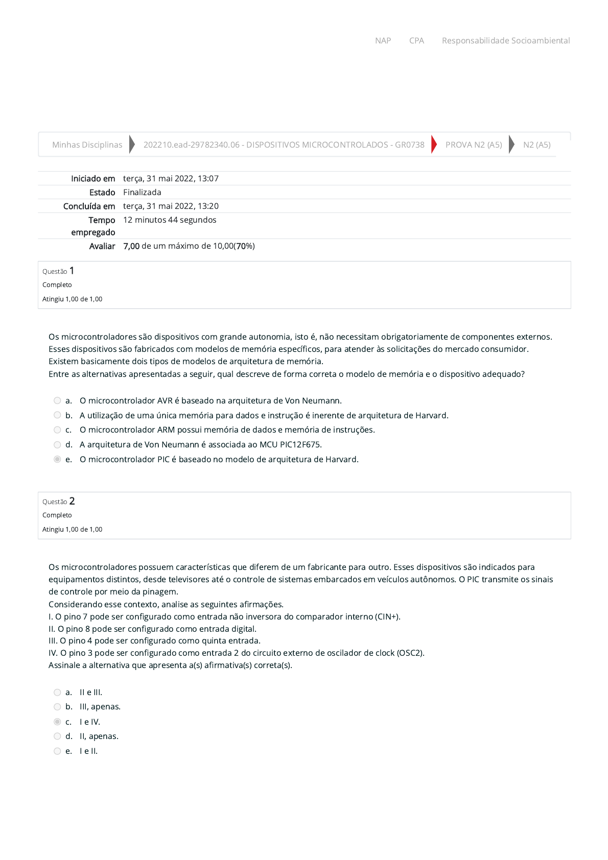 31/05/2022 14:01 N2 (A5): Revisão da tentativa https://ambienteacademico.com.br/mod/quiz/review.php?attempt=581366&cmid=160046 1/5 Minhas Disciplinas 202210.ead-29782340.06 - DISPOSITIVOS MICROCONTROLADOS - GR0738 PROVA N2 (A5) N2 (A5) Iniciado em terça, 31 mai 2022, 13:07 Estado Finalizada Concluída em terça, 31 mai 2022, 13:20 Tempo empregado 12 minutos 44 segundos Avaliar 7,00 de um máximo de 10,00(70%) Questão 1 Completo Atingiu 1,00 de 1,00 Questão 2 Completo Atingiu 1,00 de 1,00 Os microcontroladores são dispositivos com grande autonomia, isto é, não necessitam obrigatoriamente de componentes externos. Esses dispositivos são fabricados com modelos de memória especí�cos, para atender às solicitações do mercado consumidor. Existem basicamente dois tipos de modelos de arquitetura de memória. Entre as alternativas apresentadas a seguir, qual descreve de forma correta o modelo de memória e o dispositivo adequado? a. O microcontrolador AVR é baseado na arquitetura de Von Neumann. b. A utilização de uma única memória para dados e instrução é inerente de arquitetura de Harvard. c. O microcontrolador ARM possui memória de dados e memória de instruções. d. A arquitetura de Von Neumann é associada ao MCU PIC12F675. e. O microcontrolador PIC é baseado no modelo de arquitetura de Harvard. Os microcontroladores possuem características que diferem de um fabricante para outro. Esses dispositivos são indicados para equipamentos distintos, desde televisores até o controle de sistemas embarcados em veículos autônomos. O PIC transmite os sinais de controle por meio da pinagem. Considerando esse contexto, analise as seguintes a�rmações. I. O pino 7 pode ser con�gurado como entrada não inversora do comparador interno (CIN+). II. O pino 8 pode ser con�gurado como entrada digital. III. O pino 4 pode ser con�gurado como quinta entrada. IV. O pino 3 pode ser con�gurado como entrada 2 do circuito externo de oscilador de clock (OSC2). Assinale a alternativa que apresenta a(s) a�rmativa(s) correta(s). a. II e III. b. III, apenas. c. I e IV. d. II, apenas. e. I e II. NAP CPA Responsabilidade Socioambiental https://ambienteacademico.com.br/my/ https://ambienteacademico.com.br/course/view.php?id=6162 https://ambienteacademico.com.br/course/view.php?id=6162§ion=6 https://ambienteacademico.com.br/mod/quiz/view.php?id=160046 https://codely-fmu-content.s3.amazonaws.com/Moodle/NAP/inicial/nap/fmu/index.html https://codely-fmu-content.s3.amazonaws.com/Moodle/CPA/landing_CPA/index.html https://portal.fmu.br/sustentabilidade 31/05/2022 14:01 N2 (A5): Revisão da tentativa https://ambienteacademico.com.br/mod/quiz/review.php?attempt=581366&cmid=160046 2/5 Questão 3 Completo Atingiu 1,00 de 1,00 Questão 4 Completo Atingiu 1,00 de 1,00 As informações podem ser representadas eletronicamente nas formas digital e analógica. Podemos fazer a representação desses sinais por meio de uma onda senoidal para representar os sinais analógicos e uma onda quadrada para representar o sinal digital. Cada um desses sinais possui características próprias que devem ser consideradas para estudo ou pesquisa. Dados os itens a seguir, classi�que-os como sinal A (analógico) ou como D (digital). I. ( ) Onda criada por meio do processo da amostragem. II. ( ) Onda criada a partir de sinais do ambiente. III. ( ) Após a conversão, as informações formam uma onda quadrada. IV. ( ) Onda que representa períodos com valores in�nitos. V. ( ) Onda que representa valores discretos. Agora, escolha a alternativa que apresenta a sequência correta de respostas. a. D, A, D, A, D. b. D, A, A, D, D. c. D, D, D, A, A. d. A, A, D, A, D. e. A, D, A, D, D. O cotidiano das pessoas tem sido modi�cado com o avanço da interação com o mundo digital. Isso acontece devido ao crescimento na utilização dos equipamentos portáteis, microcontrolados que são capazes de conectar as pessoas com a internet. Esses dispositivos podem captar informações da natureza e encaminhar via rede mundial. Entre as alternativas apresentadas a seguir, qual descreve melhor a utilização de conversores A/D – D/A? a. As informações analógicas não podem ser convertidas novamente em digitais. b. As informações digitais provenientes da natureza não necessitam conversão. c. Algumas informações da natureza são produzidas no formato digital. d. As informações analógicas são obtidas por meio da amostragem. e. As informações da natureza captadas no formato analógicos são convertidas para digital. NAP CPA Responsabilidade Socioambiental https://codely-fmu-content.s3.amazonaws.com/Moodle/NAP/inicial/nap/fmu/index.html https://codely-fmu-content.s3.amazonaws.com/Moodle/CPA/landing_CPA/index.html https://portal.fmu.br/sustentabilidade 31/05/2022 14:01 N2 (A5): Revisão da tentativa https://ambienteacademico.com.br/mod/quiz/review.php?attempt=581366&cmid=160046 3/5 Questão 5 Completo Atingiu 1,00 de 1,00 Questão 6 Completo Atingiu 0,00 de 1,00 Os primeiros processadores desenvolvidos no século XX foram baseados na arquitetura de Von Neumann e apresentaram desempenho satisfatório, sendo utilizados até os dias de hoje. Posteriormente, foi desenvolvida a arquitetura de Harvard que apresentou certos benefícios, tornando o processamento mais rápido. De acordo com essas arquiteturas, foram desenvolvidos (1) microprocessadores diversos; (2) microcontroladores intel 8051; (3) microcontroladores Microchip PIC, entre outros. Analise cada conjunto de informações e assinale a segunda coluna de acordo com a primeira. (A) Referente à microprocessadores. (B) Referente à microcontroladores Intel 8051. (C) Referente à microcontroladores PIC. (D) Não se trata de microcontroladores ou microprocessadores. ( ) Microcomputadores utilizados em praticamente todos os ramos de atividades. ( ) Dispositivo com autonomia de componentes com arquitetura CISC. ( ) Dispositivo embarcado com arquitetura RISC. ( ) Componente que te
