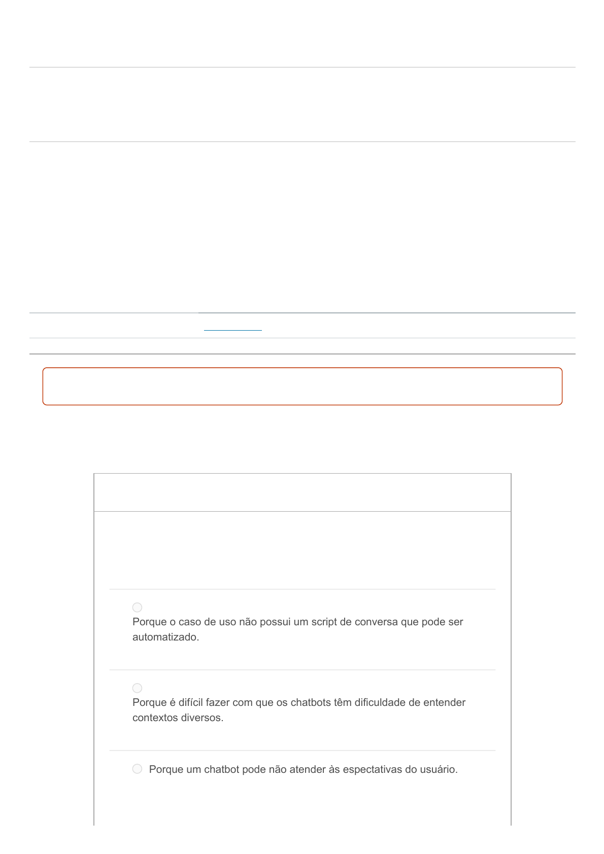 29/05/2022 21:48 Quiz 10 - Chatbots: Introdução aos Sistemas Inteligentes - Turma 1 (4215100) - 2022/1 https://pucminas.instructure.com/courses/88213/quizzes/282056 1/4 Quiz 10 - Chatbots Entrega 29 mai em 23:59 Pontos 1 Perguntas 4 Disponível 23 mai em 23:59 - 29 mai em 23:59 6 dias Limite de tempo Nenhum Instruções Histórico de tentativas Tentativa Tempo Pontuação MAIS RECENTE Tentativa 1 26 minutos 1 de 1 As respostas corretas estarão disponíveis de 30 mai em 23:59 a 19 jun em 23:59. Pontuação deste teste: 1 de 1 Enviado 29 mai em 21:48 Esta tentativa levou 26 minutos. Este quiz aborda a construção de chatbots e o design conversacional. 0,25 / 0,25 ptsPergunta 1 Porque podemos dizer que o design de chatbots envolve aspectos éticos que devem ser considerados? Porque o caso de uso não possui um script de conversa que pode ser automatizado. Porque é difícil fazer com que os chatbots têm dificuldade de entender contextos diversos. Porque um chatbot pode não atender às espectativas do usuário. https://pucminas.instructure.com/courses/88213/quizzes/282056/history?version=1 29/05/2022 21:48 Quiz 10 - Chatbots: Introdução aos Sistemas Inteligentes - Turma 1 (4215100) - 2022/1 https://pucminas.instructure.com/courses/88213/quizzes/282056 2/4 Porque um chatbot que diz a coisa errada pode causar danos psicológicos. Todas as afirmativas representam preocupações reais sobre chatbots, mas um aspecto ético que deve ser considerado é o uso de chatbots com pessoas vulneráveis. Um chatbot que diz a coisa errada na hora errada pode afetar as pessoas. 0,25 / 0,25 ptsPergunta 2 São fatores de sucesso para a implementação de um chatbot, EXCETO: Quando o chatbot perdoa erros e deslizes do usuário para produzir um diálogo suave. Solicitação do cliente é focada em uma única necessidade concreta. Quando o chatbot utiliza um vocabulário mais técnico e distante com o objetivo de eliminar a ambiguidade. Quando o cliente se expressa com o correto nível de abstração, utilizando o termo adequado à sua necessidade. 29/05/2022 21:48 Quiz 10 - Chatbots: Introdução aos Sistemas Inteligentes - Turma 1 (4215100) - 2022/1 https://pucminas.instructure.com/courses/88213/quizzes/282056 3/4 A resposta que NÃO representa um fator de sucesso/fracasso de um chatbot é a utilização de vocabulário técnico para eliminar ambiguidade. Existem dois problemas nessa afirmativa. Primeiramente, o vocabulário deve ser o mais próximo possível do usuário. Se o chatbot utilizar um vocabulário técnico, o usuário não saberá como se expressar com o chatbot. Outro problema da afirmação se refere à eliminação da ambiguidade. A ambiguidade não pode ser completamente eliminada, mas apenas reduzida, uma vez que a linguagem natural é dependente de contexto e inerentemente ambígua. 0,25 / 0,25 ptsPergunta 3 Associe o tipo de chatbot à sua descrição correspondente. Menu/button chatbots uncionam como se fos Keyword recognition chatbots conseguem capturar o Chatbots contextuais utilizam aprendizado d Support chatbot são especialistas em u 0,25 / 0,25 ptsPergunta 4 Uma intenção é uma ideia que o usuário deseja transmitir, enquanto uma entidade permite identificar o assunto de que trata a mensagem. Verdadeiro 29/05/2022 21:48 Quiz 10 - Chatbots: Introdução aos Sistemas Inteligentes - Turma 1 (4215100) - 2022/1 https://pucminas.instructure.com/courses/88213/quizzes/282056 4/4 Referência direta do conteúdo. Falso Pontuação do teste: 1 de 1