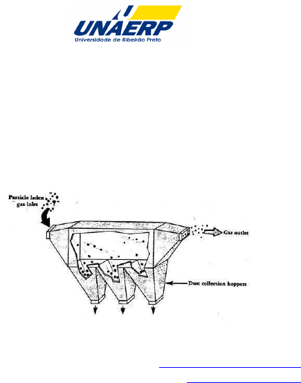 UNIVERSIDADE DE RIBEIRÃO PRETO – UNAERP CENTRO DE CIÊNCIAS EXATAS, NATURAIS E DE TECNOLOGIA CURSO DE ENGENHARIA QUÍMICA Engenharia do Meio Ambiente Apostila Teórica 3 Sedimentadores gravitacionais (Settling chambers) Prof. Dr. Murilo Daniel de Mello Innocentini http://lattes.cnpq.br/5681181471077426 muriloinnocentini@yahoo.com.br Ribeirão Preto – SP Agosto de 2015 52 Engenharia Meio Ambiente – UNAERP - Prof. Dr. Murilo D.M. Innocentini SUMÁRIO 3.1. INTRODUÇÃO 53 3.2. EQUACIONAMENTO 54 3.2.1. Regime de Escoamento Laminar 56 3.2.2. Regime de Escoamento Turbulento 57 3.2.2.1. Mistura Lateral Completa 58 3.2.2.2. Mistura Lateral e Longitudinal Completa 58 3.3. DETERMINAÇÃO DA EFICIÊNCIA DE COLETA GLOBAL DO SEDIMENTADOR 59 3.4. EXEMPLOS 60 3.5. LISTA DE EXERCÍCIOS 62 53 Engenharia Meio Ambiente – UNAERP - Prof. Dr. Murilo D.M. Innocentini 3.1. INTRODUÇÃO O método mais antigo de separação de partículas e gotículas de uma corrente gasosa é a sedimentação livre baseada no peso próprio. A indústria metalúrgica, a indústria do enxofre e a do arsênico sempre utilizaram esse método, que se aplica bem para partículas grosseiras. As câmaras gravitacionais são simples expansões do duto por onde escoa a corrente gasosa. Consistem essencialmente em uma câmara, em geral metálica, de dimensões grandes relativamente às do duto que nela introduz a suspensão gasosa de partículas (aerossol) (Figura 3.1). Se a seção transversal da câmara for suficientemente grande, a velocidade do gás será pequena e as forças gravitacionais que agem sobre as partículas superam as cinéticas, o que acarreta a deposição das partículas grandes (em geral, acima de 50 m). Para que partículas menores sejam coletadas, é preciso que as dimensões da câmara sejam muito grandes, o que acaba tornando sua operação não econômica. Figura 3.1. Detalhes esquemáticos de sedimentadores gravitacionais. O gás entra por um difusor que uniformiza a velocidade no interior da câmara e sai por um duto na extremidade oposta. A velocidade do gás na câmara deve ser pequena para evitar a re-dispersão de partículas, havendo recomendações para mantê-la entre 0,02 e 0,6 m/s. O funcionamento da câmara 54 Engenharia Meio Ambiente – UNAERP - Prof. Dr. Murilo D.M. Innocentini pode ser melhorado pela inclusão de chicanas ou telas, o que permite aumentar a velocidade. O sólido é recolhido em funis no fundo da câmara. A perda de carga através de uma câmara gravitacional é baixa, e em geral, não representa um acréscimo representativo à perda de carga total do sistema. Essa perda de carga, que se deve à perda de velocidade na entrada da câmara e à contração na saída, geralmente está entre 1,5 e 2 vezes a pressão de velocidade correspondente à velocidade no duto de saída. 3.2. EQUACIONAMENTO Figura 3.2. Esquematização das dimensões de projeto de um sedimentador gravitacional com especificação das 3 principais dimensões: L = comprimento, W = largura e H = altura. O dimensionamento de um sedimentador é baseado na velocidade terminal da partícula suspensa na corrente gasosa e no regime de escoamento no interior do sedimentador. O regime de escoamento no sedimentador pode ser laminar ou turbulento, dependendo do número de Reynolds, definido como: D U Re gás hgás sed (3.1) na qual U é a velocidade média do gás no sedimentador (m/s), calculada por: 55 Engenharia Meio Ambiente – UNAERP - Prof. Dr. Murilo D.M. Innocentini WH Q U m (3.2) A viscosidade (gás) e a densidade (gás) podem ser calculadas na temperatura e pressão médias do gás pelas equações da Tabela 2.4: )273T(R MMP m gm gás (2.24) C273T C273 273 273 T nm n 1,5 m ogás (2.25) 2 TT T SEm (2.26) 2 PP P SEm (2.27) Os valores de massa molar (MMg), o R, e Cn são dados na Tabela 2.4 conforme características do gás. Por outro lado, para efeito de dimensionamento, a vazão volumétrica da corrente gasosa deve ser calculada na temperatura média entre a entrada e saída do sedimentador: m E E m Em P P T T QQ (2.28) O diâmetro hidráulico (Dh) é calculado por: molhado perímetro escoamento área 4 Dh HW 2WH Dh (3.3) 56 Engenharia Meio Ambiente – UNAERP - Prof. Dr. Murilo D.M. Innocentini De (3.2) e (3.3) em (3.1): )HW( Q2 Re gás mgás sed (3.4) Assim: Resed < 2300 Regime Laminar Resed > 2300 Regime turbulento 3.2.1. Regime de Escoamento Laminar No escoamento laminar, não há mistura, e as partículas depositam-se por toda a seção transversal do sedimentador. A componente horizontal da velocidade da partícula é constante e igual à velocidade do ar, enquanto a componente vertical é igual à sua velocidade terminal. A trajetória da partícula irá depender da composição das 2 velocidades. O comprimento do sedimentador (L) está associado à eficiência de coleta da partícula. Assim, quanto maior L, maior a probabilidade de a partícula depositar-se no sedimentador, aumentando a sua eficiência de coleta. Pelo balanço de massa no sedimentador para uma partícula com diâmetro dpi (Figura 3.3). Figura 3.3. Esquematização de sedimentador para balanço de massa em escoamento laminar. 57 Engenharia Meio Ambiente – UNAERP - Prof. Dr. Murilo D.M. Innocentini QC W EEiEi (3.5) AvC W coletatiEiRi WLvC W tiEiRi (3.6) Pela definição de eficiência de coleta fracionária (i): d com entra que pó de vazão d com retido pó de vazão pi pi i W W Ei Ri i (3.7) de (3.5) e (3.6) em (3.7): Q WLv m ti i (3.8) A velocidade terminal da partícula (vti) é obtida na Apostila 1 pelas Equações (1.21, 1.23 e 1.24). Para o caso em que a eficiência i seja definida, então o comprimento L do sedimentador necessário para atingir essa eficiência é obtido por: Wv Q L ti im (3.9) 3.2.2. Regime de Escoamento Turbulento No regime turbulento (Resed > 2300), a mistura do gás evita a sedimentação de partículas, exceto para uma fina camada laminar no fundo da câmara. A eficiência de separação é governada pela 