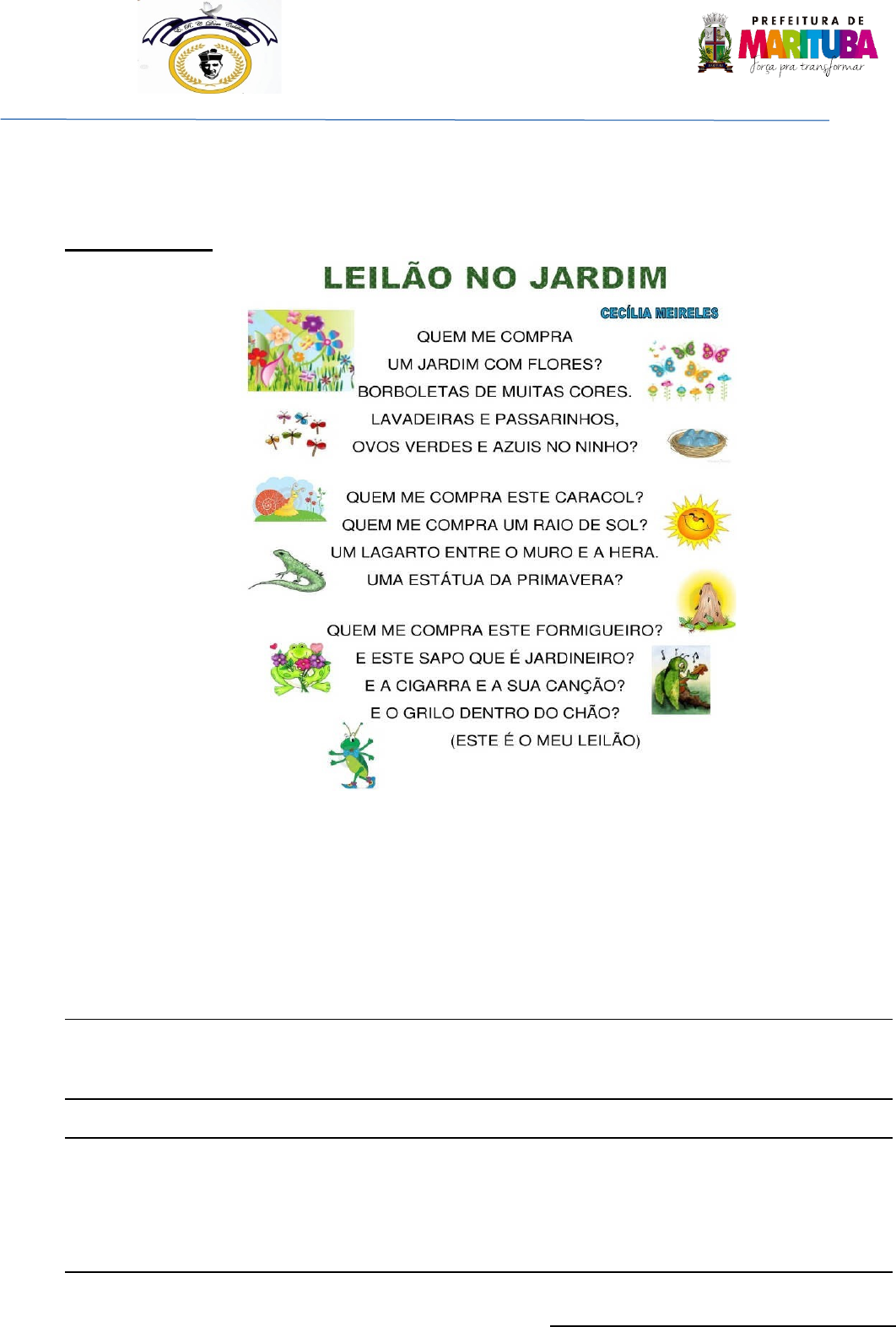LÍNGUA PORTUGUESA - MATEMÁTICA - CIÊNCIAS ATIVIDADE 1 - LEIA O POEMA ABAIXO E REPONDA AS QUESTÕES: A) A autora fala de leilão, neste leilão ela quer comprar: ( ) um carro ( ) um jardim ( ) uma casa B) Quem é a autora deste poema? C) Que animais têm no jardim? Escreva-os abaixo: D) No texto há um animal que tem uma profissão. Qual é o animal e que profissão ele tem? E) Quantas letras há no título do poema? ATIVIDADE 2 - LEIA E COMPLETE AS PALAVRAS COM AS LETRAS QUE ESTÃO FALTANDO: ( RR – L – O – NH – SS – G – I – R – O – RA ) ( JA DIM F ORES LEILÃ PA ARINHO GR L NI O FORMI UEIRO CA COL CIGA A ) ( ENCONTRO CONSONANTAL: É O ENCONTRO DE DUAS OU MAIS CONSOANTES NA MESMA PALAVRA. ) EXEMPLOS DE ENCONTRO CONSONANTAL: GRILO= GRI - LO FLORES= FLO - RES ATIVIDADE 3 - COPIE DO POEMA, TRÊS PALAVRAS COM ENCONTRO CONSONANTAL: ( ENCONTRO VOCÁLICO: É QUANDO DUAS OU MAIS VOGAIS SE ENCONTRAM NA MESMA PALAVRA. ) EXEMPLO DE ENCONTRO VOCÁLICO: CAIXA = CAI – XA LEITE = LEI – TE COICE = COI - CE ATIVIDADE 4 - COPIE DO POEMA, TRÊS PALAVRAS COM ENCONTRO VOCÁLICO: Secretaria Municipal de Educação EMEF Dom Calábria Diretora: Maria José Ferreira Coordenadora: Zilma Sousa Profº Edinaldo Silva Turma: 2ª Etapa- EJA CLASSIFICAÇÃO DAS PALAVRAS QUANTO AO NÚMERO DE SÍLABAS ( A CLASSIFICAÇÃO DAS PALAVRAS QUANTO AO NÚMERO DE SÍLABAS, É O NOME QUE A PALAVRA RECEBE POR CAUSA DA QUANTIDADE DE SÍLABAS QUE ELA POSSUI. AS PALAVRAS PODEM SER: MONOSSÍLABA DISSÍLABA TRISSÍLABA • POLISSÍLABA ) LEIA PAUSADAMENTE A PALAVRA FAÇO: FA - ÇO. VOCÊ PERCEBERÁ QUE ELA POSSUI DUAS SÍLABAS. AGORA LEIA A PALAVRA JANELA. VOCÊ PERCEBERÁ QUE ELA POSSUI TRÊS SÍLABAS: SÍLABA, É O SOM QUE PRONUNCIAMOS DE UMA SÓ VEZ AO FALAR A PALAVRA. AS PALAVRAS PODEM TER UMA SÍLABA, DUAS, TRÊS, QUATRO OU ATÉ MAIS DE QUATRO SÍLABAS, RECEBENDO UM NOME PARA CADA UMA DESSAS CLASSIFICAÇÕES. MONOSSÍLABAS: SÃO PALAVRAS QUE APRESENTAM SOMENTE UMA SÍLABA. EXEMPLOS: MEU, CHÁ, OI, JÁ, DISSÍLABAS: SÃO PALAVRAS QUE APRESENTAM DUAS SÍLABAS. EXEMPLOS: CASA - CAFÉ - ALÔ TRISSÍLABAS: SÃO PALAVRAS QUE APRESENTAM TRÊS SÍLABAS. EXEMPLOS: VERGONHA JACARÉ - BONITO POLISSÍLABAS: SÃO PALAVRAS QUE APRESENTAM QUATRO OU MAIS SÍLABAS. EXEMPLOS: ANÔNIMO - APARTAMENTO - GAROTADA ATIVIDADE 5 - COPIE DO POEMA 3 PALAVRAS COM: Comment by Emily Papelaria: UMA SÍLABA – MONOSSÍLABA DUAS SÍLABAS – DISSÍLABAS TRÊS SÍLABAS – TRISSÍLABAS QUATRO OU MAIS SÍLABAS – POLISSÍLABAS ATIVIDADE 6 - ESCOLHA DOIS ANIMAIS DO POEMA E FORME DUAS FRASES. ATIVIDADE 7 - COMPLETE O QUADRO DE 2 EM 2 ATÉ CHEGAR EM 54: A) PINTE DE VERMELHO OS NÚMEROS PARES E ESCOLHA 3 DELES PARA ESCREVER POR EXTENSO: ATIVIDADE 8 - COPIE DO RETÂNGULO OS ÚLTIMOS 2 NÚMEROS E DECOMPONHA NO QUANDO VALOR DE LUGAR. SIGA O EXEMPLO E CONTINUE: D DEZENA U UNIDADE DECOMPOSIÇÃO 46= 4 6 4 DEZENAS = 40 6 UNIDADES = 6 46 D DEZENA U UNIDADE DECOMPOSIÇÃO 38 D DEZENA U UNIDADE DECOMPOSIÇÃO 58 ATIVIDADE 9 - CIRCULE GRUPOS DE 10 EM 10 QUESTÕES A SEGUIR: A) QUANTOS GRUPOS VOCÊ FORMOU? E RESPONDA AS B) QUANTOS PASSARINHOS SOBRARAM? C) TOTAL DE PASSARINHOS QUE FORAM AGRUPADOS? D) AGORA SOME 3 GRUPOS E ESCREVA AQUI A QUANTIDADE: VOCÊ TAMBÉM PODE FAZER A LEITURA O TEXTO: SAPO BOCARRÃO – EU SOU O SAPO BOCARRÃO E COMO MOSCAS! DISSE O SAPO BOCARRÃO ESPICHANDO A LÍNGUA COMPRIDA E GRUDENTA. ( A )E LÁ SE FOI O S PO DANDO SEUS PULINHOS. DE REPENTE ELE ( S ) ( M )DEU DE CARA COM UM PASSARINHO AZUL. – EU SOU O APO BOCARRÃO E COMO OSCAS! DISSE O SAPO BOCARRÃO. · E VOCÊ, PASSARINHO, COME O QUÊ? · COMO MINHOCAS TORCIDAS, COMO LESMAS... RESPONDEU ELE, FECHANDO O BICO PONTUDO NUM ESTALO. EM SEGUIDA O SAPO BOCARRÃO ENCONTROU UM RATO CASTANHO E PELUDO. – EU SOU O SAPO BOCARRÃO E COMO MOSCAS! DISSE O SAPO BOCARRÃO. · E VOCÊ, AMIGO RATO, COME O QUÊ? – COMO SEMENTES CROCANTES, FRUTINHAS COM MUITO SUCO! DISSE O RATO, BALANÇANDO OS BIGODES. O SAPO BOCARRÃO AINDA ESTAVA PEGANDO MOSCAS QUANDO APARECEU UM ENORME CROCODILO VERDE. · EU SOU O SAPO BOCARRÃO E COMO MOSCAS! DISSE O SAPO BOCARRÃO. · E VOCÊ, CROCODILO, COME O QUÊ? · COMO SAPOS GOSTOSOS DE BOCA BEM GRANDE, RESPONDEU O CROCODILO, MOSTRANDO OS DENTES BRANCOS PONTUDOS.O SAPO BOCARRÃO PAROU DE PEGAR MOSCAS E ARREGALOU OS OLHOS. DEPOIS FEZ UM BIQUINHO E ENCOLHEU A BOCA O MAIS QUE PÔDE. · AHHHH! UMA COISA TÃO DIFÍCIL DE ENCONTRAR, NÃO É MESMO? DISSE O SAPO, E PULOU NO LAGO FAZENDO ...SPLASH! AUTOR: KEITH FAULKNER VOCÊ PERCEBEU QUE NESTA HISTÓRIA OS ANIMAIS CONVERSAM BASTANTE? ENTÃO PRESTE ATENÇÃO: ( NA ESCRITA PARA REPRESENTAR A FALA ENTRE OS PERSONAGENS, USAMOS O SINAL DE (–) TRAVESSÃO PARA MARCAR O INÍCIO DA FALA. O SINAL DE (?) INTERROGAÇÃO É USADO NO FINAL DE PERGUNTA E O PONTO DE EXCLAMAÇÃO, QUE EXPRESSA ADMIRAÇÃO, ESPANTO, ALEGRIA... ASSISTA AO VÍDEO QUE TRAZ MAIS INFORMAÇÕES SOBRE O USO DOS SINAIS. https ://youtu.be/bHuWIkiAnzQ ) ATIVIDADE 11 – COM BASE NAS INFORMAÇÕES, RESOLVA AS QUESTÕES: A) ESCREVA ABAIXO UMA FRASE DA HISTÓRIA QUE REPRESENTA UMA PERGUNTA: B) COPIE UMA FRASE DA HISTÓRIA QUE REPRESENTA A FALA DE UM ANIMAL: A) PINTE DE VERMELHO NA HISTÓRIA O QUE O SAPO FALA SEMPRE QUE ENCONTRA UM ANIMAL. ATIVIDADE 12 - PINTE A PALAVRA DE CADA IMAGEM QUE ESTÁ ESCRITA CORRETAMENTE. BOCARÃO PASSARINHO FUTINHA BOCÃO PASARINHO FRUTINHAS BOCARRÃO PAÇARINHO FUTRINHAS ATIVIDADE 13 - ESCREVA ABAIXO O NOME DOS ANIMAIS QUE APARECEM NO TEXTO E SEPARE OS NOMES EM SÍLABAS E ESCREVA SE A PALAVRA É MONOSSÍLABA, DISSÍLABA, TRISSÍLABA OU POLISSÍLABA. SIGA O MODELO: PALAVRA SEPARAÇÃO CLASSIFICAÇÃO PASSARINHO PAS - SA – RI - NHO POLISSÍLABA ATIVIDADE 14 – OS ANIMAIS DO TEXTO DO SAPO BOCARRÃO ESTÃO COM ALGUNS PROBLEMAS. VAMOS AJUDÁ-LOS RESOLVER? PARA ISSO VOCÊ DEVE SEGUIR O EXEMPLO: O CROCODILO RASTEJOU 30 METROS NUM DIA E 25 METROS NO OUTRO. QUANTOS METROS ELE RASTEJOU NOS DOIS DIAS? SENTENÇA MATEMÁTICA CÁLCULO 30 + 25 = 55 D 3 