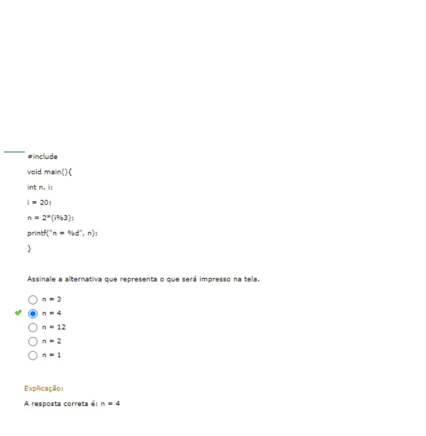 INTRODUÇÃO À PROGRAMAÇÃO ESTRUTURADA EM C Observe o trecho do código em C a seguir. Não esqueça que o operador