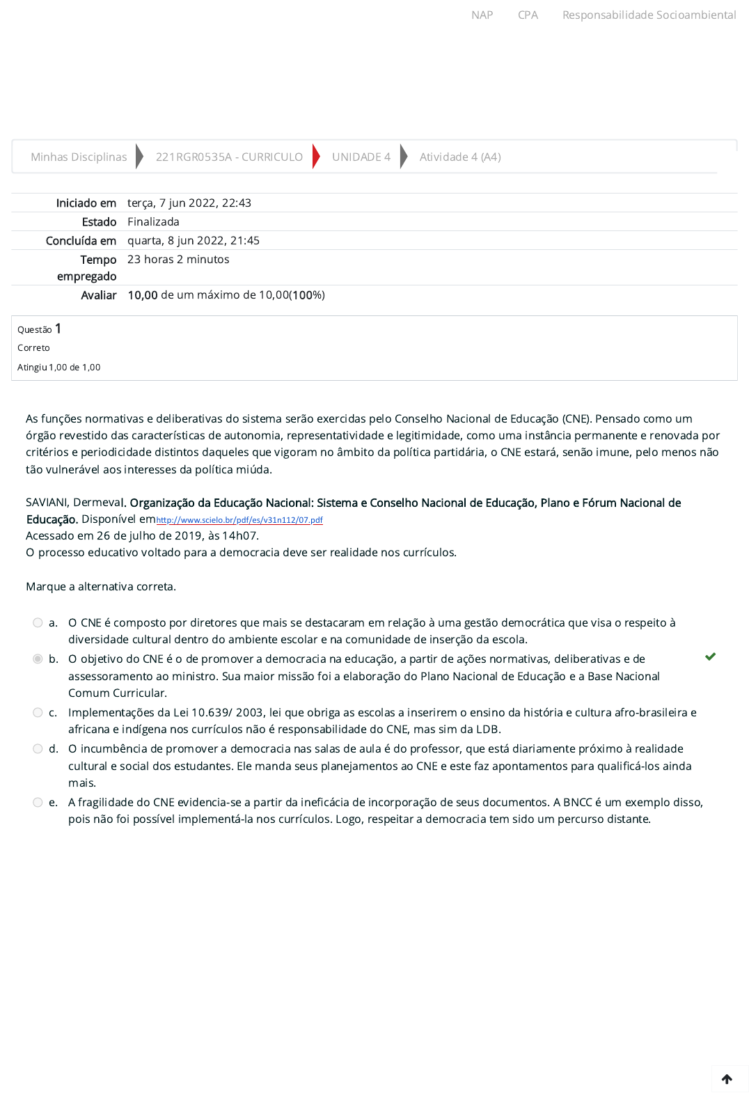 Minhas Disciplinas 221RGR0535A - CURRICULO UNIDADE 4 Atividade 4 (A4) Iniciado em terça, 7 jun 2022, 22:43 Estado Finalizada Concluída em quarta, 8 jun 2022, 21:45 Tempo empregado 23 horas 2 minutos Avaliar 10,00 de um máximo de 10,00(100%) Questão 1 Correto Atingiu 1,00 de 1,00 As funções normativas e deliberativas do sistema serão exercidas pelo Conselho Nacional de Educação (CNE). Pensado como um órgão revestido das características de autonomia, representatividade e legitimidade, como uma instância permanente e renovada por critérios e periodicidade distintos daqueles que vigoram no âmbito da política partidária, o CNE estará, senão imune, pelo menos não tão vulnerável aos interesses da política miúda. SAVIANI, Dermeval. Organização da Educação Nacional: Sistema e Conselho Nacional de Educação, Plano e Fórum Nacional de Educação. Disponível emh�p://www.scielo.br/pdf/es/v31n112/07.pdf Acessado em 26 de julho de 2019, às 14h07. O processo educativo voltado para a democracia deve ser realidade nos currículos. Marque a alternativa correta. a. O CNE é composto por diretores que mais se destacaram em relação à uma gestão democrática que visa o respeito à diversidade cultural dentro do ambiente escolar e na comunidade de inserção da escola. b. O objetivo do CNE é o de promover a democracia na educação, a partir de ações normativas, deliberativas e de assessoramento ao ministro. Sua maior missão foi a elaboração do Plano Nacional de Educação e a Base Nacional Comum Curricular. c. Implementações da Lei 10.639/ 2003, lei que obriga as escolas a inserirem o ensino da história e cultura afro-brasileira e africana e indígena nos currículos não é responsabilidade do CNE, mas sim da LDB. d. O incumbência de promover a democracia nas salas de aula é do professor, que está diariamente próximo à realidade cultural e social dos estudantes. Ele manda seus planejamentos ao CNE e este faz apontamentos para quali�cá-los ainda mais. e. A fragilidade do CNE evidencia-se a partir da ine�cácia de incorporação de seus documentos. A BNCC é um exemplo disso, pois não foi possível implementá-la nos currículos. Logo, respeitar a democracia tem sido um percurso distante. NAP CPA Responsabilidade Socioambiental https://ambienteacademico.com.br/my/ https://ambienteacademico.com.br/course/view.php?id=12255 https://ambienteacademico.com.br/course/view.php?id=12255§ion=6 https://ambienteacademico.com.br/mod/quiz/view.php?id=340519 http://www.scielo.br/pdf/es/v31n112/07.pdf https://codely-fmu-content.s3.amazonaws.com/Moodle/NAP/inicial/nap/fmu/index.html https://codely-fmu-content.s3.amazonaws.com/Moodle/CPA/landing_CPA/index.html https://portal.fmu.br/sustentabilidade Questão 2 Correto Atingiu 1,00 de 1,00 É por meio da LDB que encontramos os princípios gerais da educação, bem como as �nalidades, os recursos �nanceiros, a formação e diretrizes para a carreira dos pro�ssionais da educação. Além disso, essa é uma lei que se renova a cada período, cabendo à Câmara dos Deputados atualizá-la conforme o contexto em que se encontra a nossa sociedade. Como exemplo, antes o período para terminar o ensino fundamental era de 8 anos. Após a atualização da LDB, o período se estendeu para 9 anos, com idade inicial de 6 anos. Outras atualizações foram feitas, como a revogação dos parágrafos 2º e 4º do Artigo 36, da seção IV, que trata do ensino médio. Daí a importância de sua publicação, visando nortear o povo brasileiro, assegurando-lhe seus direitos e mostrando os seus deveres. CURSOS CPT. LDB - Lei de Diretrizes e Bases da Educação nº 9.394 Completa, Interativa e Atualizada. Disponível emh�ps://www.cpt.com.br/ldb/lei-de-diretrizes-e-bases-da-educacao-completa-intera�va-e-atualizada. Acessado em 28 de julho de 2019, às 14h05. Leia as sentenças abaixo. I - Para que a LDB entrasse em vigor, houve mais de 10 anos de tramitação no congresso, pois os pensamentos daqueles que participavam da sua elaboração eram divergentes. II - A LDB é uma lei composta por 96 artigos, os quais regulamentam a educação brasileira, nas esferas públicas e privadas, do Ensino Fundamental ao Ensino Superior. III - O número da Lei de Diretrizes e Bases da Educação Nacional é 9.394/ 1996 e é intitulada como Lei Darcy Ribeiro, em homenagem ao político e pesquisador homônimo. IV - O presidente Luís Inácio Lula da Silva foi o responsável por sancionar a LDB, a qual começou a ser elaborada durante o governo do presidente Fernando Henrique Cardoso. V - A LDB foi elaborada durante um momento de transição na política brasileiro, em que a democracia estava sendo reinstaurada no país. Marque a alternativa que apresenta a resposta correta. a. As alternativas II, III e IV estão corretas. b. As alternativas I, III e V estão corretas. c. As alternativas I, II e V estão corretas. d. Todas as alternativas estão corretas. e. As alternativas III, IV e V estão corretas. NAP CPA Responsabilidade Socioambiental https://www.cpt.com.br/ldb/lei-de-diretrizes-e-bases-da-educacao-completa-interativa-e-atualizada https://codely-fmu-content.s3.amazonaws.com/Moodle/NAP/inicial/nap/fmu/index.html https://codely-fmu-content.s3.amazonaws.com/Moodle/CPA/landing_CPA/index.html https://portal.fmu.br/sustentabilidade Questão 3 Correto Atingiu 1,00 de 1,00 Encerrando um período de oito anos de renhido embate político, a nova Lei de Diretrizes e Bases da Educação Nacional (LDB - Lei no 9394/96) é aprovada em dezembro de 1996. Em sua formulação �nal, a LDB sancionada expressa uma estreita sintonia com o ideário e a agenda neoliberais, o que pode ser constatado pelo exame dos seus 92 artigos. Sem embargo desse per�l, a sua aprovação não pode ser considerada uma monolítica derrota do movimento dos educadores e de outros segmentos sociais organizados na sua luta por uma lei que traduzisse um ordenamento mais democrático do siste