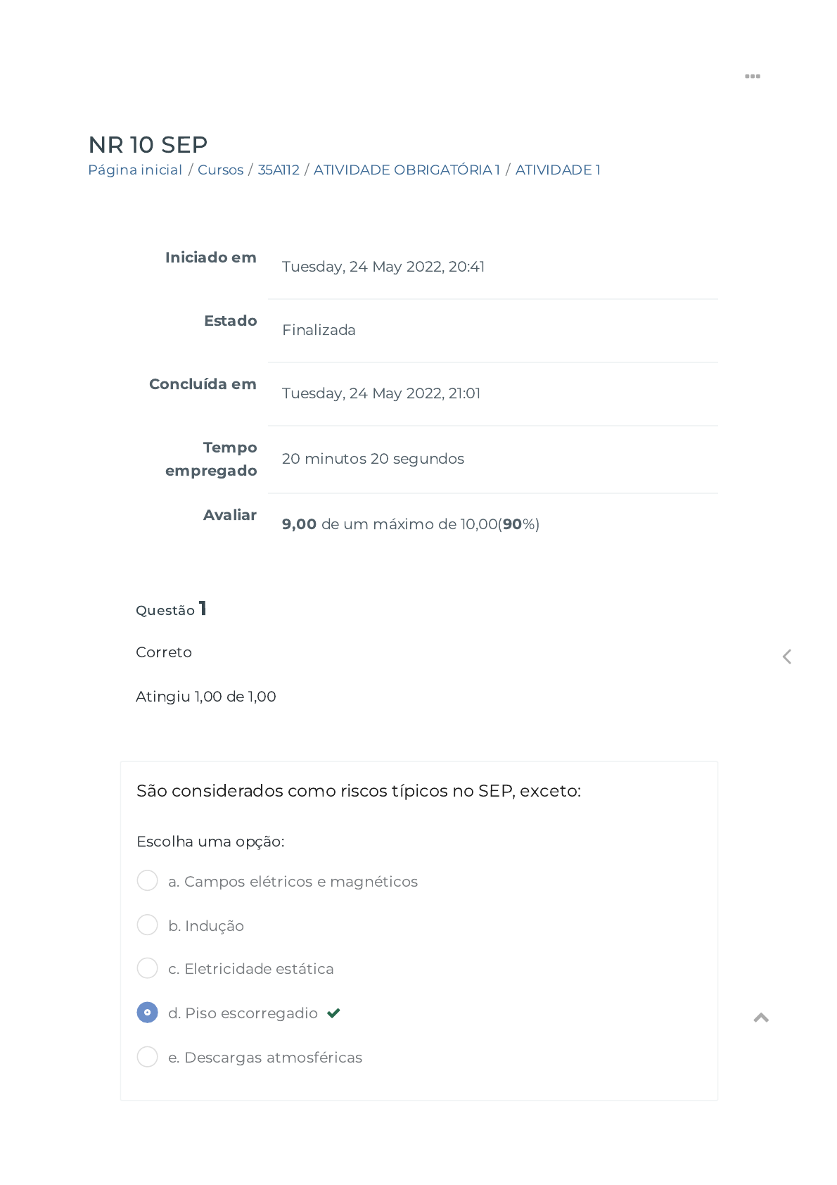 04/06/2022 12:43 ATIVIDADE 1 https://ava.politecnicabr.com.br/mod/quiz/review.php?attempt=3071214 1/11 Página inicial / Cursos / 35A112 / ATIVIDADE OBRIGATÓRIA 1 / ATIVIDADE 1 NR 10 SEP Iniciado em Tuesday, 24 May 2022, 20:41 Estado Finalizada Concluída em Tuesday, 24 May 2022, 21:01 Tempo empregado 20 minutos 20 segundos Avaliar 9,00 de um máximo de 10,00(90%) Questão 1 Correto Atingiu 1,00 de 1,00 São considerados como riscos típicos no SEP, exceto: Escolha uma opção: a. Campos elétricos e magnéticos b. Indução c. Eletricidade estática d. Piso escorregadio e. Descargas atmosféricas https://ava.politecnicabr.com.br/ https://ava.politecnicabr.com.br/course/index.php https://ava.politecnicabr.com.br/course/view.php?id=1034 https://ava.politecnicabr.com.br/course/view.php?id=1034#section-7 https://ava.politecnicabr.com.br/mod/quiz/view.php?id=32577 https://ava.politecnicabr.com.br/ 04/06/2022 12:43 ATIVIDADE 1 https://ava.politecnicabr.com.br/mod/quiz/review.php?attempt=3071214 2/11 Questão 2 Correto Atingiu 1,00 de 1,00 Emissor ou fonte, são elementos de um processo de: Escolha uma opção: a. Comunicação b. Administração c. Organização d. Distribuição https://ava.politecnicabr.com.br/ 04/06/2022 12:43 ATIVIDADE 1 https://ava.politecnicabr.com.br/mod/quiz/review.php?attempt=3071214 3/11 Questão 3 Correto Atingiu 1,00 de 1,00 Nesta fase é possível detectar as condições inseguras e os riscos de acidente que poderão ocorrer durante a realização de uma determinada tarefa a ser executada. A qual fase estamos estamos falando? Escolha uma opção: a. Projeto b. Planejamento c. Construção d. Operação e. Manutenção https://ava.politecnicabr.com.br/ 04/06/2022 12:43 ATIVIDADE 1 https://ava.politecnicabr.com.br/mod/quiz/review.php?attempt=3071214 4/11 Questão 4 Incorreto Atingiu 0,00 de 1,00 Inicia-se onde a energia elétrica é transformada, normalmente em subestações elevadoras, elevadas a níveis de tensão padronizados em 69, 138, 230 ou 500 kV, e transportada em corrente alternada através de cabos elétricos, até as subestações abaixadoras. Esta organização se refere a qual fase da energia elétrica? Escolha uma opção: a. Distribuição b. Transmissão c. Geração d. Consumo https://ava.politecnicabr.com.br/ 04/06/2022 12:43 ATIVIDADE 1 https://ava.politecnicabr.com.br/mod/quiz/review.php?attempt=3071214 5/11 Questão 5 Correto Atingiu 1,00 de 1,00 O que signi�ca by-pass? Escolha uma opção: a. É a continuidade do condutor, que faz interligação entre pontos da mesma fase para dá continuidade ao circuito elétrico. b. Interligação feita entre a fase do circuito elétrico e um equipamento (chaves fusíveis, interruptores, para-raios, transformadores, derivações de circuitos, etc.) c. Impedimento da reenergização d. Ligação intencional ao potencial de terra. e. Interligação provisória entre pontos da mesma fase para dá continuidade ao circuito elétricos. https://ava.politecnicabr.com.br/ 04/06/2022 12:43 ATIVIDADE 1 https://ava.politecnicabr.com.br/mod/quiz/review.php?attempt=3071214 6/11 Questão 6 Correto Atingiu 1,00 de 1,00 Para que os trabalhos em equipe sejam executados com qualidade e de forma segura, as seguintes orientações devem ser seguidas e observadas, com exceção de: Escolha uma opção: a. Saber dividir b. Aceitar as ideias dos outros c. Ser paciente d. Dialogar e. Ser egoísta https://ava.politecnicabr.com.br/ 04/06/2022 12:43 ATIVIDADE 1 https://ava.politecnicabr.com.br/mod/quiz/review.php?attempt=3071214 7/11 Questão 7 Correto Atingiu 1,00 de 1,00 Acontece nas usinas geradoras, que por transformação, a energia elétrica é produzida. Esta fase se trata da: Escolha uma opção: a. Consumo b. Distribuição c. Geração d. Transmissão https://ava.politecnicabr.com.br/ 04/06/2022 12:43 ATIVIDADE 1 https://ava.politecnicabr.com.br/mod/quiz/review.php?attempt=3071214 8/11 Questão 8 Correto Atingiu 1,00 de 1,00 Os pro�ssionais realizam seus trabalhos em locais que estão no mesmo potencial da terra, ou seja, se posicionando em escadas e executando todo o serviço através de ferramentas e equipamentos adequados. Este procedimento se refere ao método de trabalho: Escolha uma opção: Ao potencial À distância Noturno Ao contato Em altura https://ava.politecnicabr.com.br/ 04/06/2022 12:43 ATIVIDADE 1 https://ava.politecnicabr.com.br/mod/quiz/review.php?attempt=3071214 9/11 Questão 9 Correto Atingiu 1,00 de 1,00 Os pro�ssionais �cam em potencial intermediário, isolados em potencial da terra ou da rede, executando as tarefas ao contato, através de cestas aéreas ou plataformas, usando ferramentas e equipamentos adequados. Este procedimento se refere ao método de trabalho: Escolha uma opção: Ao contato Em altura Ao potencial Noturno À distância https://ava.politecnicabr.com.br/ 04/06/2022 12:43 ATIVIDADE 1 https://ava.politecnicabr.com.br/mod/quiz/review.php?attempt=3071214 10/11 Questão 10 Correto Atingiu 1,00 de 1,00 Tem início onde a energia elétrica é tratada nas subestações abaixadoras, seu nível é novamente rebaixado e transportados por cabos elétricos via aérea ou subterrânea. Depois tem seu nível de tensão novamente rebaixado a 110, 127, 220 e/ou 380 V, e �nalmente entregue para o consumidor �nal. Esta organização se refere a qual fase da energia elétrica? Escolha uma opção: a. Transmissão b. Geração c. Distribuição d. Consumo Entre em Contato https://www.politecnicabr.com.br 0800 084 2627 indisponível devido a pandemia de COVID-19, use outro canal! 0800 084 2627 comercial@politecnicabr.com.br Links Úteis Dicas da nossa Diretora Acadêmica Planner de Estudos Declaração de Matrícula Orientações do AVA Abertura de Ticket Fale com o Tutor Cronograma de Estudos Manual de Estágio Manual de Competência https://www.politecnicabr.com.br/ mailto:comercial@politecnicabr.com.br https://soundcloud.com/user-501638417/sets/escola-politecnica-brasileira https://storag