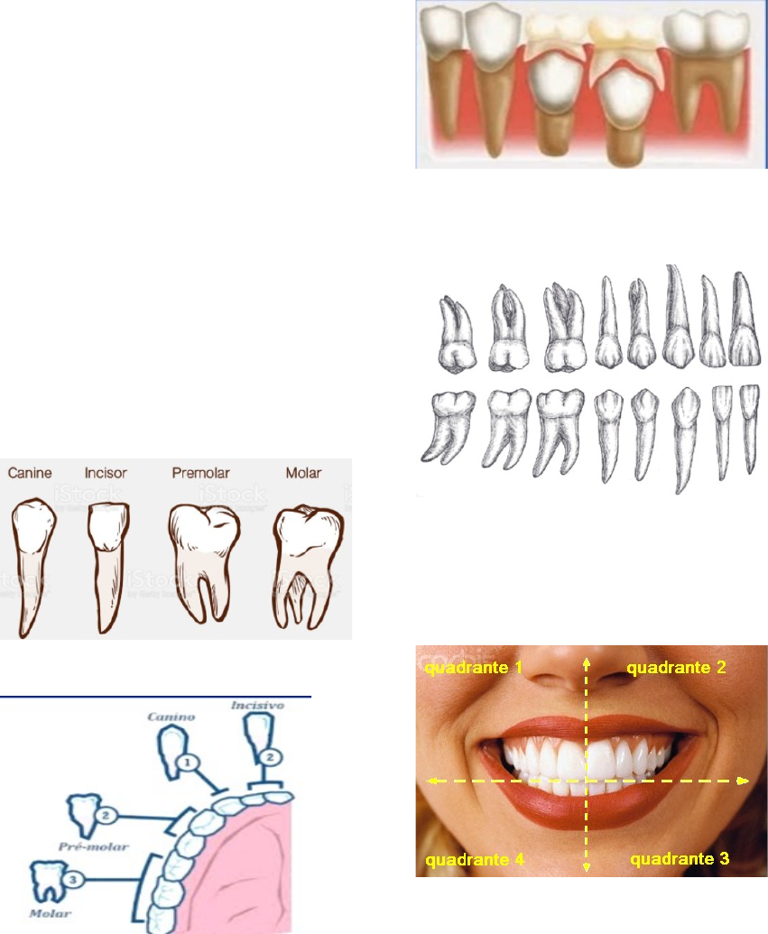 PROPEDÊUTICA EM DENTÍSTICA Propedêutica: significa “ensinar previamente”, corpo de ensinamento básico ou introdutório de uma disciplina. Dentística: É a especialidade na odontologia que estuda e aplica de maneira integrada o conjunto de procedimentos semiológicos, operatórios, preventivos, terapêuticos e educativos com o objetivo de preservar e devolver a integridade da estrutura, função e estética do dente. · INTRODUÇÃO O que o dente precisa ter no momento da restauração. Nomenclatura descritiva dos dentes: · CLASSE · TIPO INCISIVO: central ou lateral CANINO PRÉ-MOLAR: 1º OU 2º MOLAR: 1º, 2º OU 3º · CONJUNTO Se o dente é decíduo(de “leite”) ou permanente: · ARCADA Se é superior ou inferior: · POSIÇÃO-em relação ao plano sagital mediano Se é direita ou esquerda e o quadrante especifico: · NUMERAÇÃO DOS DENTES: Nomenclatura das superfícies dentais: · Superfícies ou faces: VESTIBULAR: Superfície voltada para os lábios e bochechas. LINGUAL, se for arcada inferior, e PALATAL, se for arcada superior. MESIAL: Quando estiver mais PRÓXIMA da linha media. DISTAL: Quando estiver mais LONGE da linha media. OCLUSAL: Em dentes posteriores, como pré-molares e molares. Estruturas da superfície oclusal · Pontas das cúspides Varia de acordo com a classe e o tipo, por exemplo: PRÉ-MOLARES: 2 cúspides MOLARES: 4 OU 5 cúspides Esse é um exemplo de um molar. · Sulcos Tem dois tipos: Sulco PRINCIPAL (cor amarela) e Sulcos SEGUNDÁRIOS (as outras cores), estabelecem os limites entre uma cúspide e outra. Sulco disto-vestibular Sulco ocluso-vestibular Sulco ocluso-lingual. · Fossas Onde acontece o acúmulo de placa, ocasionando a cárie. · Cristas marginais “vigas”, sempre que possível deve ser preservadas. · Vertentes É o que forma a cúspide. Tem as VERTENTES TRITURANTES (LARANJA) e VERTENTES LISAS ( ROXA): · CAVIDADE É o termo empregado para definir a lesão ou a condição do dente, causada pela destruição do tecido duro. Remover o tecido cariado e/ou conferir ao remanescente características compatíveis com o material restaurador selecionada TIPOS · Patológica É uma cavidade com formas e dimensões irregulares, pois é oriunda de uma lesão de cárie, destruição dos tecidos duros. · Terapêutico É uma cavidade tratada, com forma geométrica e dimensões definidas, resultado de processo cirúrgico que visa remover o tecido cariado. Preparo cavitário: É um tratamento biomecânico da cárie e de outras lesões dos tecidos duros dos dentes, a fim de que outras estruturas remanescentes possam receber uma restauração que as protejas, seja resistência e previna a reincidência de cárie, devolvendo a forma, função e estética. Objetivos do preparo cavitário: Remover o tecido cariado; Obter formas precisas; Impedir a fratura do dente e do material restaurador. NOMENCLATURA DAS CAVIDADES · Complexidade Facilita a comunicação do procedimento operatório, é importante que as cavidades sejam numeradas: 1. Simples: Envolve apenas uma face, ex. oclusal 2. Composta Envolve duas faces, ex. mésio-oclusal 3. Complexa Envolve 3 faces ou mais faces, ex. mésio-oclusaldistal PARTE CONSTITUINTE DA CAVIDADE · Paredes Circundantes Paredes laterais da cavidade. São as paredes que chegam até a superfície externa da cavidade. Defini contorno. Recebem o nome da face ou região com a qual a lesão está mais ligada. · Parede de fundo Paredes internas, nunca atingem a superfície da cavidade. Corresponde ao soalho da cavidade. Tem dois tipos: 1 PULPAR Quando perpendicular ao eixo do dente ou paralela à fase oclusal. Lingual vestibular Pulpar 5-pulpolingual 6-pulpovestibular 2 AXIAL Quando no mesmo sentido ao longo do eixo do dente. PLANOS DENTÁRIOS Considerando que o maior eixo é o longitudinal e que essa linha passa pelo centro do dente, desde a fase oclusal (ou incisal) até o ápice radicular, tem-se planos: · Plano horizontal · Plano Vestibulolingual · Plano mesiodistal NOMENCLATURA DAS PARTES CONSTITUINTES DA CAVIDADE · Ângulos Diedros Localizada na região de transição entre duas paredes. Nomeadas de acordo com o número de paredes envolvidas. União de duas paredes. De acordo com black: 1) 1º grupo Junção das paredes circundantes, ex: Distovestibular; distolingual; vestibulomesial; mesiolingual. 2) 2º grupo Parede circundante + Parede de fundo: Vestibulopulpar, mésiopulpar, distopulpar, linguopulpar Mesio/distopulpar, linguoaxial, vestibuloaxial, cérvicoaxial: 3) 3º grupo União das paredes de fundo da cavidade. · Ângulos Triedros Formado por três paredes e denominado de acordo com suas respectivas combinações: · Ângulos Cavossuperfícies Formado pela junção das paredes da cavidade com a superfície externa do dente. CLASSIFICAÇÃO DE BLACK Baseada nas áreas do dente que apresentam suscetibilidade à cárie. · Cavidade em Cicatrículas e fissuras Frequente e suscetíveis à cárie na oclusal. · Cavidade em Superfícies Lisas São imunes à cárie por conta da localização. · Artificial CLASSIFICAÇÃO DE BLACK Baseada na técnica de instrumentação da cavidade. 1) CLASSE I Regiões de má coalescência do esmalte, localizada geralmente nas cicatrículas e fissuras, como também: · Face oclusal de pré-molares e molares. · 2/3 da oclusal das faces vestibulares de molares inferior. · 2/3 da lingual/ palatal de molares superiores. · Região do cíngulo da face palatal de incisivos superiores. 2) CLASSE II Compromete as faces proximais dos molares e pré-molares. 3) CLASSE III Envolve uma ou ambas as faces proximais dos incisivos e caninos, sem comprometer o ângulo incisal. 4) CLASSE IV Envolve a face proximal de dentes anteriores, e, simultaneamente compromete o ângulo incisal, pelo menos um. Pode se levar em consideração também um traumatismos dentários 5) CLASSE V Envolve o terço gengival ou cervical das faces vestibulares ou lingual/ palatal de TODOS OS DENTES. Pode ser lesões cariosa