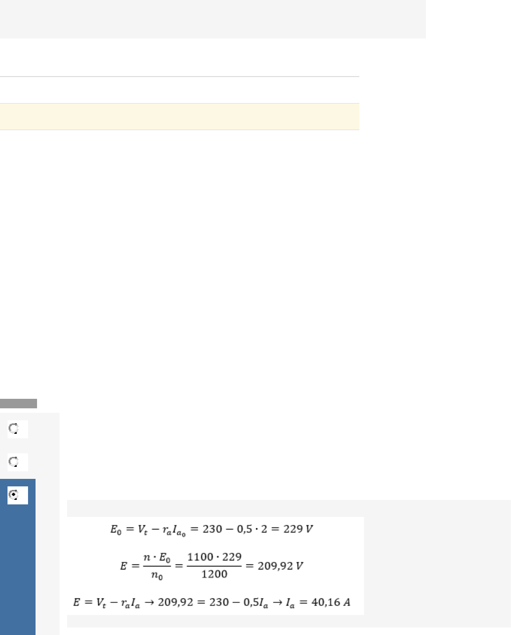 EMERSON CANDIDO DOMINGUES - RU: 2477451 Nota: 100 PROTOCOLO: 2022050424774514E247D5 Disciplina(s): Máquinas Elétricas Data de início: 04/05/2022 21:30 Prazo máximo entrega: - Data de entrega: 05/05/2022 23:21 Atenção. Este gabarito é para uso exclusivo do aluno e não deve ser publicado ou compartilhado em redes sociais ou grupo de mensagens. O seu compartilhamento infringe as políticas do Centro Universitário UNINTER e poderá implicar sanções disciplinares, com possibilidade de desligamento do quadro de alunos do Centro Universitário, bem como responder ações judiciais no âmbito cível e criminal. Questão 1/10 - Máquinas Elétricas Uma máquina de corrente contínua pode ser ligada de diversas formas diferentes, e cada uma delas possui características de funcionamento próprias. Uma das ligações mais simples de serem feitas é a ligação do motor de corrente contínua em derivação, ou ligação shunt. Neste tipo de ligação o enrolamento shunt em paralelo com o enrolamento de armadura e uma única fonte alimenta os dois enrolamentos. Nesta ligação o torque e a velocidade da armadura são diretamente proporcionais à tensão da fonte de alimentação. Desse modo, considere um motor em derivação de 10 HP, 230 V, tem uma resistência do circuito de armadura de 0,5 ΩΩ e uma resistência de campo de 115 ΩΩ. Em vazio e com tensão nominal, a velocidade é de 1200 rpm e a corrente de armadura é de 2 A. Se for aplicada uma carga, a velocidade cai para 1100 rpm. (DEL TORO, Vincent. Fundamentos de Máquinas Elétricas, 1. ed. Rio de Janeiro: LTC, 1994). Determine o torque desenvolvido quando há a aplicação da carga. Nota: 10.0 A 61,9 Nm B 66,8 Nm C 73,2 Nm Você acertou! D 77,5 Nm E 82,6 Nm Questão 2/10 - Máquinas Elétricas A obtenção do circuito equivalente por fase de um motor de indução trifásico é feita analisando separadamente os circuitos equivalente do estator e do rotor, e posteriormente é feita a união dos dois circuitos referenciando o circuito do rotor para o estator. Entretanto, caso seja necessário, os circuitos podem ser analisados separadamente, desde que as informações conhecidas permita tal análise. Deste ponto de tem-se um motor de indução trifásico tem um enrolamento do rotor conectado em Y. Em repouso, a tensão induzida no rotor, por fase, é de 100V. A resistência por fase é de 0,3 ΩΩ e a reatância de dispersão é de 1,0 ΩΩ por fase (DEL TORO, Vincent. Fundamentos de Máquinas Elétricas, 1. ed. Rio de Janeiro: LTC, 1994). Com base nas informações do texto afirma-se que I. Com o rotor bloqueado a corrente do rotor é de 87,5 A e o fator de potência do rotor é de 0,19. II. Quando opera com um escorregamento de 0,06 a corrente do rotor é de 22,1 A e o fator de potência é de 0,92. III. Operando com o escorregamento de 0,06 a potência desenvolvida no rotor é de 5,42 kW. Está correto o que se afirma em Nota: 10.0 A I, apenas. B II, apenas. C III, apenas. Você acertou! Afirmativa I: incorreta Afirmativa II: incorreta Afirmativa III: correta D I e II, apenas. E II e III, apenas. Questão 3/10 - Máquinas Elétricas Um gerador síncrono de pólo cilíndrico tem os seguintes valores nominais: 200 kVA, 400 V, 300 rpm, 60 Hz, trifásico, ligado em Y, ra = 0 ΩΩ. As características de circuito aberto e de corrente nominal com fator de potência zero estão indicadas na Figura a seguir. Calcule a corrente de campo necessária para fornecer tensão a tensão nominal quando a corrente nominal é entregue a uma carga com um fator de potência de 0,8 atrasado. Use o método geral não-linear (DEL TORO, Vincent. Fundamentos de Máquinas Elétricas, 1. ed. Rio de Janeiro: LTC, 1994). Nota: 10.0 A 22 A B 25 A C 27 A D 31 A E 34 A Você acertou! Questão 4/10 - Máquinas Elétricas Um gerador síncrono de polos salientes, trifásico, conectado em Y, 220 V, 5 kVA, é empregado para fornecer potência a uma carga com fator de potência unitário. Por meio de um teste de escorregamento, a reatância síncrona de eixo direto é determinada como sendo 12 ΩΩ e a reatância de eixo em quadratura, 7 ΩΩ. Considere que a corrente nominal é entregue à carga na tensão nominal e que a resistência de armadura é desprezível. (DEL TORO, Vincent. Fundamentos de Máquinas Elétricas, 1. ed. Rio de Janeiro: LTC, 1994). Com base nas informações do texto, assinale a alternativa que corresponde ao valor da tensão de excitação do gerador. Nota: 10.0 A 182 V B 189 V C 195 V Você acertou! D 201 V E 205 V Questão 5/10 - Máquinas Elétricas Um gerador síncrono possui os seguintes valores nominais: 180 kVA, 440 V, 300 rpm, 60 Hz, trifásico, ligado em Y, ra = 0 ΩΩ, x1 = 0,296 ΩΩ. A linha do entreferro é representada pela equação E = 17If expressa por fase. A característica de curto-circuito está representada por Isc = 10,75If. Calcule a corrente de campo necessária para fornecer a tensão nominal, quando a corrente nominal é entregue a uma carga com fator e potência de 0,8 atrasado. Use o método geral de análise linear. Considere A = 17,9 ampères de campo equivalente. (DEL TORO, Vincent. Fundamentos de Máquinas Elétricas, 1. ed. Rio de Janeiro: LTC, 1994). Nota: 10.0 A 28,3 A B 30,9 A C 33,2 A Você acertou! D 35,8 A E 39,4 A Questão 6/10 - Máquinas Elétricas De um teste em vazio num motor de indução com conectado em Y, trifásico, 60 Hz, 230 V, quatro polos, 10HP, com a tensão nominal aplicada, a corrente em vazio foi de 9,2 A e a potência de entrada correspondente, 670 W. Também, com 57 V aplicados no teste com rotor bloqueado, foi determinado que o motor solicita 30 A e 950 W da rede. A resistência do enrolamento do estator foi medida como 0,15 ΩΩ, por fase. Quando este motor é acoplado à sua carga mecânica, a entrada do motor é 9150W, para 28 A e um fator de potência de 0,82. As perdas no núcleo do estator e as perdas rotacionais são iguais. Despreze o efeito pelicular. (DEL TORO, Vincent. F
