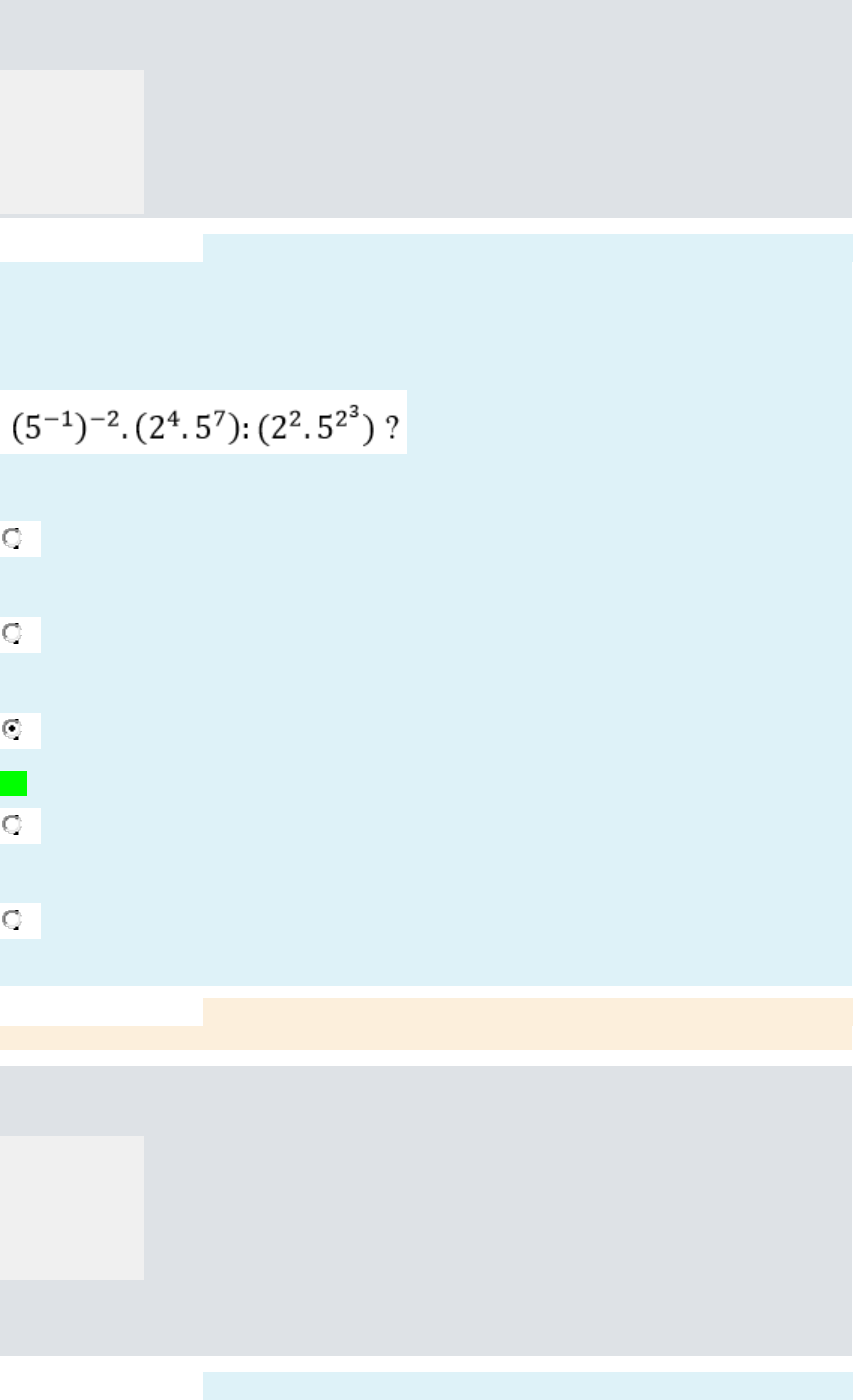 Questão 1 Correto Atingiu 4,00 de 4,00 Marcar questão Texto da questão Qual é o valor da expressão: Escolha uma opção: a. 8 b. 5000 c. 20 d. 125 e. 10 Feedback Sua resposta está correta. Questão 2 Correto Atingiu 4,00 de 4,00 Marcar questão Texto da questão Sendo , o valor de xyz é: Escolha uma opção: a. 218 b. 225 c. 223 d. 230 e. 220 Feedback Sua resposta está correta. Questão 3 Correto Atingiu 4,00 de 4,00 Marcar questão Texto da questão Na potenciação sempre que a base for 1 a potência será igual a: Escolha uma opção: a. 10 b. Expoente natural c. N.d.a. (nenhuma destas alternativas) d. 0 e. 1 Feedback Sua resposta está correta. Questão 4 Correto Atingiu 4,00 de 4,00 Marcar questão Texto da questão Um número é expresso por (26 : 24 ) + 22. Uma outra forma de expressar esse número é: Escolha uma opção: a. 25 b. 2 c. 23 d. 20 e. 24 Feedback Sua resposta está correta. Questão 5 Correto Atingiu 4,00 de 4,00 Marcar questão Texto da questão Sendo a = 27 . 38 . 7 e b = 25 . 36, o quociente de a por b é igual a : Escolha uma opção: a. 200 b. 126 c. 36 d. 252 e. 48 Feedback Sua resposta está correta.
