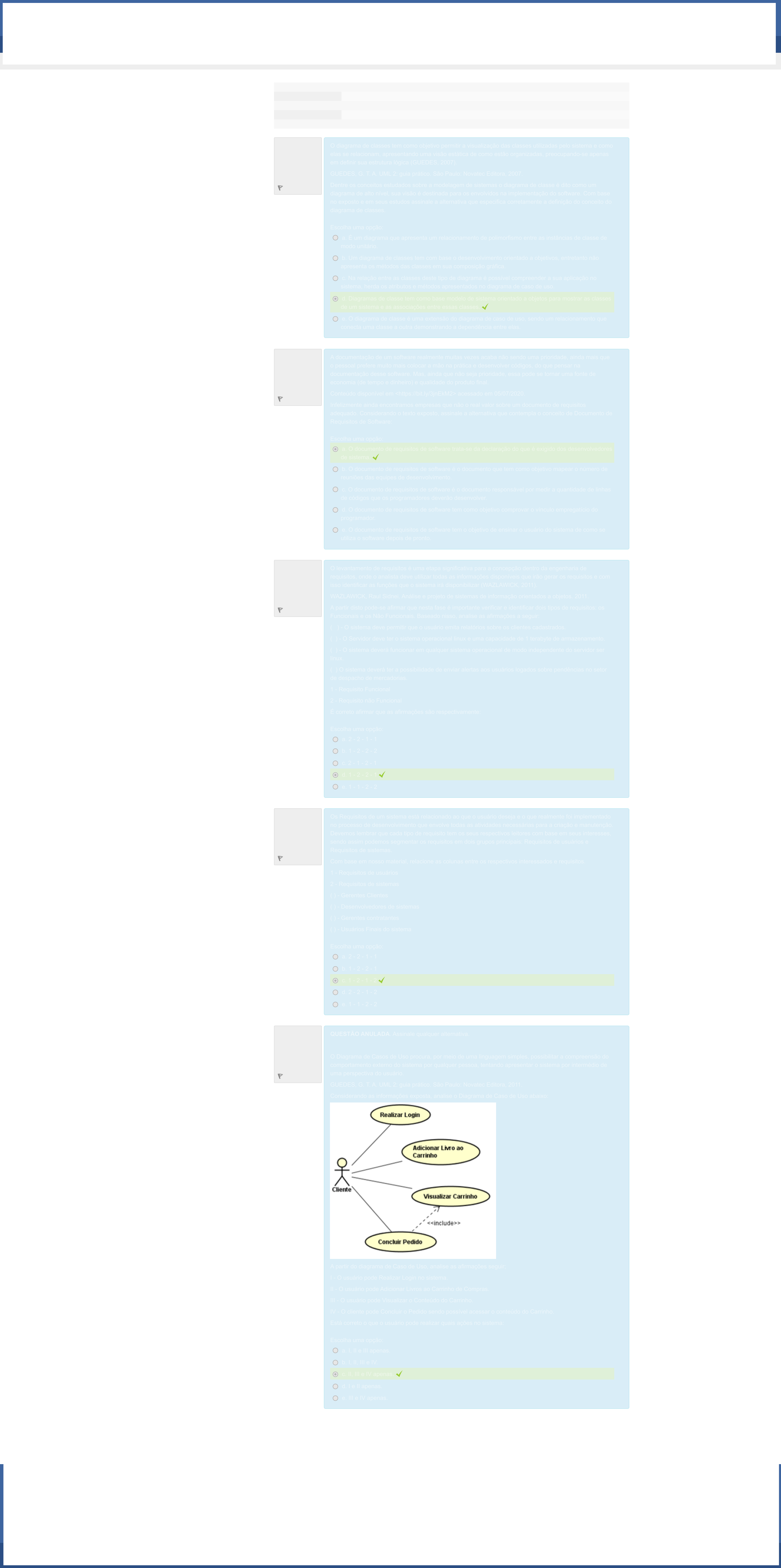 Alessandro de Souza dos Santos (Alessandro de Souza dos Santos) Painel Gestão Engenharia e Projeto de Software - M2 2022 Atividade de Estudo 2 Atividade de Estudo 2 Questão 1 Correto Atingiu 1,00 de 1,00 Marcar questão Questão 2 Correto Atingiu 1,00 de 1,00 Marcar questão Questão 3 Correto Atingiu 1,00 de 1,00 Marcar questão Questão 4 Correto Atingiu 1,00 de 1,00 Marcar questão Questão 5 Correto Atingiu 1,00 de 1,00 Marcar questão Terminar revisão Iniciado em domingo, 22 Mai 2022, 09:53 Estado Finalizada Concluída em domingo, 22 Mai 2022, 09:56 Tempo empregado 2 minutos 43 segundos Avaliar 5,00 de um máximo de 5,00(100%) O diagrama de classes tem como objetivo permitir a visualização das classes utilizadas pelo sistema e comoO diagrama de classes tem como objetivo permitir a visualização das classes utilizadas pelo sistema e como elas se relacionam, apresentando uma visão estática de como estão organizadas, preocupando-se apenaselas se relacionam, apresentando uma visão estática de como estão organizadas, preocupando-se apenas em definir sua estrutura lógica (GUEDES, 2007). em definir sua estrutura lógica (GUEDES, 2007). GUEDES, G. T. A. UML 2: guia prático. São Paulo: Novatec Editora, 2007.GUEDES, G. T. A. UML 2: guia prático. São Paulo: Novatec Editora, 2007. Dentre os conceitos estudados sobre a modelagem de sistemas o diagrama de classe é dito como umDentre os conceitos estudados sobre a modelagem de sistemas o diagrama de classe é dito como um diagrama de alto nível, sua visão é destinada para os envolvidos na implementação do software. Com basediagrama de alto nível, sua visão é destinada para os envolvidos na implementação do software. Com base no exposto e em seus estudos assinale a alternativa que especifica corretamente a definição do conceito dono exposto e em seus estudos assinale a alternativa que especifica corretamente a definição do conceito do diagrama de classes. diagrama de classes. Escolha uma opção:Escolha uma opção: a. É um diagrama que apresenta um relacionamento de polimorfismo entre as instâncias de classe dea. É um diagrama que apresenta um relacionamento de polimorfismo entre as instâncias de classe de modo unitário.modo unitário. b. Um diagrama de classes tem com base o desenvolvimento orientado a objetivos, entretanto nãob. Um diagrama de classes tem com base o desenvolvimento orientado a objetivos, entretanto não apresenta os métodos das classes em sua composição gráfica.apresenta os métodos das classes em sua composição gráfica. c. Na relação entre as classes deste tipo de diagrama é possível compreender a sua aplicação noc. Na relação entre as classes deste tipo de diagrama é possível compreender a sua aplicação no sistema, herda os atributos e métodos apresentados no diagrama de caso de uso.sistema, herda os atributos e métodos apresentados no diagrama de caso de uso. d. Diagramas de classe tem como base modelo de sistema orientado a objetos para mostrar as classesd. Diagramas de classe tem como base modelo de sistema orientado a objetos para mostrar as classes de um sistema e as associações entre essas classes.de um sistema e as associações entre essas classes. e. O diagrama de classe é uma extensão do diagrama de caso de uso, sendo um relacionamento quee. O diagrama de classe é uma extensão do diagrama de caso de uso, sendo um relacionamento que conecta uma classe a outra demonstrando a dependência entre elas.conecta uma classe a outra demonstrando a dependência entre elas. A documentação de um software realmente muitas vezes acaba não sendo uma prioridade, ainda mais queA documentação de um software realmente muitas vezes acaba não sendo uma prioridade, ainda mais que o pessoal prefere muito mais colocar a mão na prática e desenvolver códigos, do que pensar nao pessoal prefere muito mais colocar a mão na prática e desenvolver códigos, do que pensar na documentação desse software. Mas, ainda que não seja prioridade, essa pode se tornar uma fonte dedocumentação desse software. Mas, ainda que não seja prioridade, essa pode se tornar uma fonte de economia (de tempo e dinheiro) e qualidade do produto final.economia (de tempo e dinheiro) e qualidade do produto final. Conteúdo disponível em <https://bit.ly/3jnEkM2> acessado em 05/07/2020.Conteúdo disponível em <https://bit.ly/3jnEkM2> acessado em 05/07/2020. Infelizmente ainda encontramos empresas que não o real valor sobre um documento de requisitosInfelizmente ainda encontramos empresas que não o real valor sobre um documento de requisitos adequado. Considerando o texto exposto, assinale a alternativa que contempla o conceito de Documento deadequado. Considerando o texto exposto, assinale a alternativa que contempla o conceito de Documento de Requisitos de Software: Requisitos de Software: Escolha uma opção:Escolha uma opção: a. O documento de requisitos de software trata-se da declaração do que é exigido dos desenvolvedoresa. O documento de requisitos de software trata-se da declaração do que é exigido dos desenvolvedores de sistema.de sistema. b. O documento de requisitos de software é o documento que tem como objetivo mapear o número deb. O documento de requisitos de software é o documento que tem como objetivo mapear o número de reuniões das equipes de desenvolvimento.reuniões das equipes de desenvolvimento. c. O documento de requisitos de software é o documento responsável por medir a quantidade de linhasc. O documento de requisitos de software é o documento responsável por medir a quantidade de linhas de códigos que os programadores deverão desenvolver. de códigos que os programadores deverão desenvolver. d. O documento de requisitos de software tem como objetivo comprovar o vínculo empregatício dod. O documento de requisitos de software tem como objetivo comprovar o vínculo empregatício do programador.programador. e. O documento de requisitos de software tem o 