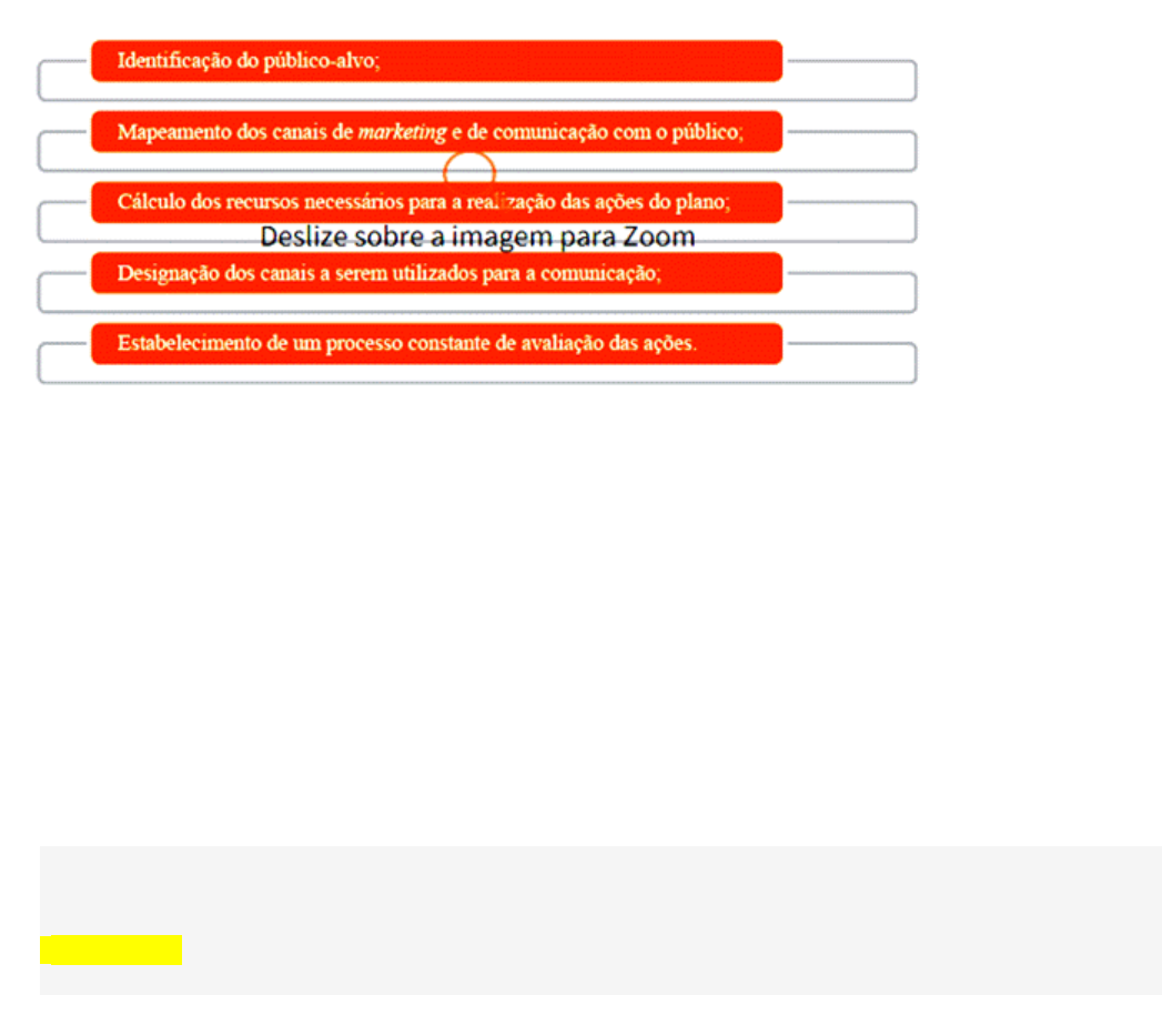 UAM – Comunicação – Prova N2 Pergunta 9 A comunicação estratégica visa à elaboração de planos para que a instituição atinja seus objetivos, o primeiro passo para o plano estratégico de comunicação é o diagnóstico e a definição dos objetivos a serem alcançados. Nesse sentido, Pimentel (2017) aponta alguns passos fundamentais para a eficácia da comunicação estratégica. Observe a figura: Passos fundamentais para a elaboração de um plano estratégico de comunicação organizacional. Fonte: PIMENTEL, M. Em pauta: manual prático da comunicação organizacional. Curitiba: Intersaberes, 2017, p. 93. Considerando o texto apresentado e o conteúdo estudado no livro, analise as asserções a seguir no que diz respeito a ações eficazes para identificação e mapeamento do público-alvo e o mapa: I. Mapear hábitos de familiares do público-alvo. II. Mapear idade e gênero. III. Mapear renda e escolaridade. IV. Mapear hábitos. É correto apenas o que se afirma em: · I, II e III. · II e IV. · I, II e IV. · II, III e IV. · II e III.