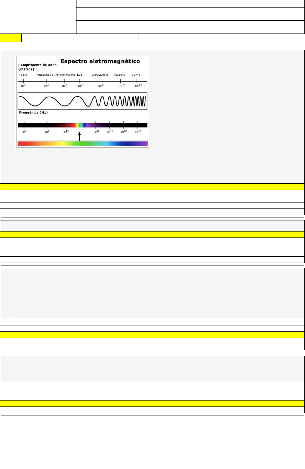 16/06/2022 13:13:42 1/3 PARTE 3 B Parte 3 B Nome: XXXXXXXXXXXXXXXXXXXXXXXXXXXXXXXXXXXXXXXXXX Disciplina: Física I Respostas corretas são marcadas em amarelo X Respostas marcardas por você. Questão 001 Observe a imagem abaixo: Fonte: http://wiki.stoa.usp.br/Teced/textos/Grupo_8. Acesso em 25 fev. 2021. De acordo as informações apresentadas na imagem, avalie as afirmativas abaixo: I. O comprimento de onda é caracterizado como a distância entre dois picos consecutivos e é representado pela letra grega λ. II. A frequência de uma onda é dada pela relação entre o período e a quantidade de oscilações da mesma. III. De acordo com o espectro eletromagnético apresentado, quanto maior for o comprimento de onda menor será a frequência da mesma e, consequentemente, menos energia será transportada. É correto o que se afirma em X A) I e III, apenas. B) II, apenas. C) I, apenas. D) II e III, apenas. E) III, apenas. Questão 002 Uma rádio local transmite sua programação numa frequência de 105 MHz. Considerando o intervalo de tempo de 30 minutos, quantos picos de onda serão emitidos? X A) 1,89.1 B) 1,70.10 C) 1,78.10 D) 1,64.10 E) 1,50.1 Questão 003 Leia o trecho abaixo: Foram inventados inúmeros objetos que assobiam, mas provavelmente os mais conhecidos são o apito dos policiais ingleses (de tubo único), o apito dos policiais americanos e os instrumentos musicais que produzem sons através de um mecanismo de assobio. Do mesmo modo, podemos tomar como um exemplo análogo o barulho produzido por uma chaleira quando a água que está no seu interior já está fervendo. Adaptado de WALKER, J. O grande circo da física. Trad. Jorge Antonio Valadares. Grandiva publicações: Lisboa, 2001. De acordo as informações apresentadas no trecho, avalie as afirmativas abaixo: I. O funcionamento do apito é baseado no movimento das correntes de ar emitidas por quem apita. II. Ao apitar surgem vórtices que transmitem energia, fazendo com surja uma onda sonora. III. O apito só funciona, pois, as ondas emitidas são eletromagnéticas e, assim, propagam-se no meio material. É correto o que se afirma em A) II e III, apenas. B) II, apenas. X C) I e II, apenas. D) I, apenas. E) I, II e III. Questão 004 A maior parte da informação que obtemos da vizinhança chega a nós na forma de algum tipo de onda. É através do movimento ondulatório que o som chega aos nossos ouvidos, a luz aos nossos olhos, e os sinais eletromagnéticos aos nossos aparelhos eletrônicos. Adaptado de HEWITT, P. G. Física Conceitual. Trad. Trieste Freire Ricci e Maria Helena Gravina. 9 ed. Porto Alegre: Bookman, 2002. O som é caracterizado como uma onda de qual tipo? A) Quântica. B) Eletromagnética. C) Isomórfica. X D) Mecânica. E) Adiabática. http://wiki.stoa.usp.br/Teced/textos/Grupo_8 16/06/2022 13:13:42 2/3 Questão 005 Leia o trecho abaixo: Um dos efeitos eletromagnéticos mais conhecidos da física, o Efeito Hall, largamente explorado em semicondutores, foi replicado usando fótons - no comprimento de ondas de rádio - em vez de elétrons. Essa autêntica "corrente de luz" poderá ser usada para criar sistemas avançados de comunicação, que reforçam a transmissão de sinais em uma direção, enquanto absorvem simultaneamente os sinais na direção oposta. Mais do que isso, a tecnologia promete reduzir pela metade a largura de banda necessária para uma determinada comunicação, permitindo que uma antena envie e receba sinais na mesma frequência simultaneamente, por meio de um processo chamado acoplamento não-recíproco. Fonte: site Inovação Tecnológica, disponível em https://www.inovacaotecnologica.com.br/noticias/noticia.php?artigo=corrente-luz-faz-transmissao-radio-unico-sentido&id=010110190920#.YDt7ZpNKjOQ. Acesso em 26 fev. 2021. De acordo as informações apresentadas no trecho, avalie as afirmativas abaixo: I. As ondas de rádio são caracterizadas como ondas eletromagnéticas, pois são formadas por um campo elétrico e outro magnético. II. Uma das características principais das ondas é que esta só transporta energia, não transporta matéria. III. A palavra fóton utilizada no trecho destacado refere-se, basicamente, ao processo mecânico de obtenção de corrente elétrica pelo dispositivo. É correto o que se afirma em A) III, apenas. B) I, apenas. C) II e III, apenas. D) II, apenas. X E) I e II, apenas. Questão 006 Uma antena de rádio emite 8 picos de onda em um intervalo de 16 segundos. Qual é sua frequência? A) 0,1 Hz B) 0,3 Hz C) 0,4 Hz X D) 0,5 Hz E) 0,2 Hz Questão 007 Leia o trecho abaixo: A estrutura, de aparência um tanto simples, é capaz de concentrar as ondas de água da mesma forma que uma lente concentra as ondas de luz. Nos testes em laboratório, com apenas 10 cm de água no tanque, as ondas que atingem a estrutura até triplicam de altura quando alcançam sua zona central, enquanto, ao mesmo tempo, dificilmente são geradas ondas refletidas que poderiam anular as ondas entrantes. Com as ondas concentradas em um ponto único, torna-se mais fácil usá-las para gerar eletricidade, o que promete viabilizar a utilização desse recurso de energia renovável em larga escala. Fonte: site Inovação Tecnológica, disponível em https://www.inovacaotecnologica.com.br/noticias/noticia.php?artigo=ondas-mar-concentradas-gerar-energia&id=010115180919#.YDuBLJNKjOQ. Acesso em 26 fev. 2021. De acordo as informações apresentadas no trecho, avalie as afirmativas abaixo: I. O funcionamento do aparelho citado no trecho baseia-se no princípio de conservação de energia, o qual diz que toda energia pode ser construída. II. As ondas do mar carregam energia na forma mecânica, a qual é armazenada por meio da colisão com o aparelho, transformando-se assim em energia cinética. III. A energia gerada por meio do aparelho descrito é transformada em eletricidade por meio de transformações químicas que ocorrem num momento posterior ao armazenamento da energia. É correto o que s