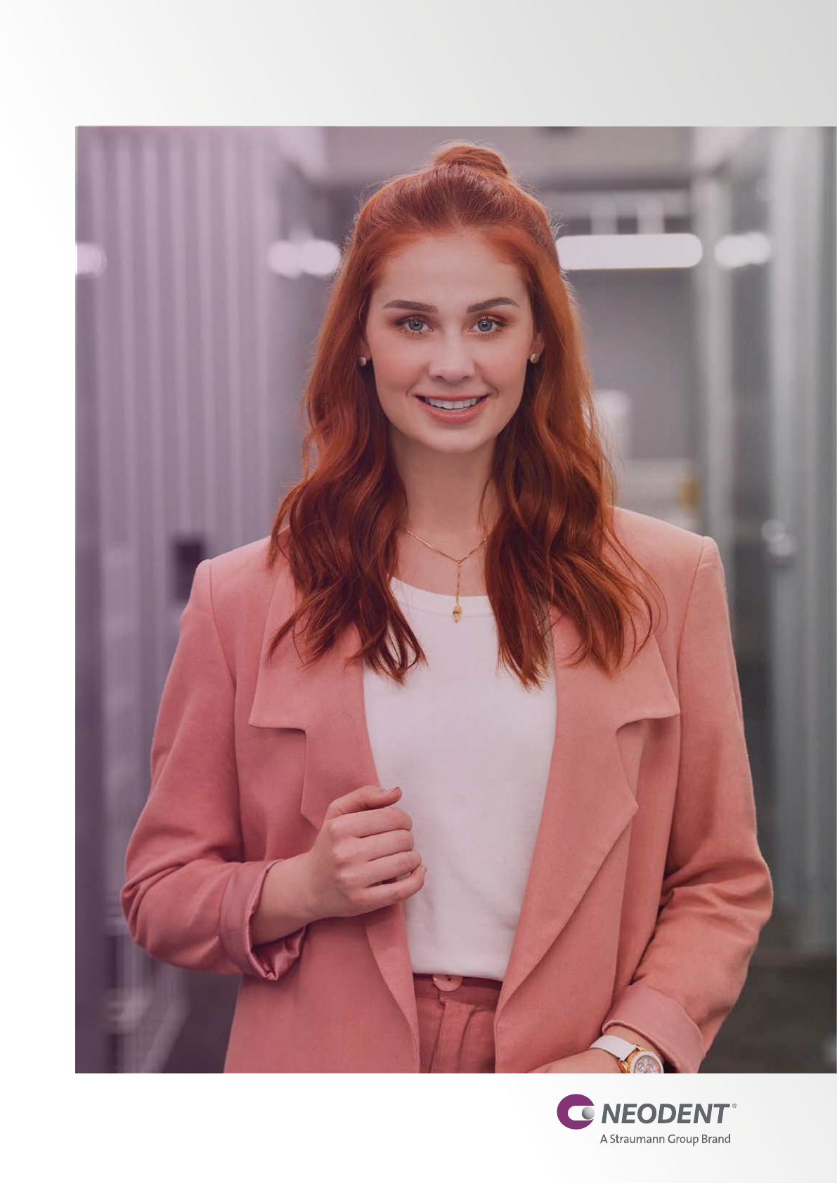 CATÁLOGO • 2022 C A TÁ LO G O D E P R O D U TO S N E O D E N T ® 2 0 2 2 • E D IÇ Ã O 0 1 CATÁLOGO • 2022 C A TÁ LO G O D E P R O D U TO S N E O D E N T ® 2 0 2 2 • E D IÇ Ã O 0 1 A Neodent® fornece-lhe uma gama completa de produtos e serviços que são concebidos e produzidos por uma equipa de profissionais que adoram verdadeiramente o que fazem. Tal como você, vivemos para dar às pessoas novos motivos para sorrir. Novas formas para desfrutar de tudo o que a vida tem para oferecer. Todos os dias. N O V O S S O R R I S O S T O D O S O S D I A S N O V O S S O R R I S O S T O D O S O S D I A S Zirconia Implant System Com o aumento das expetativas relativamente aos tratamentos de estética em menos tempo, o Neodent® Zirconia Implant System combina os conceitos de flexibilidade, estabilidade e estética. Esta solução sem metal permite o tratamento imediato dos pacientes com uma estética maior graças ao desenho cónico do implante de zircónia naturalmente moderno, com um portfólio protético de zircónia abrangente. Uma nova mentalidade de flexibilidade Uma nova mentalidade de estabilidade Uma nova mentalidade de estética Uma nova mentalidade Uma nova mentalidade de flexibilidade Tendo como objetivo suprir as necessidades de diversos tratamentos exigentes, o Zirconia Implant System proporciona a flexibilidade de uma conexão de 2 peças combinada com uma resistente conexão aparafusada de zircónia‑zircónia. SISTEMA DE ZIRCÓNIA FIÁVEL E RESISTENTE A única conexão ZiLock® patenteada possui um parafuso mais longo que oferece um encaixe seguro entre o implante de zircónia e o pilar de zircónia. Além disso, melhora o desempenho da zircónia com a otimização da distribuição da força ao longo da conexão interna. CONEXÃO ZILOCK® SIMPLES ZiLock® é uma conexão interna reta de zircónia com 6 saliências e 6 pontos. Esta indexação resulta num posicionamento preciso do pilar, protegendo contra a rotação. O resultado traduz‑se num sistema fácil de utilizar, que permite uma maior flexibilidade no tratamento comparativamente a implantes de uma só peça. Apicalmente cónico com caneluras da câmara. Desenho de rosca trapezoidal dupla Imagem representativa da superfície do implante ‑ Microscopia eletrónica de varrimento (SEM) com magnificação de 5000x. Uma nova mentalidade de estabilidade Tendo em vista a obtenção de protocolos estáveis imediatos, Zi combina o desenho naturalmente cónico do implante e a superfície tratada do implante. Foram ambos concebidos para maximizar a estabilidade e a previsibilidade em tratamentos imediatos. DESENHO CÓNICO PARA ESTABILIDADE PRIMÁRIA O Zirconia Implant System possui uma geometria de implante cónico moderna, concebida para tratamentos imediatos previsíveis em todos os tipos de osso. Esta característica foi concebida para reproduzir a forma cónica da raiz natural do dente , permitindo obter uma elevada estabilidade primária. PREVISIBILIDADE COM SUPERFÍCIE POLIDA A JATO DE AREIA E COM TRATAMENTO ÁCIDO Zi integra uma superfície polida a jato de areia e com tratamento ácido, apresentando uma rugosidade macro e micro baseada no tratamento da superfície Neoporos® extremamente bem sucedido. Uma nova mentalidade de estética Com o objetivo de obter um desempenho estético extraordinário, o Zi proporciona, partindo do próprio material, a zircónia, um resultado estético natural ao portfólio abrangente. DESEMPENHO ESTÉTICO EXTRAORDINÁRIO Com a finalidade de obter excelentes resultados ao nível estético, o Neodent Zi Implant System procura oferecer um desempenho natural extraordinário, incluindo um material de zircónia superior, o qual permite um resultado de reconstrução natural, devido à cor que simula os dentes naturais, beneficiando de uma elevada translucidez comparativamente aos metais. UM PORTFÓLIO PARA OBTER RESULTADOS RESULTADOS ESTÉTICOS O portfólio de materiais protéticos de zircónia permite protocolos convencionais ou imediatos. Adicionalmente, pode ser aplicado o fluxo de trabalho preferível, do convencional ao digital, proporcionando uma restauração de aspeto natural. BASE DE ZIRCÓNIA PILAR CR DE ZIRCÓNIA Prótese aparafusada unitária Ø 3.75/4.5 mm Prótese cimentada unitária BASE DE ZIRCÓNIA PARA C Ø 4.0/4.5 mm Prótese aparafusada unitária Prótese cimentada unitária Prótese cimentada unitária Ø 4.65 mm Embalagem para implantes Neodent Zi A embalagem Neodent® foi especialmente renovada para um fácil manuseamento e para que o procedimento cirúrgico seja seguro, ao proporcionar um carácter prático desde o armazenamento do implante à recolha e transporte e à base do implante. As características do implante, tais como tipo, diâmetro e comprimento, podem ser facilmente identificadas no exterior da embalagem. São fornecidos três rótulos autocolantes para colocação nos registos médicos do paciente e para informar a equipa de prótese. Também permitem a rastreabilidade de todos os artigos. 1. A caixa de cartão e a embalagem tipo blister têm de ser abertas manualmente, sem luvas estéreis. Quebre o selo da embalagem de cartão e retire o blister. Abra a embalagem tipo blister. Deposite o frasco estéril no campo cirúrgico. NOTA: o tubo transparente e o implante têm de ser manuseados com uma luva cirúrgica estéril, num ambiente cirúrgico. Segure no recipiente com a mão não dominante e retire a tampa. 3. Mantenha o suporte estável e remova a tampa. 5. Leve o conjunto de transferência- implante até à cavidade cirúrgica. 2. O suporte interno que contém o implante e a peça de transferência tem de ser removido juntamente com a tampa. Para isso, remova a tampa e o suporte interno do tubo transparente no sentido axial sem qualquer movimento lateral. 4. Para a instalação, capte a peça de transferência do implante com a conexão hexagonal, mantendo-a estável e rodando ligeiramente o suporte interno, até encontrar o encaixe perfeito