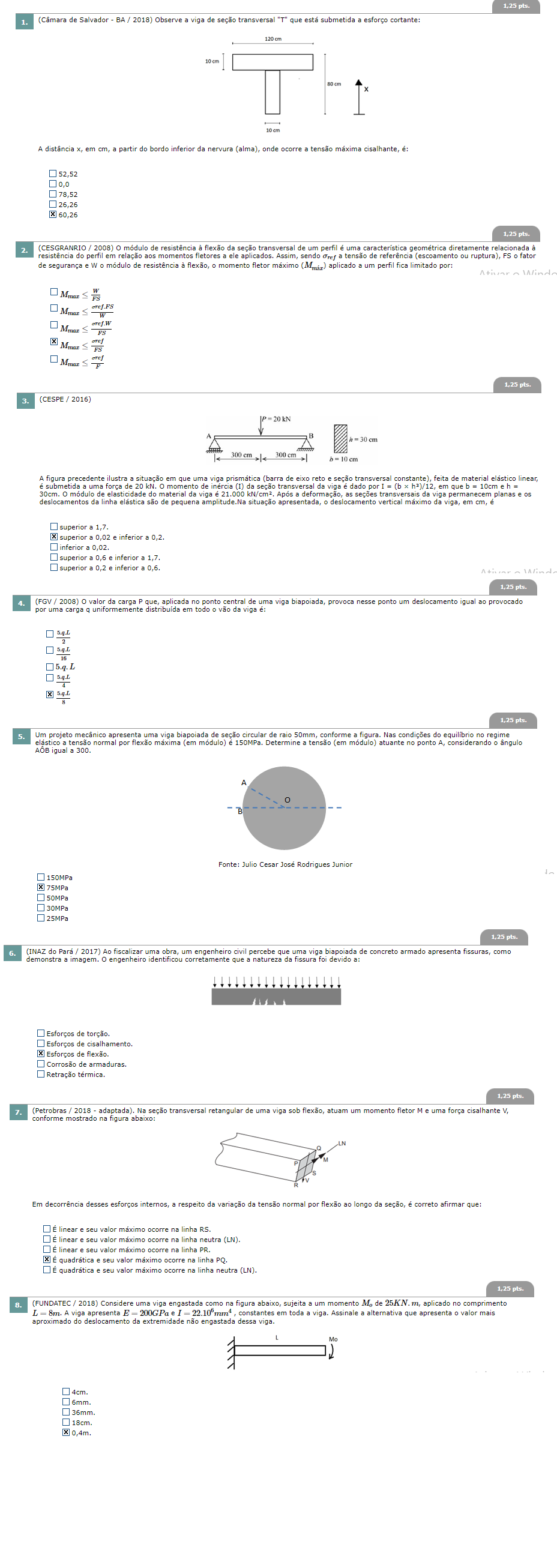 Um projeto mecânico apresenta uma viga biapoiada de seção circular de raio 50mm, conforme figura. Nas condições do equilíbrio no regime elástico, tensão normal por flexão máxima (em módulo) é 150MPa. Determine tensão (em módulo) atuante no ponto A, considerando ângulo igual 30°. 150MPa 75MPa 50MPa 30MPa 25MPa