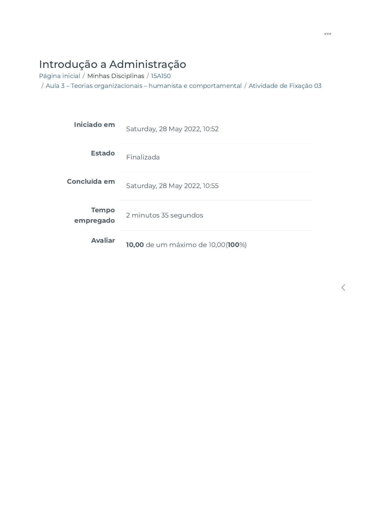 25/06/2022 08:14 Atividade de Fixação 03 https://ava.politecnicabr.com.br/mod/quiz/review.php?attempt=3088765 1/7 Página inicial / Minhas Disciplinas / 15A150 / Aula 3 – Teorias organizacionais – humanista e comportamental / Atividade de Fixação 03 Introdução a Administração Iniciado em Saturday, 28 May 2022, 10:52 Estado Finalizada Concluída em Saturday, 28 May 2022, 10:55 Tempo empregado 2 minutos 35 segundos Avaliar 10,00 de um máximo de 10,00(100%) https://ava.politecnicabr.com.br/ https://ava.politecnicabr.com.br/course/view.php?id=909 https://ava.politecnicabr.com.br/course/view.php?id=909#section-4 https://ava.politecnicabr.com.br/mod/quiz/view.php?id=23755 https://ava.politecnicabr.com.br/ 25/06/2022 08:14 Atividade de Fixação 03 https://ava.politecnicabr.com.br/mod/quiz/review.php?attempt=3088765 2/7 Questão 1 Correto Atingiu 2,00 de 2,00 Dentre as contribuições da teoria das relações humanas, assinale a alternativa falsa: Escolha uma opção: a. Ênfase na organização informal e nos grupos sociais b. Foco nas comunicações, na motivação, na liderança e nas abordagens participativas. c. Esforo pioneiro rumo à humanização das empresas d. Hierarquia de�ne o relacionamento entre os cargos e. Preocupação com a satisfação no trabalho. https://ava.politecnicabr.com.br/ 25/06/2022 08:14 Atividade de Fixação 03 https://ava.politecnicabr.com.br/mod/quiz/review.php?attempt=3088765 3/7 Questão 2 Correto Atingiu 2,00 de 2,00 Experiência que marcou o surgimento da teoria das relações humanas: Escolha uma opção: a. Motivação humana b. Interviewing program c. Psicologia dinâmica d. New generation e. Hawthorn https://ava.politecnicabr.com.br/ 25/06/2022 08:14 Atividade de Fixação 03 https://ava.politecnicabr.com.br/mod/quiz/review.php?attempt=3088765 4/7 Questão 3 Correto Atingiu 2,00 de 2,00 A teoria comportamental descende diretamente da escola das relações humanas e mantém a tradição de deixar os aspectos formais em segundo plano, para se dedicar completamente aos aspectos comportamentais (informais). Escolha uma opção: Verdadeiro Falso https://ava.politecnicabr.com.br/ 25/06/2022 08:14 Atividade de Fixação 03 https://ava.politecnicabr.com.br/mod/quiz/review.php?attempt=3088765 5/7 Questão 4 Correto Atingiu 2,00 de 2,00 As teorias X e Y, sobre estilos de administração, foram idealizadas por: Escolha uma opção: a. Herbert Simon b. Frederick Taylor c. Max Weber d. Douglas McGregor e. Elton Mayo https://ava.politecnicabr.com.br/ 25/06/2022 08:14 Atividade de Fixação 03 https://ava.politecnicabr.com.br/mod/quiz/review.php?attempt=3088765 6/7 Questão 5 Correto Atingiu 2,00 de 2,00 Outro motivo, o surgimento da abordagem das relações humanas, ganhou força com a grande depressão criada na quebra da bolsa de valores de Nova Iorque, em 1929. Com a “Grande Crise”. Escolha uma opção: Verdadeiro Falso Entre em Contato https://www.politecnicabr.com.br 0800 084 2627 indisponível devido a pandemia de COVID-19, use outro canal! 0800 084 2627 comercial@politecnicabr.com.br Links Úteis Dicas da nossa Diretora Acadêmica Planner de Estudos Declaração de Matrícula Orientações do AVA Abertura de Ticket Fale com o Tutor Cronograma de Estudos Manual de Estágio Manual de Competência Siga-nos nas redes sociais https://www.politecnicabr.com.br/ mailto:comercial@politecnicabr.com.br https://soundcloud.com/user-501638417/sets/escola-politecnica-brasileira https://storage.googleapis.com/sirius-pubstore/semestre_plannerdeestudo%20poli.pdf https://storage.googleapis.com/sirius-pubstore/declaracao_matricula.pdf https://storage.googleapis.com/sirius-pubstore/orientacoes_ava.pdf https://storage.googleapis.com/sirius-pubstore/abertura_ticket.pdf https://storage.googleapis.com/sirius-pubstore/fale_com_tutor.pdf https://storage.googleapis.com/sirius-pubstore/cronograma_estudos.pdf https://storage.googleapis.com/sirius-pubstore/manual_estagio.pdf https://storage.googleapis.com/sirius-pubstore/manual_competencia.pdf https://www.facebook.com/politecnicabr https://www.instagram.com/politecnicabr_oficial https://ava.politecnicabr.com.br/ 25/06/2022 08:14 Atividade de Fixação 03 https://ava.politecnicabr.com.br/mod/quiz/review.php?attempt=3088765 7/7 © 2022 - Escola Politécnica Brasileira https://ava.politecnicabr.com.br/mod/quiz/0 https://www.facebook.com/politecnicabr https://www.instagram.com/politecnicabr_oficial https://ava.politecnicabr.com.br/