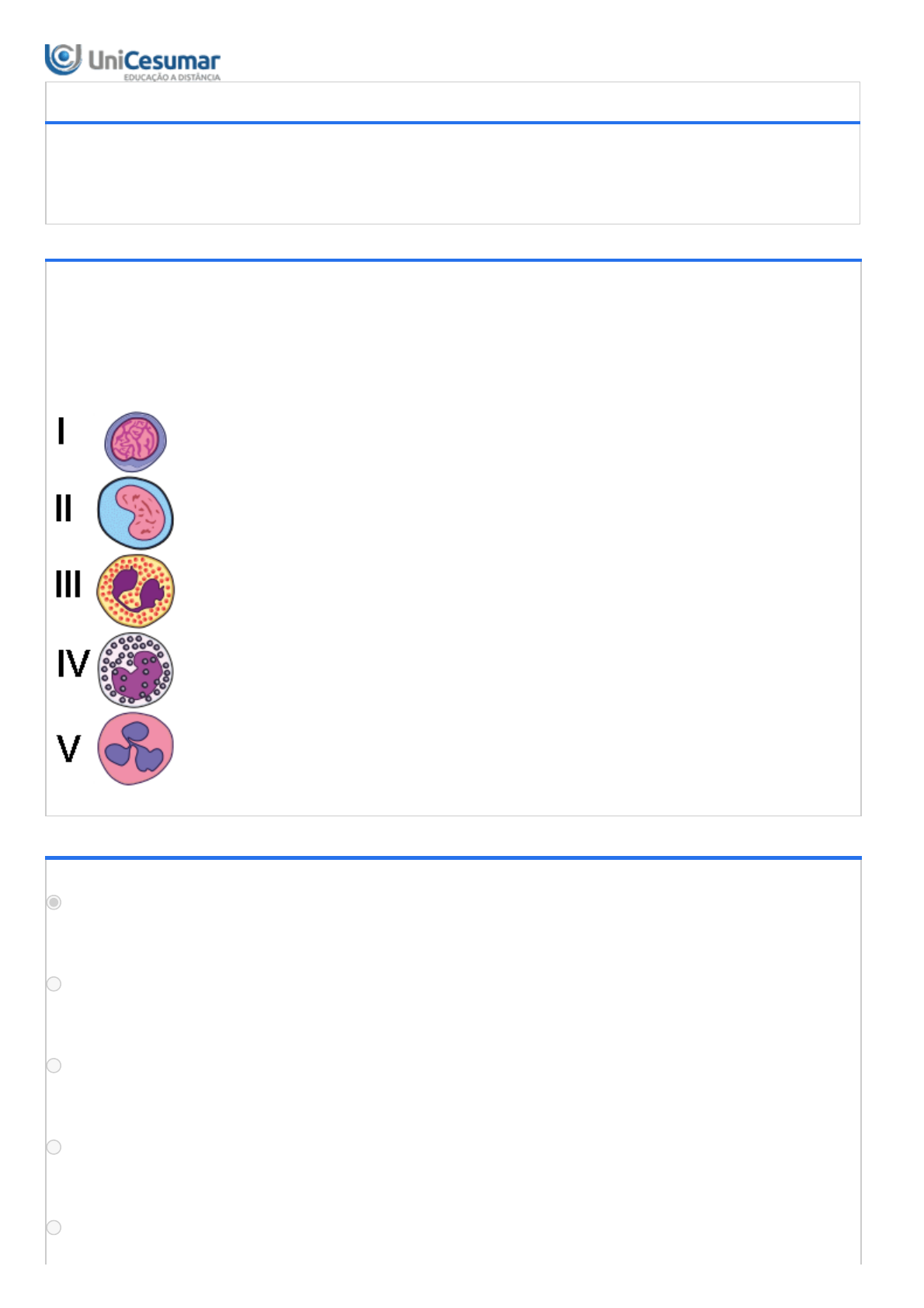 27/06/2022 14:16 Unicesumar - Ensino a Distância 1/6 ATIVIDADE 4 - NUT - IMUNOLOGIA - 52/2022 Período:20/06/2022 08:00 a 08/07/2022 23:59 (Horário de Brasília) Status:ABERTO Nota máxima:1,00 Gabarito:Gabarito será liberado no dia 09/07/2022 00:00 (Horário de Brasília) Nota obtida: 1ª QUESTÃO O sistema imunológico inato dos mamíferos é composto por duas linhas de defesa, a primeira linha corresponde as barreiras biológicos, físicas e químicas. A segunda linha compreende diferentes tipos proteínas e células com fenótipos variados relacionados as diferentes funções de cada uma. Com base na imagem abaixo, analise as características fenotípicas das células, relacione com suas respectivas funções e assinale a alternativa correta: ALTERNATIVAS A célula I é um linfócito que atua em respostas humorais. A célula II é um monócito que atua em respostas fagocíticas. A célula III é um eosinófilo que atua na eliminação de parasitas. A célula IV é um basófilo que atua em respostas alérgica. A célula V é neutrófilo que atua na inflamação. A célula I é um mastócito que atua em respostas alérgicas. A célula II é um eosinófilo que atua em respostas antiparasitárias. A célula III é um neutrófilo que atua na fagocitose de microrganismos. A células IV é um basófilo que atua em respostas inflamatórias. A célula V é um macrófago que atua na eliminação de células metastáticas. A célula I é um basófilo que atua em respostas alérgicas. A célula II é um eosinófilo que atua em respostas antiparasitárias. A célula III é um linfócito que atua na fagocitose de microrganismos. A células IV é um neutrófilo que atua em respostas inflamatórias. A célula V é um natural killer que atua na eliminação de células metastáticas. A célula I é um neutrófilo que atua em respostas alérgicas. A célula II é um eosinófilo que atua em respostas antiparasitárias. A célula III é um basófilo que atua na fagocitose de microrganismos. A células IV é um mastócito que atua em respostas inflamatórias. A célula V é um natural killer que atua na eliminação de células metastáticas. A célula I é uma célula dendrítica que atua em respostas alérgicas. A célula II é um eosinófilo que atua em respostas antiparasitárias. A célula III é um neutrófilo que atua na fagocitose de microrganismos. A células IV é um mastócito que atua em respostas inflamatórias. A célula V é um macrófago que atua na eliminação de células metastáticas. 27/06/2022 14:16 Unicesumar - Ensino a Distância 2/6 2ª QUESTÃO Nayla tinha 31 anos quando engravidou pela terceira vez. Seu grupo sanguíneo era A, Rh-negativo. Seu marido, Danilo era A, Rh-positivo. Seu primeiro filho era um menino saudável. Durante a 2º a gestação, na 29ª semana de gestação, uma amostra de sangue foi coletada do cordão umbilical e exames hematológicos indicaram que o feto estava muito anêmico, foram transfundidos 85 mL de papa de hemácias. Na 35ª semana de gestação, verificou-se que o feto estava suficientemente maduro e o parto foi induzido. Considerando as reações de hipersensibilidade e o caso clínico, analise as assertivas e assinale a alternativa que indica o tipo de reação de hipersensibilidade e respectiva doença do caso: ALTERNATIVAS HP tipo II / Anemia Hemolítica Autoimune HP tipo II / Eritroblastose fetal. HP tipo III / Diabetes mellitus tipo 1. HP tipo III / Púrpura trombocitopênica. HP tipo III / AIDS-HIV. 3ª QUESTÃO Desde o final de 2019, o mundo todo luta diariamente contra a pandemia da COVID-19 causada pelo novo coronavírus (SARS-CoV-2). Uma importante estratégia utilizada na luta contra o vírus foi o desenvolvimento de diferentes tipos de vacinas eficazes contra a SARS-CoV-2, reduzindo a morbidade e a mortalidade. No entanto, a capacidade de uma vacina para prevenir infecções ou doenças, depende criticamente da proteção de indivíduos mais velhos, que estão sob maior risco de doenças graves. Neste cenário, os componentes celulares e humorais da resposta imune adaptativa são responsáveis pelo desenvolvimento de respostas elaboradas e que garantem a sobrevivência de nossa espécie. Considerando as principais características de imunidade adaptativa, assinale a alternativa que apresenta corretamente suas propriedades. I. Na resposta T-dependente, os antígenos de natureza glicídica e proteica são reconhecidos diretamente pelas células B e se e diferenciam em plasmócitos secretores de anticorpos. II. Na resposta T-independente, os linfócitos TCD8+ auxiliam no reconhecimento de antígenos lipídicos e proteicos pelas células B que se e diferenciam em plasmócitos secretores de anticorpos. III. A tolerância imunológica possibilita que o sistema imune seja apresentado aos nossos “antígenos próprios” e mediante a isso, não reaja contra ele, mantendo a homeostasia do organismo. IV. As células TREGs são importantes para o correto funcionamento do sistema imune, elas são responsáveis por inibir as respostas imunológicas quando elas não são mais necessárias ao organismo. Estão corretas: ALTERNATIVAS Apenas I e II. Apenas II e III. Apenas III e IV. Apenas I, II e IV Apenas I, III e IV. 4ª QUESTÃO 27/06/2022 14:16 Unicesumar - Ensino a Distância 3/6 Recentemente, Marcela procurou sua nutricionista Bárbara para elaborar uma nova dieta “gluten-free”. Na semana passada, ela foi diagnosticada com uma doença autoimune do trato gastrointestinal e que afeta, especialmente, o funcionamento do intestino delgado, resultando na atrofia das vilosidades intestinais, hiperplasia de criptas e inflamação. Com base no relato de caso, assinale a doença que Marcela apresenta: ALTERNATIVAS Espondilite Anquilosante Diabetes Mellitus tipo 1 Doença Celíaca Artrite Reumatóide Lúpus Eritematoso Sistêmico 5ª QUESTÃO Carla e Sheila são bailarinas de um famoso grupo de Axé. Elas acabaram de retornar a sua cidade natal ap