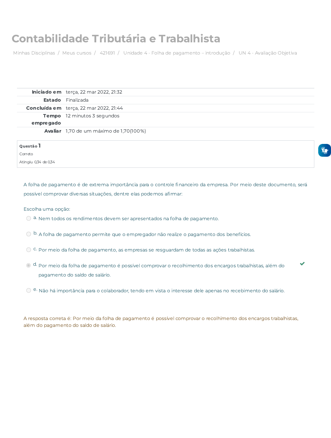 Minhas Disciplinas / Meus cursos / 421691 / Unidade 4 - Folha de pagamento – introdução / UN 4 - Avaliação Objetiva Contabilidade Tributária e Trabalhista Iniciado em terça, 22 mar 2022, 21:32 Estado Finalizada Concluída em terça, 22 mar 2022, 21:44 Tempo empregado 12 minutos 3 segundos Avaliar 1,70 de um máximo de 1,70(100%) Questão 1 Correto Atingiu 0,34 de 0,34 A folha de pagamento é de extrema importância para o controle �nanceiro da empresa. Por meio deste documento, será possível comprovar diversas situações, dentre elas podemos a�rmar: Escolha uma opção: a. Nem todos os rendimentos devem ser apresentados na folha de pagamento. b. A folha de pagamento permite que o empregador não realize o pagamento dos benefícios. c. Por meio da folha de pagamento, as empresas se resguardam de todas as ações trabalhistas. d. Por meio da folha de pagamento é possível comprovar o recolhimento dos encargos trabalhistas, além do pagamento do saldo de salário. e. Não há importância para o colaborador, tendo em vista o interesse dele apenas no recebimento do salário. A resposta correta é: Por meio da folha de pagamento é possível comprovar o recolhimento dos encargos trabalhistas, além do pagamento do saldo de salário. https://avap.multivix.edu.br/my/ https://avap.multivix.edu.br/course/view.php?id=14162 https://avap.multivix.edu.br/course/view.php?id=14162§ion=5 https://avap.multivix.edu.br/mod/quiz/view.php?id=1032047 Questão 2 Correto Atingiu 0,34 de 0,34 Questão 3 Correto Atingiu 0,34 de 0,34 A contribuição sindical é uma questão bem polemica perante os colaboradores, porém suas exigências devem ser cumpridas. Sobre a contribuição sindical, podemos a�rmar: Escolha uma opção: a. O empregador tem o direito de descontar o valor de 10% do salário anualmente. b. A contribuição sindical pode ser descontada mensalmente na folha de pagamento. c. A contribuição sindical é descontada anualmente, especialmente no mês de março se autorizada pelo trabalhador. d. Se autorizada pelo trabalhador deve ser descontada trimestralmente. e. Deve ser descontada anualmente, obrigatoriamente. A resposta correta é: A contribuição sindical é descontada anualmente, especialmente no mês de março se autorizada pelo trabalhador. Os benefícios oferecidos aos colaboradores variam de empresa para empresa, alguns deles são determinados pelas convenções coletivas, se tornando obrigatórias. Na sua grande maioria, esses benefícios não devem ser descontados na sua integralidade na folha de pagamento e sim apenas um percentual determinado por lei, é ele: Escolha uma opção: a. Vale Transporte b. INSS c. FGTS d. Contribuição Sindical e. IRRF A resposta correta é: Vale Transporte Questão 4 Correto Atingiu 0,34 de 0,34 Questão 5 Correto Atingiu 0,34 de 0,34 Na demonstração da folha de pagamento, são apresentados todos os rendimentos e descontos. Porém existem valores que aparecem apenas para �ns de demonstração, sem que sejam descontados, é ele: Escolha uma opção: a. FGTS b. Vale Combustível c. IRRF d. Vale Transporte e. INSS A resposta correta é: FGTS O vale alimentação não é obrigatório pela CLT, porém se constar na Convenção coletiva de trabalho, ela se torna obrigatória. Sobre o vale alimentação, podemos a�rmar: Escolha uma opção: a. A participação �nanceira por parte do trabalhador do VA é limitada a 20%. b. O empregador deve ser responsável pela participação �nanceira total do VA. c. Para conceder o VA, o empregador deve estar cadastrado no PAT. d. O vale alimentação não possui valor mínimo para ser concedido. e. A empresa concede o VA, porém tem o direito de descontar na sua integralidade na folha de pagamento. A resposta correta é: A participação �nanceira por parte do trabalhador do VA é limitada a 20%. ← Conteúdo online Seguir para... Conteúdo online → https://avap.multivix.edu.br/mod/scorm/view.php?id=1032046&forceview=1 https://avap.multivix.edu.br/mod/scorm/view.php?id=1032048&forceview=1