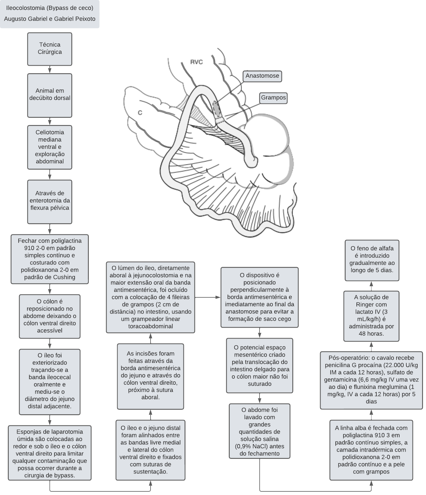 Ileocolostomia (Bypass de ceco) Augusto Gabriel e Gabriel Peixoto Técnica Cirúrgica Animal em decúbito dorsal Celiotomia mediana ventral e exploração abdominal Através de enterotomia da flexura pélvica Fechar com poliglactina 910 2-0 em padrão simples contínuo e costurado com polidioxanona 2-0 em padrão de Cushing O cólon é reposicionado no abdome deixando o cólon ventral direito acessível O íleo foi exteriorizado traçando-se a banda ileocecal oralmente e mediu-se o diâmetro do jejuno distal adjacente. Esponjas de laparotomia úmida são colocadas ao redor e sob o íleo e o cólon ventral direito para limitar qualquer contaminação que possa ocorrer durante a cirurgia de bypass. O íleo e o jejuno distal foram alinhados entre as bandas livre medial e lateral do cólon ventral direito e fixados com suturas de sustentação. As incisões foram feitas através da borda antimesentérica do jejuno e através do cólon ventral direito, próximo à sutura aboral. O lúmen do íleo, diretamente aboral à jejunocolostomia e na maior extensão oral da banda antimesentérica, foi ocluído com a colocação de 4 fileiras de grampos (2 cm de distância) no intestino, usando um grampeador linear toracoabdominal O dispositivo é posicionado perpendicularmente à borda antimesentérica e imediatamente ao final da anastomose para evitar a formação de saco cego O potencial espaço mesentérico criado pela translocação do intestino delgado para o cólon maior não foi suturado O abdome foi lavado com grandes quantidades de solução salina (0,9% NaCl) antes do fechamento A linha alba é fechada com poliglactina 910 3 em padrão contínuo simples, a camada intradérmica com polidioxanona 2-0 em padrão contínuo e a pele com grampos Pós-operatório: o cavalo recebe penicilina G procaína (22.000 U/kg IM a cada 12 horas), sulfato de gentamicina (6,6 mg/kg IV uma vez ao dia) e flunixina meglumina (1 mg/kg, IV a cada 12 horas) por 5 dias A solução de Ringer com lactato IV (3 mL/kg/h) é administrada por 48 horas. O feno de alfafa é introduzido gradualmente ao longo de 5 dias. Grampos Anastomose Ileocolostomia (bypass de ceco) Página 1