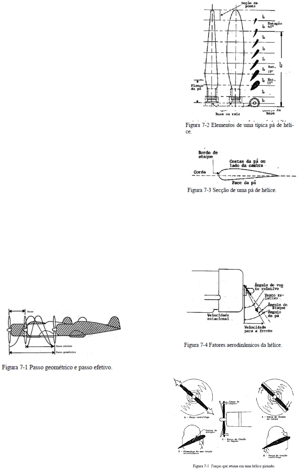 HÉLICES INTRODUÇÃO A hélice, que é a unidade que deve absorver a força fornecida pelo motor, tem passado por muitos estágios de desenvolvimento. Grandes aumentos na produção de força têm resultado no desenvolvimento de hélices de quatro e de seis pás de grandes diâmetros. Entretanto, existe um limite para a rotação, na qual essas grandes hélices podem ser giradas. A força centrífuga em grandes rotações tende a puxar as pás para fora do cubo; excessiva velocidade na ponta da pá pode resultar, não somente em baixa eficiência da pá, como também em flutuação e vibração. PRINCÍPIOS BÁSICOS DAS HÉLICES A hélice de uma aeronave consiste de duas ou mais pás fixadas em um cárter ou cubo central. Cada pá de uma hélice de aeronave é, essencialmente, uma asa rotativa. Como um resultado de sua construção, a pá da hélice produz força, que cria uma tração para puxar ou empurrar a aeronave através do ar. A força necessária para girar as pás é fornecida pelo motor. Em motores de grande potência, ela é montada em um eixo movido por um trem de engrenagens, acoplado ao eixo de manivelas do motor. Em ambos os casos o motor gira o aerofólio das pás através do ar em grandes velocidades, e a hélice transforma a força de rotação do motor em tração. Fatores Aerodinâmicos Uma aeronave, movendo-se através do ar, cria uma força de arrasto em oposição ao deslocamento para a frente. Se uma aeronave estiver em vôo nivelado, ela deverá ter uma aplicação de força que seja igual ao arrasto, mas atuando para a frente. Essa força é chamada de tração. O trabalho feito pela tração é igual a tração vezes a distância percorrida pela aeronave (trabalho = tração x distância). O símbolo usado para a eficiência da hélice é a letra grega eta (.). A eficiência da hélice varia de 50% a 87%, dependendo de quanto a hélice "recua". O recuo da hélice é a diferença entre o passo geométrico da hélice e o passo efetivo (ver a figura 7-1). O passo geométrico é a distância que uma hélice deveria avançar em uma revolução; e o passo efetivo é a distância realmente percorrida. Uma típica pá de hélice pode ser descrita como um aerofólio torcido, de formato irregular. A figura 7-2 apresenta duas vistas de uma pá de hélice. As seções em corte, a cada segmento de seis polegadas, são mostradas na figura 7-2. Identificados também na figura 7-2 estão o flanco e a base da pá. O flanco é a parte grossa e circular próxima da base, a qual é designada a dar resistência à pá. A base da pá, também chamada de raiz é a extremidade de fixação da pá ao cubo da hélice. A ponta da pá é a parte da pá da hélice mais afastada do cubo e, geralmente, definida como as últimas seis polegadas da pá. As costas da pá são, o lado arqueado ou curvado da pá, semelhante a superfície superior de uma asa de aeronave. A face da pá é o lado plano. A corda, é uma linha imaginária que a travessa a pá do bordo de ataque ao bordo de fuga. O bordo de ataque é a borda mais grossa da pá, que vai de encontro ao ar quando a hélice gira. Ângulo da pá, usualmente medido em graus, é o ângulo entre a corda da pá e o plano de rotação (figura 7-4). A corda da pá da hélice é determinada da mesma maneira da corda de um aerofólio. Passo não é a mesma coisa que ângulo da pá, mas, como o passo é determinado pelo ângulo da pá, os dois termos são muitas vezes trocados um pelo outro. O aumento ou diminuição de um é, usualmente, associado com o aumento ou diminuição do outro. Uma hélice girando sofre a ação das forças centrífugas, de torção e de flexão. Uma hélice deve ser capaz de resistir a severos esforços, os quais são mais fortes próximo ao cubo, causados pela força centrífuga e a tração. Uma hélice deve também ser rígida o bastante para evitar flutuação, um tipo de vibração na qual a ponta das pás torcem para trás e para diante, em alta frequência, em torno de um eixo perpendicular ao eixo de manivelas do motor. Flutuação é acompanhada por um barulho característico, muitas vezes confundido com o barulho do escapamento. A constante vibração tende a enfraquecer a pá e, eventualmente, causar uma falha. OPERAÇÃO DA HÉLICE O formato da pá também cria tração, por ser semelhante a uma asa. Consequentemente, o fluxo de ar passando pela hélice, a pressão criada em um dos lados é menor do que do outro. Em uma asa, isto produz uma força de reação na direção da menor pressão. No caso de uma asa, a sua área superior tem menor pressão, e a força (sustentação) é para cima. Aerodinamicamente, então, tração é o resultado do formato da hélice e do ângulo de ataque da pá. Na média, a tração constitui aproximadamente 80% do torque (cavalo-força absorvido pela hélice). Os outros 20% são perdidos na fricção e no recuo. Para qualquer rotação da hélice, a quantidade de ar utilizada depende do ângulo da pá, que determina a quantidade de ar que a hélice necessita. Então, o ângulo da pá é um excelente meio de ajustar a carga na hélice para controlar a rotação do motor. As curvas de sustentação versus arrasto, quando desenhadas para hélices ou para asas, indicam que o ângulo de ataque mais eficiente é um bem pequeno, variando de 2º a 4º positivos. O efetivo ângulo da pá, necessário para manter este pequeno ângulo de ataque, varia com a velocidade de deslocamento da aeronave. Durante a decolagem, quando o torque e a força máxima são requeridos, a hélice de velocidade constante estará em um ângulo ou passo mínimo. O aumento do ângulo da pá aumenta a massa de ar manejada por cada rotação. Isto diminui a rotação do motor, reduzindo o consumo de combustível e desgaste do motor, mantendo o máximo de tração. TIPOS DE HÉLICE Existem vários tipos ou classes de hélice, sendo, as mais simples de todas, as de passo fixo e as ajustáveis no solo. A complexibi