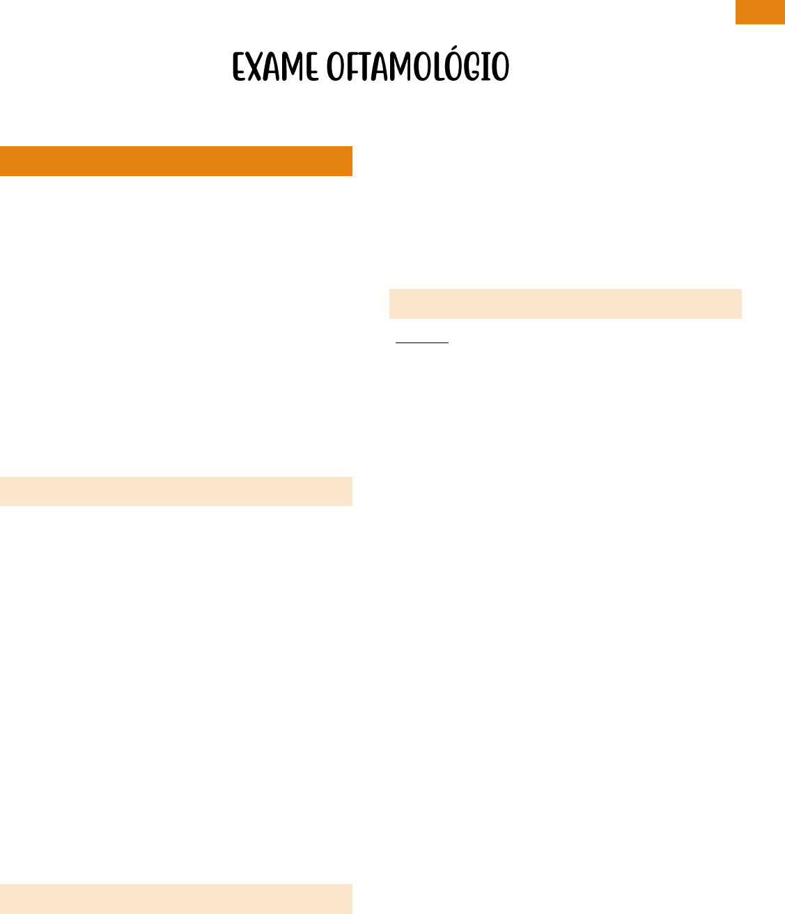 1 LUANNA HONÓRIO PROFESSORA LUIZA TOSCANO – OFTALMO (P8) – 04/02/2022 ETAPAS DO EXAME OCULAR 1. Anamnese 2. Exame ocular externo (ectoscopia) – observa se o paciente tem alguma alteração, algum movimento alterado, descentralização, se tem alguma perda do paralelismo dos olhos, lesão ocular externa etc. 3. Movimentação ocular 4. Acuidade visual 5. Exame de refração 6. Biomicroscopia 7. Exame de fundo de olho 8. Tonometria 9. Exames complementares – se necessário ANAMNESE Queixa principal: início dos sintomas oculares e duração dessa queixa História da moléstia atual: progressiva, súbita? Sintoma associado? Dolorosa? Sofreu algum trauma? Antecedentes pessoais: tem alguma doença sistêmica? HAS, DM, doenças reumatológicas, infecciosas, neoplasias, tabagismo e doenças oculares prévias OBS: Importante perguntar se o paciente possui algum antecedente oftalmológico – usa óculos? Fez cirurgia no olho? Usa alguma medicação ocular/sistêmica com finalidade oftalmológico? Fez uso de tampão? Antecedentes familiares: glaucoma (principal) e ceratocoma. EXAME OCULAR EXTERNO (ECTOSCOPIA) Precisa-se de um foco simples (lanterna, até mesmo do celular), posicionando-o em frente ao rosto do paciente e observa as alterações externas. • Inspeção desarmada das estruturas mais externas do olho e de seus anexos com auxílio de foco luminoso. Nesse exame, podemos identificar desvios oculares, alterações palpebrais, hiperemias oculares, opacificações ou deformações da córnea, perfurações oculares anteriores, cicatrizes, pterígios, alteração da íris e pupila, tumores de pálpebras e conjuntiva, corpo estranho na córnea ou conjuntiva, opacificações etc. MOVIMENAÇÃO OCULAR Objetivo: avaliar a função dos músculos extra-oculares • Teste de Hirschberg: coloca um foco luminoso centralizado mais ou menos 5 a 40cm do paciente, com este olhando em linha reta. Veremos o reflexo desse foco luminoso na córnea do paciente. A partir desse teste, podemos detectar se o paciente apresenta alguma perda do paralelismo dos olhos, o que se chama de estrabismo. • Cover Test: cobre um dos olhos e observa o olho que está descoberto se realiza alguma movimentação, porque às vezes quando se faz o teste de Hirschberg, pode achar que o olho/o reflexo está centralizado, mas quando cobrimos um dos olhos, o olho que está descoberto faz uma movimentação. Isso quer dizer que não estava centralizado. • Uncover test: descobre o olho que havia coberto no cover test e observa se o olho que estava coberto fez alguma movimentação OBS: esses testes vão identificar alguma perda do paralelismo dos olhos, podendo ser uma perda fixa/constante (tropia) ou um desvio latente (heterotrofia). OBS: Identifica ortoforia (alinhamento perfeito dos olhos), heterotrofia (perda do alinhamento) e estrabismo 2 LUANNA HONÓRIO Reflexo de Hirschberg centrado em olho direito e desviado nasalmente em olho esquerdo (porque o reflexo está desviado para dentro – o pontinho branco) = estrabismo manifesto, exotropia 3 LUANNA HONÓRIO Reflexo de Hirschberg centrado em olho direito e desviado nasalmente em olho esquerdo (o reflexo desviou temporalmente): AVALIAÇÃO DA ACUIDADE VISUAL Acuidade visual longe (AVL): medida através de tabelas de optótipos (símbolos) a 6 metros de distância o observador. • Avalia a visão central. • Distância: 6m (20 pés) • Ex: visão 20/20 (o paciente viu a 20 m o que uma pessoa veria normal a 20 m, ou seja, a visão está normal; 20/100 (viu a 20m o que o paciente normal veria a 100m, ou seja, a visão está ruim) (numerador: a distância que o paciente viu o optótipo; denominador: a distância que o paciente veria normalmente esse mesmo optótipo) • Visão conta-dedos (CD) – viu so a 3m, então CD metros; CDFF (frente-face) • Movimentos de mão (MM) • Percepção luminosa (PL): colocar uma gaze/algodão em um dos olhos e vai colocar um foco luminoso em um dos olhos que estamos testando. Acende a luz e pergunta ao paciente se está acesso ou apagado o foco luminoso. Se ele conseguir distinguir, falamos que ele é percepção luminosa positiva, se não PL negativa. Tabela de Snellen: Acuidade visual perto (AVP): medida através da tabela de Jaeger a cerca de 33cm de distância do observador: 4 LUANNA HONÓRIO Tabela Teller: EXAME DE REFRAÇÃO Conceito: procedimento que qualifica e quantifica o erro óptico Avalição objetiva: refração computadorizada ou mecânica (retinoscopia ou equiascopia) – aparelho do balãozinho, o próprio computador faz a leitura do grau do paciente. Pode ser: • Autorefrator (computador/balãozinho) • Retinoscopia/esquiascopia Avaliação subjetiva: teste de lentes (refrator de Greens): Refração objetiva manual/mecânica: BIOMICROSCOPIA Realizada com lâmpada de fenda ou microscópio binocular. Fonte de luz ajustável que oferece ampliação de 6 a 40x, cortes ópticos de diferentes formas, inclinações e intensidades das estruturas oculares. A biomicroscopia vai visualizar estruturas anteriores do olho, segmento anterior e permite avaliar gonioscopia (visualização do ângulo da câmera anterior) e biomicroscopia de fundo de olho com auxílio de lentes acessórias. Lâmpada de fenda: Corte óptico com a lâmpada de fenda; visualiza o reflexo fino e longo; linha da esquerda – é o reflexo da córnea; linha da direta é um reflexo que passa pela íris e pelo cristalino (a parte amarelada que na verdade é pra ser um pouco transparente, então nesse caso, o paciente tem catarata): OBS: A distância entre a duas fendas é o tamanho da câmara anterior. A imagem acima mostra uma câmera estreita, rasa, porque a distância está pequena. OBS: O paciente míope tem uma câmera ampla/maior. EXAME DE FUNDO DE OLHO Biomicroscopia indireta (LF) de fundo de olho: auxílio de lentes de condensação. • Com essa lente, vai conseguir visualizar estruturas da parte posterior do olho = nervo óptico, vasos retinianos, r