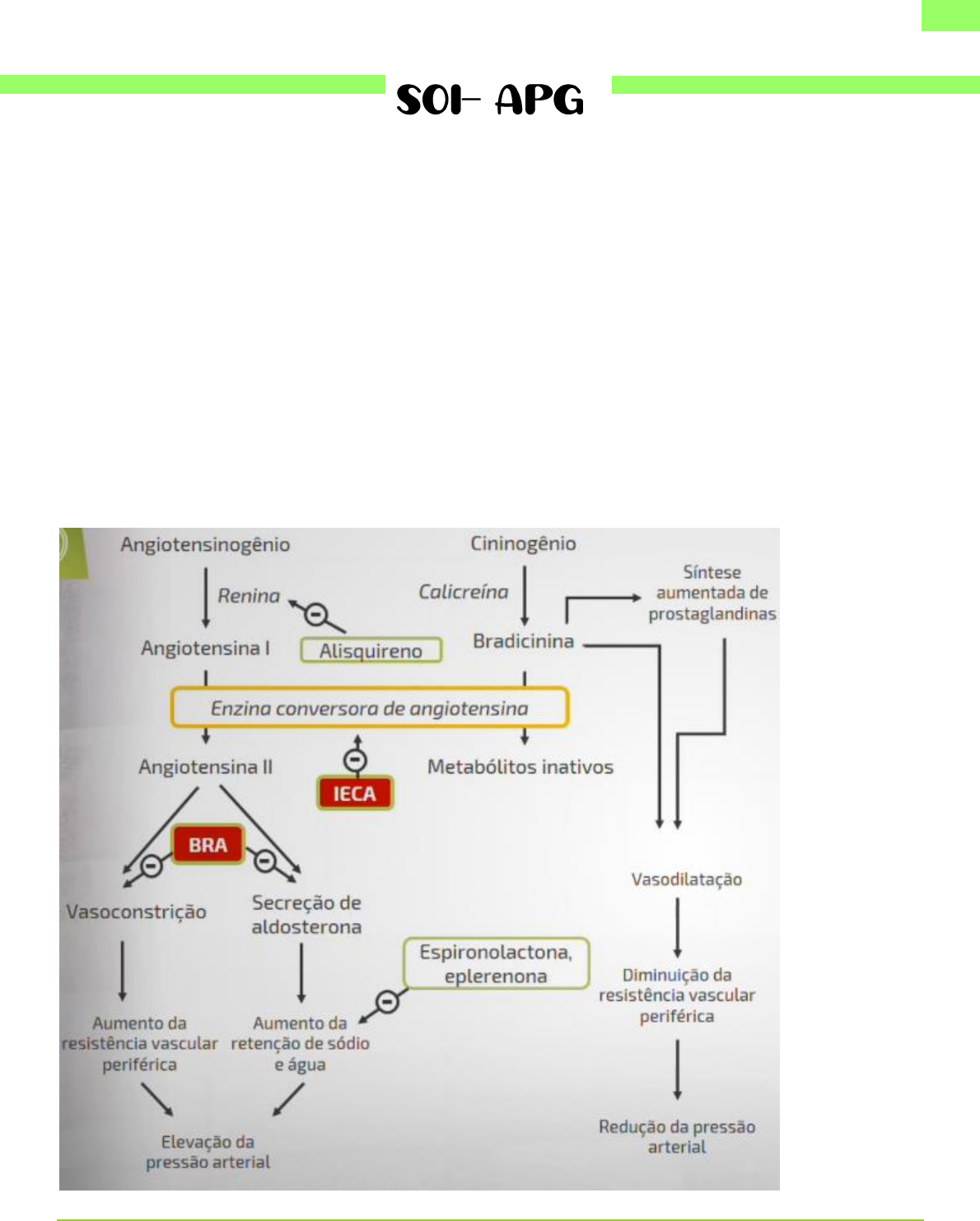 1 GABRIELA 2022.1 MED FIPGBI OBJETIVOS: 1ª: Explicar o mecanismo dos fármacos anti-hipertensivos. 2º: Entender os exames utilizados para diagnosticar a HAS. FÁRMACOS ANTI-HIPERTENSIVOS Pa= DC X RVP DC= DS X FC Maior a resistência vascular periférica, mais difícil é, maior pressão arterial, para vencer a resistência. O sistema SRAA reponde a redução da P.A. RENINA Sintetizada pela resposta da baixa PA e também pela diminuição do Na+ 2 GABRIELA 2022.1 MED FIPGBI Produção pelas células justaglomerulares Atua no angiotensinogênio angiotensina I ANGIOTENSINA Provoca vasoconstrição, Levando a retenção de sódio pela liberação da aldosterona. Pode ser convertida em angiotensina III, na suprarrenal e ambas estimulam a aldosterona Pode ser sintetizada em alguns tecidos periféricos. ALDOSTERONA IECA MECANISMO DE AÇÃO DOS IECA: Atua em todo o corpo; Enzima: peptidil dipeptidase O fármaco atua na inibição dessa enzima; não tem conversão de angiotensina I em angiotensina II, logo, há uma redução da P.A. provocando uma vasodilatação, O sódio é secretado pela urina, havendo uma natriurese. A enzima leva a inativação da bradicinina, logo, há acumulo de bradicinina Reduz a P.A., por reduzir a resistência vascular periférica, por ser um potente vasoconstrictor 3 GABRIELA 2022.1 MED FIPGBI Ex: enalapril, captopril (primeiro a ser criado), EVENTOS ADVERSOS Tosse seca; acumula bradicinina no pulmão e são irritantes para o pulmão. INTERAÇÕES MEDICAMENTOSAS IECA junto com Antiácidos: diminui a absorção. IECA junto com AINES (cronicamente): reduz resposta anti-hipertensiva IECA junto com medicamentos que elevem o potássio: espironolactona; beta-bloqueadores BRA Bloqueadores de receptores de angiotensina Atua nos receptores AT1 (nome do receptor) Antagonismo insuperável: aumentar a angiotensina o quanto for, mas não supera o antagonismo do bloqueio Metabolito ativo: losartana Inibem: contração do musculo liso vascular; respostas pressóricas; liberação de vasopressina e catecolaminas; aumento do tônus simpáticos; BRA X IECA Tanto faz; Normalmente se usa mais os IECAS por ser mais barato, porém, tanto faz; Não pode BRA e IECA ao mesmo tempo MECANISMO DE AÇÃO Bloqueia os receptores de AT1, não permitindo que a angiotensina 2 atue sobre eles. Logo, isso reduz a P.A, por vasodilatação. LOSARTANA, WALSARTANA (O ALIMENTO DIMINUI A ABSORÇÃO), EVENTOS ADVERSOS Menor tosse que os IECAS, mas mesmo assim, pode levar a tosse. Menos angiodema que os IECAs, mas pode aparecer Contraindicado na gestação DIURÉTICOS 4 GABRIELA 2022.1 MED FIPGBI ALÇA DE HENLE Parte descendente, há a reabsorção de agua para a medula renal. Parte ascendente, fecha os canais para a água, e abre os de eletrólitos (Na+, K+ e 2Cl-), sendo reabsorvidos para nossa medula renal. DIURÉTICOS DE ALÇA – FUROSEMIDA Tem mecanismo de ação, na alça de henle, especialmente no ramo ascendente espesso Cotransportaodr Na+/K+/2Cl- --------------------- inibe o cotransportador (deixando de ter a reabsção para a medula renal) Ele inibe a osmolaridade medular, gerando uma diurese aumentada Normal: 5 GABRIELA 2022.1 MED FIPGBI Pois quando a urina final chega nos canais de aquaporinas, ela é reabsorvida e volta para o plasma; Ação do fármaco Diurese aumentada e a P.A diminui Eliminação de 15 a 25% de sódio filtrado TÚBULO CONTORCIDO DISTAL Temos a reabsorção (sai do túbulo e volta para o plasma) de agua e íons (Na + e Cl-) TIAZÍDICOS- HIDROCLOROTIAZIDA Mecanismo de ação: age no túbulo contorcido distal DUCTO COLETOR (CORTICAL) Aldosterona faz a troca de Na+ por H2O ou H+ Teremos sódio na urina e potássio e hidrogênio, no nosso plasma (sangue) 6 GABRIELA 2022.1 MED FIPGBI “Perdendo hidrogênio e potássio no nosso plasma” POUPADORES DE K+- ESPIRONOLACTONA Mecanismo de ação no ducto coletor (porção cortical) Competem com a aldosterona Cotransportador de Na+ por H2O ou H+ são inibidos. Se ligando a eles e deixando a aldosterona de lado. Causando uma natriurese BLOQUEADORES DOS CANAIS DE CÁLCIO TIPOS: di-hidropiridinas: Amlodipino: meia vida de 30 – 50 horas Nifedipino: meia vida de 4 horas Não di-hidropiridinas: Nerapanil Diltiazem COMO ATUAM OS BCC? 7 GABRIELA 2022.1 MED FIPGBI Eles bloqueiam os canais de cálcio. Cálcio é necessário para haver a contração da musculatura lisa. Sem cálcio entrando na célula, sem contração muscular do miocárdio. 8 GABRIELA 2022.1 MED FIPGBI EXAMES UTILIZADOS PARA DIAGNOSTICAR A HAS. Avaliação laboratorial: Avaliar os sinais e sintomas do paciente. Eletrocardiograma em repouso: de repouso significa parado, deitado, descansado, sem se movimentar para que o exame tenha sua plena efetividade na detecção de doenças cardíacas. O oposto do ECG em repouso é o ECG de esforço. Neste caso o paciente anda e até corre numa esteira, alternativamente pedala numa bicicleta ergométrica para elevar os batimentos cardíacos e deixar o exame mais preciso. É um exame de avaliação da atividade elétrica do coração através de eletrodos fixados na pele. A partir disso, é possível detectar o ritmo do coração e o número de batimentos por minuto. Urina simples; Glicemia de jejum (sangue); Sódio e potássio (sangue); Creatinina (sangue); Colesterol total, HDL e triglicerídeos (sangue); Hemograma (sangue);