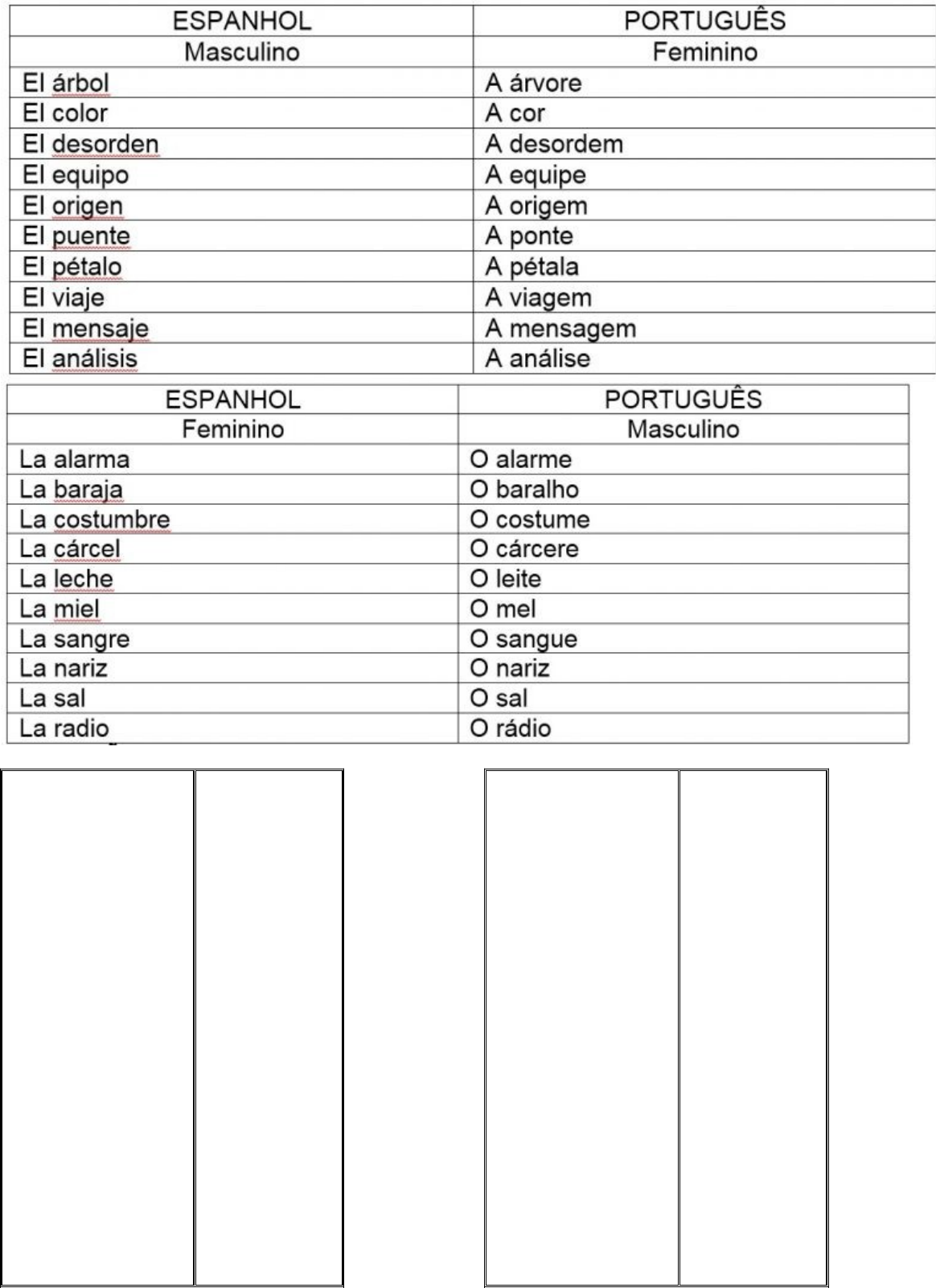Espanhol apellido ancho berro bolsa brincar caprichoso carro carroza cartera cena cepillo cerrar coche cola contestar copa crianza criatura cubiertos cuello débil embarazada enojado escena escoba escritorio estofado exquisito fechar flaco fuente jamón jugar largo listo lívido luego morado oficina ofuscar oso pasta pelirrojo pelo perejil prejuicio presunto prolijo pronto rango raro / extraño rasgo rato ratón reto rojo rubio salsa sitio sobrenombre / apodo sótano taller taza tirar todavía vaso zueco zurdo Português sobrenome largo agrião saco / sacola pular teimoso charrete carruagem bolsa jantar escova fechar carro cauda responder taça criação criança talheres pescoço fraco grávida zangado cena vassoura escrivaninha carne com molho gostoso / bom datar magro bandeja / fonte presunto brincar longo / comprido esperto / pronto arroxeado depois roxo escritório enfurecer urso massa ruivo cabelo salsa preconceito suposto caprichoso logo classe / posição esquisito traço momento rato desafio vermelho loiro molho lugar apelido porão ateliê / oficina xícara puxar / atirar ainda copo tamanco canhoto