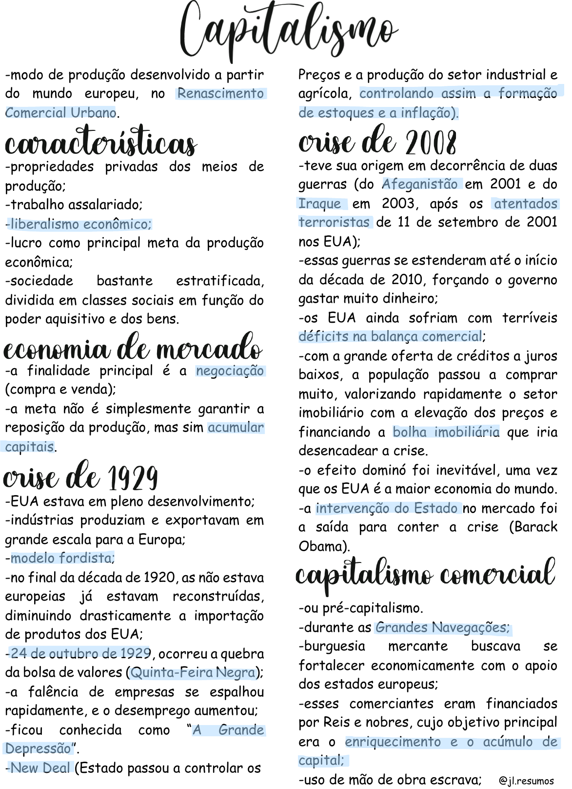 -modo de produção desenvolvido a partir do mundo europeu, no Renascimento Comercial Urbano. -propriedades privadas dos meios de produção; -trabalho assalariado; -liberalismo econômico; -lucro como principal meta da produção econômica; -sociedade bastante estratificada, dividida em classes sociais em função do poder aquisitivo e dos bens. -a finalidade principal é a negociação (compra e venda); -a meta não é simplesmente garantir a reposição da produção, mas sim acumular capitais. -EUA estava em pleno desenvolvimento; -indústrias produziam e exportavam em grande escala para a Europa; -modelo fordista; -no final da década de 1920, as não estava europeias já estavam reconstruídas, diminuindo drasticamente a importação de produtos dos EUA; -24 de outubro de 1929, ocorreu a quebra da bolsa de valores (Quinta-Feira Negra); -a falência de empresas se espalhou rapidamente, e o desemprego aumentou; -ficou conhecida como “A Grande Depressão”. -New Deal (Estado passou a controlar os Preços e a produção do setor industrial e agrícola, controlando assim a formação de estoques e a inflação). -teve sua origem em decorrência de duas guerras (do Afeganistão em 2001 e do Iraque em 2003, após os atentados terroristas de 11 de setembro de 2001 nos EUA); -essas guerras se estenderam até o início da década de 2010, forçando o governo gastar muito dinheiro; -os EUA ainda sofriam com terríveis déficits na balança comercial; -com a grande oferta de créditos a juros baixos, a população passou a comprar muito, valorizando rapidamente o setor imobiliário com a elevação dos preços e financiando a bolha imobiliária que iria desencadear a crise. -o efeito dominó foi inevitável, uma vez que os EUA é a maior economia do mundo. -a intervenção do Estado no mercado foi a saída para conter a crise (Barack Obama). -ou pré-capitalismo. -durante as Grandes Navegações; -burguesia mercante buscava se fortalecer economicamente com o apoio dos estados europeus; -esses comerciantes eram financiados por Reis e nobres, cujo objetivo principal era o enriquecimento e o acúmulo de capital; -uso de mão de obra escrava; @jl.resumos -moeda substituindo o sistema de trocas; -relações bancárias; -fortalecimento do poder da burguesia; -formação de uma estrutural social de desigualdades; - o mercantilismo, metalismo e o pacto colonial foram marcas dessa fase. -a Primeira Revolução Industrial trouxe profundas transformações nos meios de produção (máquina a vapor, tear mecânico, uso do carvão mineral); -fabricantes aumentaram suas margens de lucro, permitindo uma oferta maior com preços mais baixos; -Congresso ou Conferência de Berlim, foi responsável pela partilha da África, que foi explorada pelos europeus; -neocolonialismo; -surgiu a doutrina do liberalismo econômico. -ou monopolista. -a circulação de dinheiro e o capital bancário definem a maior parte do investimento mundial; -as fusões e incorporações começaram a formar grandes monopólios e oligopólios; -domínio do mercado pelas grandes empresas; -com a Terceira Revolução Industrial, o capitalismo atingiu sua fase mais global; -rapidez do fluxo de capitais, de mercadorias (bens) e de informações; -redes interligadas pela internet; -valorização das empresas ligadas ao desenvolvimento tecnológico; -valorização do trabalhador qualificado; -grande produção e comercialização de produtos tecnológicos. @jl.resumos