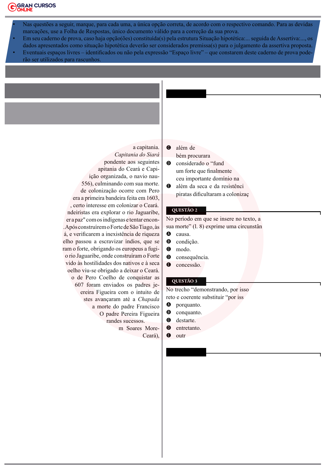• Nas questões a seguir, marque, para cada uma, a única opção correta, de acordo com o respectivo comando. Para as devidas marcações, use a Folha de Respostas, único documento válido para a correção da sua prova. • Em seu caderno de prova, caso haja opção(ões) constituída(s) pela estrutura Situação hipotética:... seguida de Assertiva:..., os dados apresentados como situação hipotética deverão ser considerados premissa(s) para o julgamento da assertiva proposta. • Eventuais espaços livres – identificados ou não pela expressão “Espaço livre” – que constarem deste caderno de prova pode- rão ser utilizados para rascunhos. ASSEMBLEIA LEGISLATIVA DO CEARÁ – TÉCNICO LEGISLATIVO SIMULADO AL/CE – TÉCNICO LEGISLATIVO � Baseado no formato de prova � aplicado pela banca Cebraspe CONHECIMENTOS GERAIS LÍNGUA PORTUGUESA (MÁRCIO WESLEY) 1 As terras atualmente pertencentes ao Ceará foram doadas, em 1535, a Antônio Cardoso de Barros, mas este não se interes- sou em colonizá-las e nem sequer chegou a visitar a capitania. Ironicamente, quando Barros decide vir à Capitania do Siará 5 (como era conhecida a região correspondente aos seguintes lotes: Capitania do Rio Grande, Capitania do Ceará e Capi- tania do Maranhão), em expedição organizada, o navio nau- fraga na costa de Alagoas (1556), culminando com sua morte. A primeira tentativa séria de colonização ocorre com Pero 10 Coelho de Sousa, que lidera a primeira bandeira feita em 1603, demonstrando, por isso, certo interesse em colonizar o Ceará. � A missão dos bandeiristas era explorar o rio Jaguaribe, combater piratas, "fazer a paz" com os indígenas e tentar encon- trar metais preciosos. Após construírem o Forte de São Tiago, às 15 margens do rio Ceará, e verificarem a inexistência de riqueza na região, Pero Coelho passou a escravizar índios, que se revoltaram e destruíram o forte, obrigando os europeus a fugi- rem para as ribeiras do rio Jaguaribe, onde construíram o Forte de São Lourenço. Devido às hostilidades dos nativos e à seca 20 de 1605-1607, Pero Coelho viu-se obrigado a deixar o Ceará. � Diante do fracasso de Pero Coelho de conquistar as nações indígenas, em 1607 foram enviados os padres je- suítas Francisco Pinto e Pereira Figueira com o intuito de evangelizar os silvícolas. Estes avançaram até a Chapada 25 da Ibiapaba, onde ficaram até a morte do padre Francisco Pinto em outubro do mesmo ano. O padre Pereira Figueira retorna a Pernambuco em 1608, sem grandes sucessos. � Em 1612, sob o comando de Martim Soares More- no (considerado posteriormente o "fundador" do Ceará), 30 foi construído, às margens do Rio Ceará, o Forte de São Sebas- tião, local conhecido atualmente como Barra do Ceará (divisa entre os Municípios de Fortaleza e Caucaia). � A colonização da região, iniciada no século XVII, foi di- ficultada pela forte oposição das tribos indígenas e as invasões 35 de piratas europeus. Só tomou impulso com a construção, na embocadura do riacho Marajaitiba, do forte holandês Schoonenborch, que, em 1654, foi tomado pelos portugueses e passou a ser chamado Fortaleza de Nossa Senhora de Assunção. Em volta dessa Fortaleza, formou-se a segunda vila do 40 Ceará, a vila do Forte, ou Fortaleza. Depois de muita disputa política entre Aquiraz e Fortaleza, a última passou a ser a capi- tal do Ceará, oficialmente a partir de 13 de abril de 1726 (data em que se comemora o aniversário da cidade). Trecho extraído de: <https://cearacultural.com.br/gente/ historia-do-ceara.html> (com adaptações). QUESTÃO 1 Com base no texto, é correto inferir que A a dificuldade em desbravar terras inóspitas e em fazer frente a indígenas hostis levou Antônio Cardoso a não se interessar pela colonização das terras atualmente pertencentes ao Ceará. B o primeiro contato com os indígenas foi feito por padres je- suítas, que não tiveram sucesso em formar vínculo amistoso. C além de explorar as riquezas da região, os bandeiristas tam- bém procuraram escravizar índios. D considerado o “fundador do Ceará”, Martim Soares construiu um forte que finalmente opôs resistência aos índios e estabele- ceu importante domínio na região. E além da seca e da resistência indígena, também invasões de piratas dificultaram a colonização do Ceará pelos portugueses. QUESTÃO 2 No período em que se insere no texto, a oração “culminando com sua morte” (l. 8) exprime uma circunstância de A causa. B condição. C modo. D consequência. E concessão. QUESTÃO 3 No trecho “demonstrando, por isso, certo interesse” (l. 11), é cor- reto e coerente substituir “por isso” por A porquanto. B conquanto. C destarte. D entretanto. E outrossim. QUESTÃO 4 Está correto o emprego do sinal de crase em “decide vir à Capita- nia do Siará” (l. 4), como também em A Decidiu vir à Fortaleza. B Fez referência à todas as terras. C Manteve os índios à distância. D Dois padres jesuítas dedicaram-se à evangelização de índios. E Não se interessou em colonizar às suas terras. https://cearacultural.com.br/turismo/serra-da-ibiapaba.html https://cearacultural.com.br/turismo/serra-da-ibiapaba.html https://cearacultural.com.br/turismo/praias/barra-do-ceara.html https://cearacultural.com.br/turismo/praias/prainha.html https://cearacultural.com.br/gente/historia-do-ceara.html https://cearacultural.com.br/gente/historia-do-ceara.html SIMULADO AL/CE – TÉCNICO LEGISLATIVO QUESTÃO 5 No texto, o trecho “Estes avançaram até a Chapada da Ibiapaba, onde ficaram até a morte do padre Francisco Pinto em outubro do mesmo ano. O padre Pereira Figueira retorna a Pernambuco em 1608, sem grandes sucessos.” (l. 24-27) permaneceria gramatical- mente correto e com seu sentido original caso A uma vírgula fosse inserida logo após “Francisco Pinto”. B a vírgula empregada após “Ibiapaba” fosse substituída por ponto e vírgula. C a vírgula empre