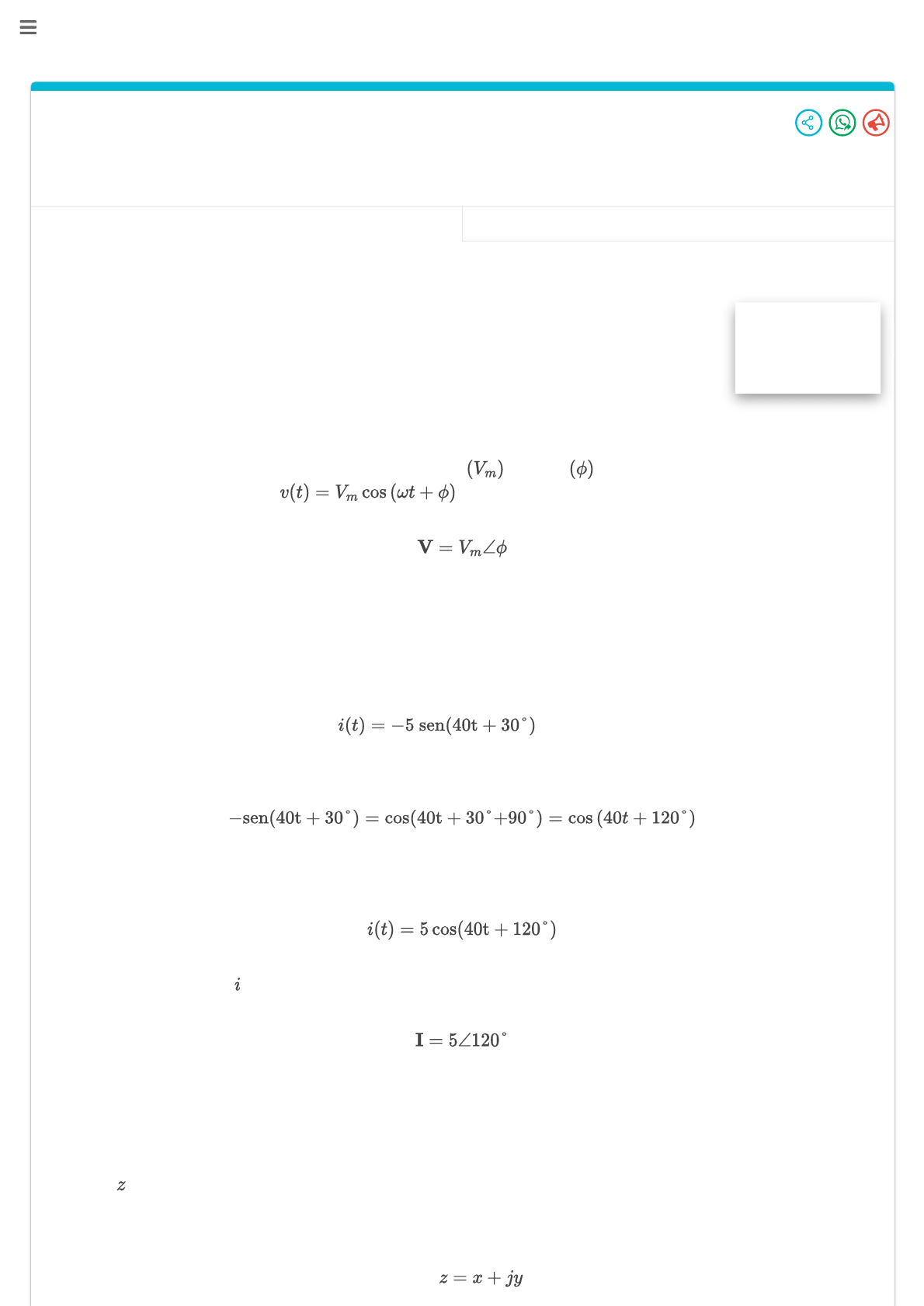 Teoria Exercício de Fixação (13) 1. A impedância e o fasor Fasores Alternar para video >> 10min E aí, beleza? Agora vamos aprender uma coisa que vai nos facilitar muito, muito mesmo, que é o fasor. Mas o que é isso? Fasor é um número complexo que representa a amplitude e a fase de uma senóide. Ou seja, podemos, por exemplo, expressar a tensão simplesmente assim: Viu só? Muito mais simples do que aquelas expressões com senos e cossenos. Mas temos que ter o cuidado com duas coisas: a tensão ou a corrente têm que estar expressas em cosseno e a frequência tem que ser a mesma para todo o circuito, o que geralmente acontece, para podermos usar a representação fasorial. Por exemplo, vamos escrever a corrente na forma fasorial. Nosso primeiro passo é expressar a corrente em cosseno. Como Logo, Então, a forma fasorial de é Forma retangular, polar e exponencial Como o fasor é um número complexo, vamos ver as formas de representá-lo. Podemos representar um número complexo de três maneiras. 1. Forma retangular: T https://app.respondeai.com.br/aprender/99641/topico/114/1393/teoria/1310 https://app.respondeai.com.br/aprender/99641/topico/114/1393/exercicio/6054 Onde , é a parte real e é a parte imaginária de . 2. Forma polar: Onde é o módulo e é o ângulo de fase. 3. Forma exponencial: As formas polar e retangular se relacionam como na figura abaixo: Portanto, sabendo e , podemos determinar e fazendo Ou, se conhecemos e , podemos obter e fazendo Essas relações são muito importantes, porque geralmente para operações de adição e subtração nós utilizamos a forma retangular, enquanto que em multiplicação e divisão utilizamos a forma polar. Portanto, dependendo do exercício, vamos precisar transformar o fasor de uma forma para outra e vamos fazer isso utilizando essas relações. Operações com número complexo Vamos ver como funcionam as operações em números complexos que mais utilizaremos daqui em diante. Para isso, vamos supor que temos dois números complexos genéricos: Adição: Subtração: Multiplicação: Divisão: Recíproco: Raiz quadrada: Conjugado Complexo: Para você entender melhor, vamos determinar o número complexo dado pela expressão: Transformando para forma retangular: Substituindo, Fazendo a adição no numerador e sabendo que é igual a , temos Para efetuar a divisão precisamos passar os números para forma polar: Portanto, Diagrama fasorial Em alguns exercícios pode ser pedido o diagrama fasorial, mas não é preciso se desesperar. Esse diagrama nada mais é do que a representação gráfica dos fasores. Por exemplo, vamos fazer o digrama fasorial dos fasores e . Como podemos ver, os fasores são como vetores e por isso são representados por uma letra maiúscula em negrito. Eles apresentam módulo e “direção”, que no caso é o ângulo de fase do fasor. Além disso, em um mesmo circuito, eles apresentam a mesma frequência angular, ou seja, é como se ambos tivessem a mesma rotação de . Por isso, a representação em forma de fasor é dita como a representação no domínio da frequência. Então a gente tem as seguintes representações: Agora é a hora de praticar bastante para fixar o que se aprendeu. í í ê Ir para exercícios E aí, este texto te ajudou? Passou longe! Meh! Demais! https://app.respondeai.com.br/aprender/99641/topico/114/1393/exercicio/6054