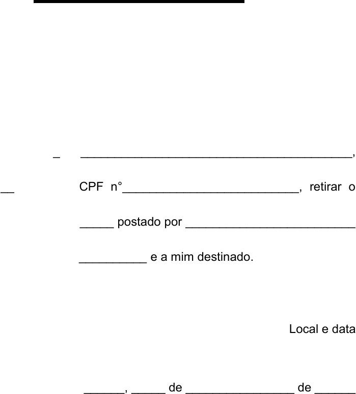 AUTORIZAÇÃO Autorizo ________________________________________________________, RG n°________________, CPF n°__________________________, retirar o objeto n°_____________________ postado por _________________________ _________________________________ e a mim destinado. Local e data ___________________, _____ de ________________ de ______ __________________________________________ Nome: RG: CPF:
