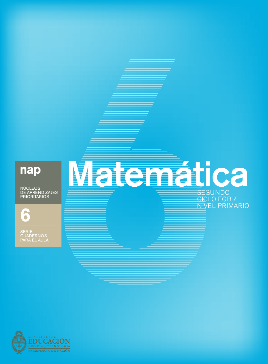 2 Ministerio de Educación Ciencia y Tecnología de la Nación Cuadernos para el aula: Matemática 6. - 1a ed. - Buenos Aires: Ministerio de Educación, Ciencia y Tecnología de la Nación, 2007. 200 p.; 22 x 17 cm. ISBN 978-950-00-0628-6 1. Formación Docente. I. Título CDD 371.1 3 Presidente de la Nación Dr. Néstor Kirchner Ministro de Educación, Ciencia y Tecnología Lic. Daniel Filmus Secretario de Educación Lic. Juan Carlos Tedesco Subsecretaria de Equidad y Calidad Educativa Lic. Alejandra Birgin Directora Nacional de Gestión Curricular y Formación Docente Lic. Laura Pitman Subsecretaría de Equidad y Calidad Educativa Área de producción pedagógica Cuadernos para el aula Coordinación y supervisión pedagógica general Adela Coria Equipo del Área de Matemática, de la Dirección Nacional de Gestión Curricular y Formación Docente Coordinación y supervisión pedagógica Mónica Agrasar Silvia Chara Graciela Chemello Autores Yudith Murugarren Olga Vírgola Área de producción editorial Coordinación de Publicaciones Raquel Franco Brenda Rubinstein, Asistencia de coordinación Silvana Franzetti, Edición Félix De las Mercedes, Corrección Carolina Mikalef, Alejandro Luna, Dirección de arte Geni Espósito, Coordinación gráfica Alberto Caut, Diagramación Mariana Pereyra, Gastón Caba, Eugenia Mas, Ilustración María Celeste Iglesias, Documentación Ministerio de Educación, Ciencia y Tecnología 4 Serie Cuadernos para el aula En las décadas pasadas, diversos procesos económicos, sociales y políticos que tuvieron lugar en nuestro país pusieron en crisis el sentido de nuestra democra- cia. Aún la sociedad argentina es profundamente desigual a lo largo y a lo ancho de nuestro territorio. Estamos realizando importantes esfuerzos en materia de políticas públicas que revelan indicios alentadores en el proceso de contribuir a revertir esas desigualdades. Pero ello no ha sido hasta ahora suficiente. Niñas, niños y jóvenes son parte de una realidad donde la pobreza y la exclusión social expresan todavía de manera desgarradora la enorme deuda que tenemos con ellos y con su futuro. Las brechas sociales se manifiestan también en la fragmentación de nues- tro sistema educativo, en la desigualdad de trayectorias y aprendizajes, y en las dificultades que enfrentan los docentes al momento de enseñar. En las circunstancias más difíciles, las escuelas se sostuvieron como uno de los lugares en los que se continuó albergando un sentido de lo público, res- guardando las condiciones para que hayamos podido volver a pensar en la posi- bilidad de un todos. Maestros y maestras redoblan sus esfuerzos, persisten en la búsqueda de alternativas, y todos los días ponen en juego su saber en la cons- trucción de nuevas prácticas. Al reasumir desde el Estado la responsabilidad de acompañar el trabajo coti- diano de los docentes, buscamos recrear los canales de diálogo y de aprendi- zaje, afianzar los espacios públicos y garantizar las condiciones para pensar colectivamente nuestra realidad y, de este modo, contribuir a transformarla. Creemos que es preciso volver a pensar nuestra escuela, rescatar la impor- tancia de la tarea docente en la distribución social del conocimiento y en la recreación de nuestra cultura, y renovar nuestros modos de construir la igualdad, restituyendo el lugar de lo común y de lo compartido, y albergando a su vez la diversidad de historias, recorridos y experiencias que nos constituyen. 5 Presentación Transitamos una época de incertidumbre, de cuestionamientos y frustracio- nes. No nos alcanza con lo que tenemos ni con lo que sabemos. Pero tenemos y sabemos muchas cosas, y estamos vislumbrando con mayor nitidez un horizon- te alentador. Como educadores, nos toca la inquietante tarea de recibir a los nuevos alum- nos y de poner a disposición de todos y de cada uno de ellos nuestras mejores herramientas de indagación, de pensamiento y de creación. En el encuentro que se produce entre estudiantes y docentes reside la posibilidad de la transmisión, con todo lo que ello trae de renovación, de nuevos interrogantes, de replanteos y de oportunidades para cambiar el mundo en el que vivimos. Lo prioritario hoy es recuperar y consolidar la enseñanza como oportunidad de construir otro futuro. Frente a ese desafío y el de construir una sociedad más justa, las escuelas tienen encomendada una labor fundamental: transmitir a las nuevas generacio- nes los saberes y experiencias que constituyen nuestro patrimonio cultural. Educar es un modo de invitar a los niños y a los jóvenes a protagonizar la histo- ria y a imaginar mundos cada vez mejores. La escuela puede contribuir a unir lo que está roto, a vincular los fragmentos, a tender puentes entre el pasado y el futuro. Estas son tareas que involucran de lleno a los docentes en tanto trabajadores de la cultura. La escuela también es un espacio para la participación y la integración; un ámbito privilegiado para la ampliación de las posibilidades de desarrollo social y cultural del conjunto de la ciudadanía. Cada día, una multitud de chicos y chicas ocupa nuestras aulas. Cada día, las familias argentinas nos entregan a sus hijos, porque apuestan a lo que podemos darles, porque confían en ellos y en nosotros. Y la escuela les abre sus puertas. Y de este modo no solo alberga a chicos y chicas, con sus búsquedas, necesi- dades y preguntas, sino también a las familias que, de formas heterogéneas, diversas, muchas veces incompletas, y también atravesadas por dolores y reno- vadas esperanzas, vuelven una y otra vez a depositar en la escuela sus anhelos y expectativas. Nuestros son el desafío y la responsabilidad de recibir a los nue- vos, ofreciéndoles lo que tenemos y, al mismo tiempo, confiando en que ellos emprenderán la construcción de algo distinto, algo que nosotros quizás no ima- ginamos todavía. En la medida en que nuestras aulas sean espacios donde podamos someter a revisión y crí
