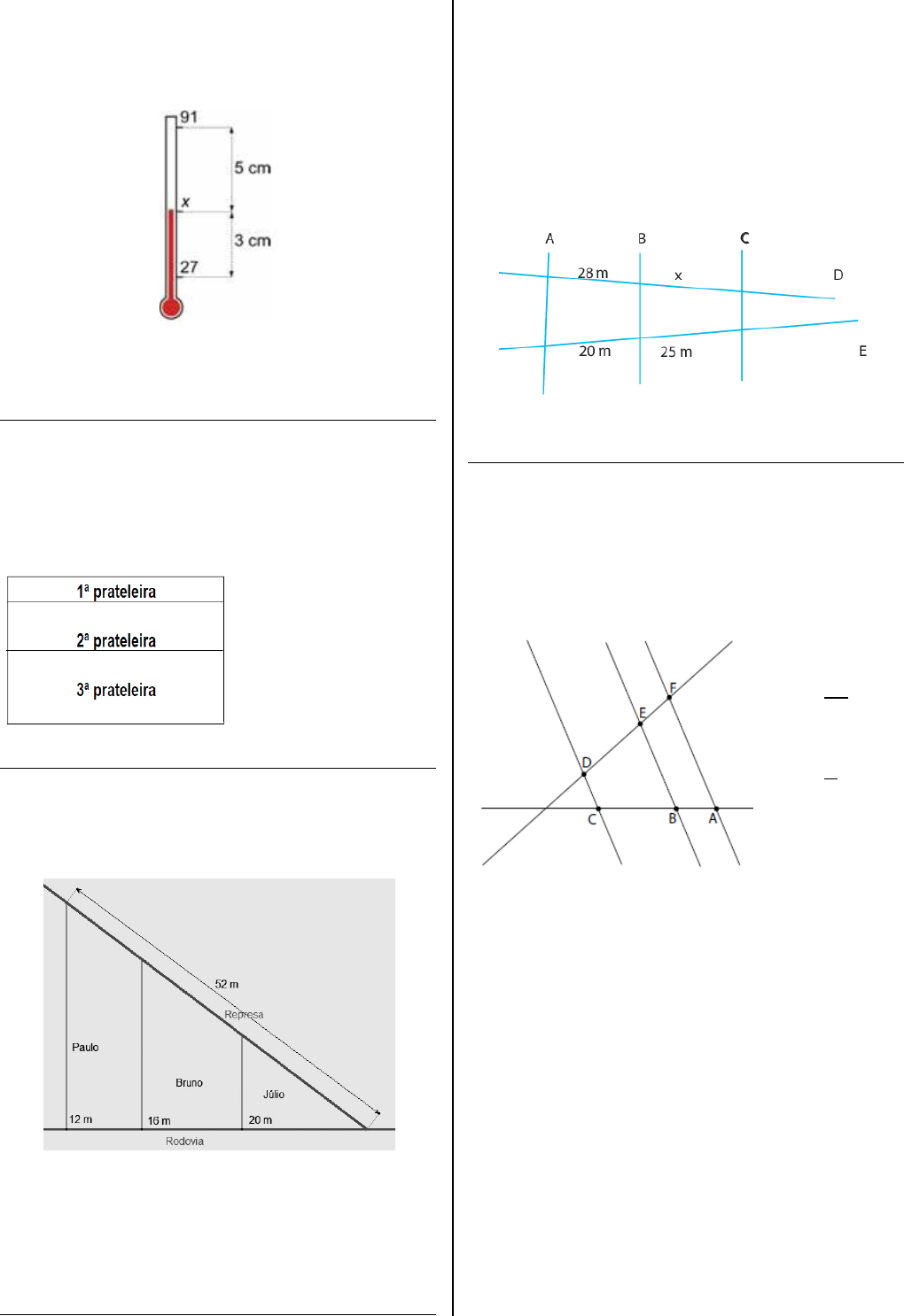 1. Kátia encontrou um termômetro com marcação numa escala desconhecida. Havia apenas dois números com marcação legível. Para encontrar a temperatura marcada naquele momento, Kátia achou uma boa ideia fazer medições com sua régua, em cm, conforme a figura a seguir. Qual o valor que Kátia encontrou para a temperatura x? (A) 31. (B) 41. (C) 51. (D) 61. 2. Cristina vai fazer um armário para guardar os produtos de limpeza e utensílios domésticos. Percebeu que para ocupar melhor o espaço deve organizar as prateleiras internas em três alturas diferentes: a segunda prateleira terá o dobro da altura da primeira e, a terceira, o triplo da altura da primeira. A altura total do armário é 1,80 m. Pode-se afirmar que as alturas das primeira, segunda e terceira prateleiras são, nesta ordem e, em cm, iguais a A) 30, 60 e 90. B) 20, 70, e 90. C) 40, 80 e 120. D) 35, 70 e 75. 3. Tio Paulo, tio Bruno e tio Júlio têm sítios vizinhos. Os sítios são delimitados, na frente, pela rodovia, e atrás, pela represa. Eles sabem que os três sítios tomam 52 m da margem da represa. A frente do sítio do tio Paulo tem 12 m, do tio Bruno, 16 m e do tio Júlio, 20 m. Qual dos sítios pega a maior parte dos 52 m da margem da represa? A) Tio Bruno. B) Tio Paulo. C) Tio Júlio. D) Os três têm fundos de mesma medida. 4. O desenho a seguir representa uma quadra fiscal da prefeitura, representando as ruas A, B, C, D, E As medidas abaixo representam os lotes que tem frente para a rua E e para rua D. A medida de X, representado na figura, vale em metros: ( Considerar: A//B//C ) O desenho a seguir representa uma quadra fiscal da Prefeitura, representando as ruas A, B, C, D, E. As medidas abaixo representam medidas abaixo representam os lotes A) 26. B) 28. C) 30. D) 35. 5. Na figura a seguir, temos a representação de feixes de retas paralelas (CD//BE//AF) inteceptados por duas retas congruentes (FD x AC) Sabendo-se que as medidas dos segmentos AB, BC e DE são 2, 3 e 5 unidades, respectivamente, conclui-se, corretamente, que a medida do segmento EF, em unidades, é (A) 10 3 (B) 3 (C) 8 3 (D) 2