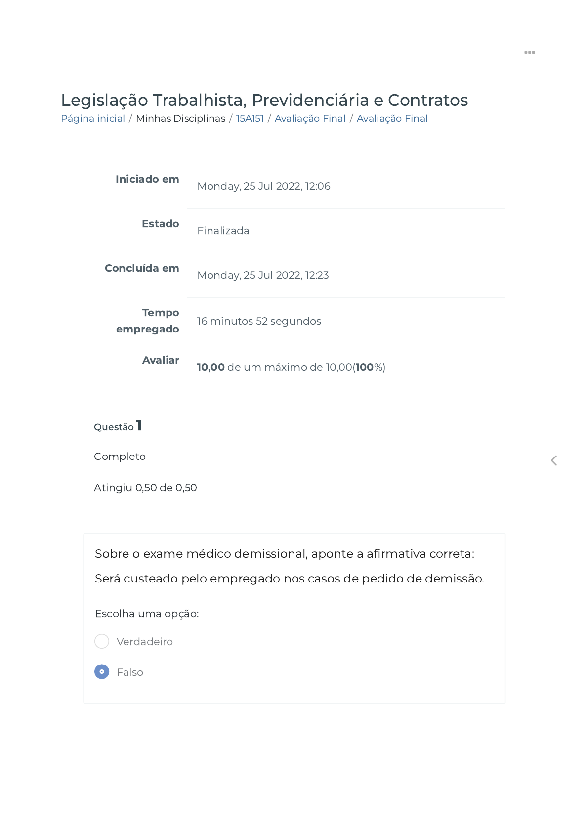 25/07/2022 12:23 Avaliação Final https://ava.politecnicabr.com.br/mod/quiz/review.php?attempt=3391349 1/13 Página inicial / Minhas Disciplinas / 15A151 / Avaliação Final / Avaliação Final Legislação Trabalhista, Previdenciária e Contratos Iniciado em Monday, 25 Jul 2022, 12:06 Estado Finalizada Concluída em Monday, 25 Jul 2022, 12:23 Tempo empregado 16 minutos 52 segundos Avaliar 10,00 de um máximo de 10,00(100%) Questão 1 Completo Atingiu 0,50 de 0,50 Sobre o exame médico demissional, aponte a a�rmativa correta: Será custeado pelo empregado nos casos de pedido de demissão. Escolha uma opção: Verdadeiro Falso https://ava.politecnicabr.com.br/ https://ava.politecnicabr.com.br/course/view.php?id=910 https://ava.politecnicabr.com.br/course/view.php?id=910#section-13 https://ava.politecnicabr.com.br/mod/quiz/view.php?id=30871 https://ava.politecnicabr.com.br/ 25/07/2022 12:23 Avaliação Final https://ava.politecnicabr.com.br/mod/quiz/review.php?attempt=3391349 2/13 Questão 2 Completo Atingiu 0,50 de 0,50 Condenação criminal do empregado – caracteriza falta grave a condenação criminal do empregado, passada em julgado, caso não tenha havido suspensão da execução da pena, corresponde a uma falta grave. Escolha uma opção: Questão 3 Completo Atingiu 0,50 de 0,50 O empregado poderá considerar rescindido o contrato e pleitear a devida indenização se (CLT, art. 483): o empregador reduzir o seu trabalho, sendo este por peça ou tarefa, de forma que afete sensivelmente a importância dos salários. Escolha uma opção: Verdadeiro Falso Verdadeiro Falso https://ava.politecnicabr.com.br/ 25/07/2022 12:23 Avaliação Final https://ava.politecnicabr.com.br/mod/quiz/review.php?attempt=3391349 3/13 Questão 4 Completo Atingiu 0,50 de 0,50 Poderão ser concedidas férias coletivas a todos os empregados de uma empresa ou de determinados estabelecimentos ou setores da empresa, que serão as férias gozadas em dois períodos anuais desde que nenhum deles seja superior a 30 dias. Escolha uma opção: Questão 5 Completo Atingiu 0,50 de 0,50 Para custear os benefícios de incapacidade pagos em decorrência dos acidentes de trabalho, as empresas devem contribuir com alíquota de 1, 2 ou 3%, incidente sobre o total da remuneração paga aos empregados e sem a observância de qualquer limite máximo. Escolha uma opção: Verdadeiro Falso Verdadeiro Falso https://ava.politecnicabr.com.br/ 25/07/2022 12:23 Avaliação Final https://ava.politecnicabr.com.br/mod/quiz/review.php?attempt=3391349 4/13 Questão 6 Completo Atingiu 0,50 de 0,50 De posse da documentação necessária, do exame admissional indicando a aptidão do candidato e de sua CTPS, deverá a empresa, obrigatoriamente, efetuar o registro das informações em livro ou �cha apropriados, sendo expressamente proibido manter empregados sem registro, ainda que por um único dia (CLT, art. 41, caput) Escolha uma opção: Questão 7 Completo Atingiu 0,50 de 0,50 O recrutamento e a seleção de candidatos fazem parte do contrato de trabalho, já que objetivam identi�car a pessoa com as quali�cações necessárias para a ocupação do cargo que está sendo oferecido. Escolha uma opção: Verdadeiro Falso Verdadeiro Falso https://ava.politecnicabr.com.br/ 25/07/2022 12:23 Avaliação Final https://ava.politecnicabr.com.br/mod/quiz/review.php?attempt=3391349 5/13 Questão 8 Completo Atingiu 0,50 de 0,50 Na hipótese de os minutos de atraso ultrapassarem o limite de 15 minutos diários, poderá o empregador efetuar o correspondente desconto na remuneração de seu empregado. Idêntica regra se aplica aos minutos que antecederem a jornada, que deverão ser remunerados extraordinariamente se excedentes desse limite legal. Escolha uma opção: Questão 9 Completo Atingiu 0,50 de 0,50 Sobre a grati�cação natalina é correto a�rmar que: a grati�cação de Natal, também chamada 13.º salário, é devida a todo empregado, exceto os empregados horistas. Escolha uma opção: Verdadeiro Falso Verdadeiro Falso https://ava.politecnicabr.com.br/ 25/07/2022 12:23 Avaliação Final https://ava.politecnicabr.com.br/mod/quiz/review.php?attempt=3391349 6/13 Questão 10 Completo Atingiu 0,50 de 0,50 A remuneração do repouso e/ou feriados para os empregados mensalistas (recebem quantia �xa por mês de trabalho) já se encontra embutida na remuneração mensal �xada entre as partes. Para aqueles que trabalham por dia, semana, quinzena ou mês, o repouso semanal e/ou feriado corresponderá a um dia de serviço. Para os empregados horistas, corresponderá à respectiva jornada diária normal de trabalho. Escolha uma opção: Verdadeiro Falso https://ava.politecnicabr.com.br/ 25/07/2022 12:23 Avaliação Final https://ava.politecnicabr.com.br/mod/quiz/review.php?attempt=3391349 7/13 Questão 11 Completo Atingiu 0,50 de 0,50 Os intervalos que não estão previstos na legislação e que são concedidos pela empresa em razão de liberalidade desta ou de previsão em acordo ou convenção coletiva da categoria serão computados normalmente na jornada de trabalho, em razão de encontrar-se o empregado, neste período, à disposição do empregador. Escolha uma opção: Questão 12 Completo Atingiu 0,50 de 0,50 A jornada máxima de trabalho, �xada pela Constituição Federal (CF) de 1988 e con�rmada pelo artigo 58 da Consolidação das Leis do Trabalho (CLT), é de oito horas diárias e 44 semanais, totalizando um limite mensal de 220 horas. Escolha uma opção: Verdadeiro Falso Verdadeiro Falso https://ava.politecnicabr.com.br/ 25/07/2022 12:23 Avaliação Final https://ava.politecnicabr.com.br/mod/quiz/review.php?attempt=3391349 8/13 Questão 13 Completo Atingiu 0,50 de 0,50 Remuneração é a contraprestação devida ao empregado pela prestação de seus serviços ao empregador, em decorrência do contrato de trabalho existente entre as partes. Escolha uma opção: Questão 14 Completo Atingiu 0,50 de 0,50 O contrato de experiência 