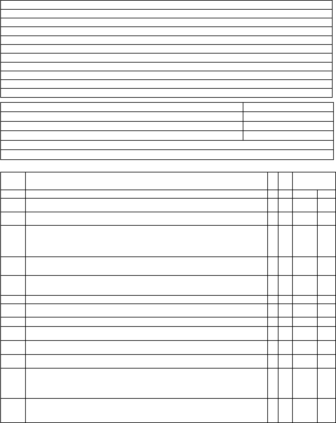 Relatório de Comissionamento e Inspeção Periódica do Sistema de Detecção e Alarme de Incêndio Wireless Logradouro público: N.º. Complemento: Bairro: Município: UF: AL Proprietário: e-mail: Fone: ( ) Responsável pelo uso e-mail: Fone: ( ) Responsável Técnico: Número de registro profissional: e-mail: Fone: ( ) Uso, divisão e descrição: Altura da edificação: Número de estágios: Níveis de pressurização adotados: Classificação (uso) da edificação: Idade do imóvel: Endereço: Bairro: Cidade: CEP: Pessoa de contato: Fone: O responsável pelo fornecimento deste atestado deve preencher todos os campos da tabela a seguir: "C" = CONFORME / "NA" = NÃO APLICÁVEL Item da IT 19 Requisito C NA OBSERVAÇÃO 5.25.2 Os meios de transmissão por rádio frequência tem imunidade à atenuação do local 5.25.3 O fabricante forneceu documentação necessária e/ou meios de avaliação que permitiram uma comprovação da completa funcionalidade dos componentes 5.25.4 Os componentes do sistema usam um protocolo de comunicação no meio de transmissão para garantir que nenhuma mensagem de alarme seja perdida 5.25.5 Cada componente que utiliza um meio de transmissão por rádio frequência é identificado por um código de identificação individual, como parte de um sistema de detecção e alarme de incêndio específico. O fabricante forneceu meios para assegurar que um componente que utiliza um meio de transmissão por RF não é aceito por outros sistemas de detecção e alarme de incêndio 5.25.6 O fabricante do receptor forneceu um relatório de um laboratório de ensaios para demonstrar que são cumpridos os requisitos para o desempenho do receptor, conforme NBR ISO 7240-25 5.25.7 Ensaios foram realizados para determinar o nível de imunidade à interferência para as fontes com relação a influências de rádio a partir do sistema de detecção e alarme de incêndio e para influências de rádio a partir de outros usuários do espectro 5.25.8 Não há distúrbio mútuo entre sistemas do mesmo fabricante 5.25.9 5.25.10 Compatibilidade com outros usuários da banda 5.25.11 Detecção de perda de comunicação do meio de comunicação de rádio frequência 5.25.12 A antena ou o seu cabo deve ser removível somente por meio da abertura do invólucro do componente ou utilizando-se ferramentas especiais fornecidas pelo fabricante 5.25.13 Qualquer componente está concebido de tal forma que a remoção da sua base e/ou de seu ponto de instalação seja detectado e indicado como uma falha 5.25.14 Os componentes que dependam de controle por software a fim de cumprir os requisitos desta parte da NBR ISO 7240 devem estar de acordo com a Parte pertinente da ISSO 5.25.15 5.25.16 5.25.17 5.25.18 A fonte de alimentação atende as normas pertinentes (NBR ISO 7240-2; NBR ISO 7240-4; NBR ISO 7240-25) 5.25.19 Os componentes foram submetidos aos ensaios de condição do ambiente definidos na parte pertinente da NBR ISO 7240. Os ensaios funcionais da parte do rádio do componente, antes e depois da preparação do ambiente, devem ser conduzidos de acordo com a parte 25 da NBR ISO 7240 5.25.20 O fabricante preparou a documentação e foi avaliada a compatibilidade nas configurações especificadas. Esta documentação deve incluir no mínimo a lista dos componentes relevantes do sistema de detecção e alarme de incêndio, a qual deve definir para cada componente as funções (uma parte desta definição deve incluir uma descrição do software e do hardware) e a informação técnica para cada componente a fim de facilitar a comprovação da compatibilidade de cada subsistema dentro do sistema global em rede; relatórios de ensaios relativos a conformidade dos componentes, com indicação da parte pertinente da NBR ISO 7240; características do meio de transmissão por rádio frequência entre cada componente e o equipamento de controle e de indicação; a forma como os requisitos de identificação dos componentes são satisfeitos e; limites de utilização e limites funcionais do sistema Avaliação geral da instalação do sistema de detecção e alarme de incêndio: Atesto, nesta data, que o sistema de detecção e alarme de incêndio da edificação foi inspecionado e verificadas as condições de funcionamento e sinalização de 100% dos equipamentos, conforme as prescrições da NBR 17240; partes da NBR ISO 7240; ISO 7240 e IT 19, e encontra-se em conformidade, estando o proprietário e/ou responsável pelo uso ciente das responsabilidades de manutenção e utilização adequada do sistema. Data da inspeção: ______________________________ (Certificação Digital) Responsável Técnico