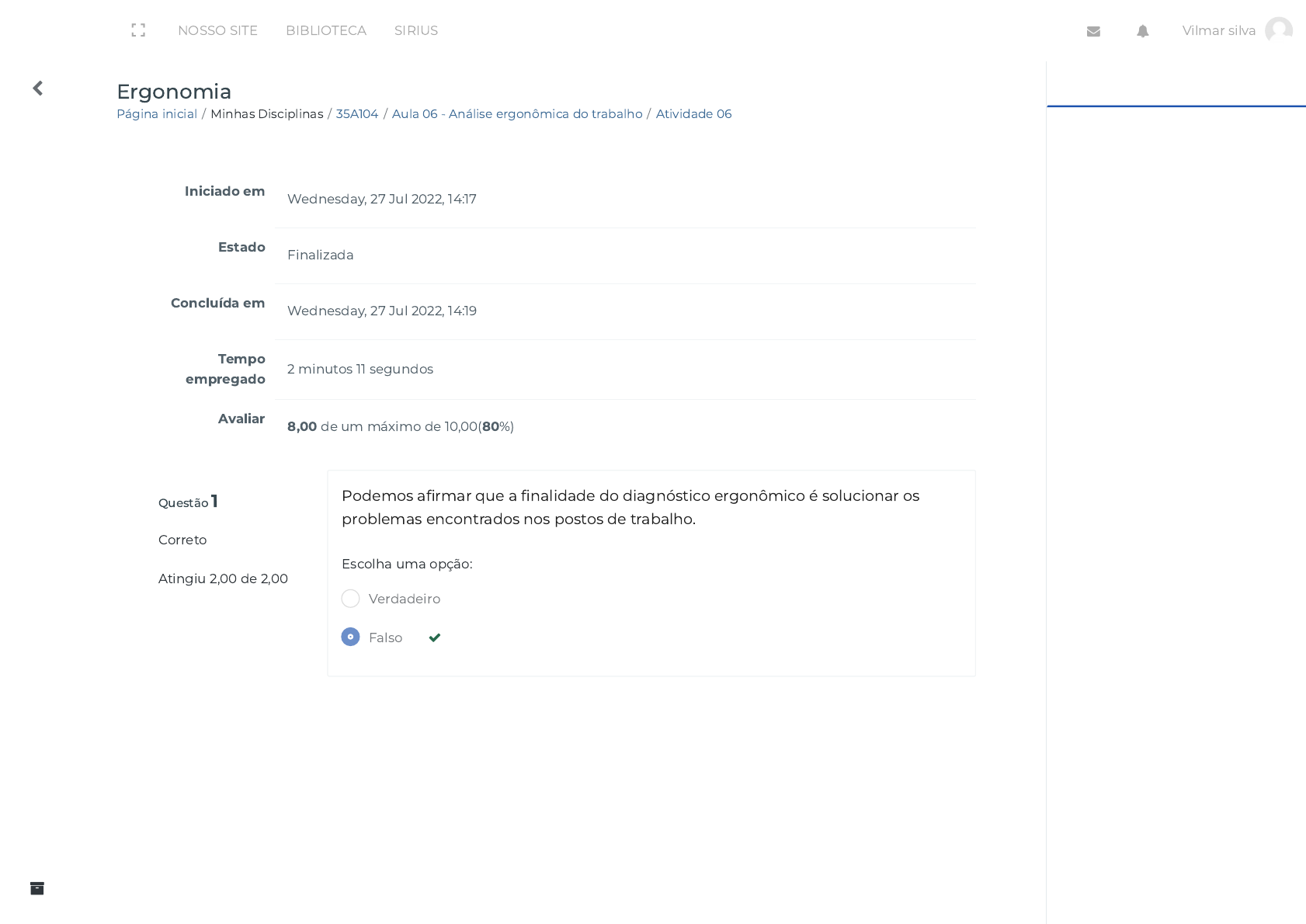Página inicial / Minhas Disciplinas / 35A104 / Aula 06 - Análise ergonômica do trabalho / Atividade 06 Ergonomia Questão 1 Correto Atingiu 2,00 de 2,00 Iniciado em Wednesday, 27 Jul 2022, 14:17 Estado Finalizada Concluída em Wednesday, 27 Jul 2022, 14:19 Tempo empregado 2 minutos 11 segundos Avaliar 8,00 de um máximo de 10,00(80%) Podemos a�rmar que a �nalidade do diagnóstico ergonômico é solucionar os problemas encontrados nos postos de trabalho. Escolha uma opção: Verdadeiro Falso NOSSO SITE BIBLIOTECA SIRIUS Vilmar silva https://ava.politecnicabr.com.br/ https://ava.politecnicabr.com.br/course/view.php?id=1026 https://ava.politecnicabr.com.br/course/view.php?id=1026#section-7 https://ava.politecnicabr.com.br/mod/quiz/view.php?id=34040 https://ava.politecnicabr.com.br/course/view.php?id=1026 javascript:void(0) javascript:void(0) javascript:void(0) javascript:void(0) javascript:void(0) javascript:void(0) javascript:void(0) javascript:void(0) javascript:void(0) https://ava.politecnicabr.com.br/course/index.php https://ava.politecnicabr.com.br/ https://www.politecnicabr.com.br/ https://biblioteca.politecnicabr.com.br/student http://sirius.politecnicabr.com.br/ javascript:void(0) javascript:void(0) Questão 2 Correto Atingiu 2,00 de 2,00 Questão 3 Correto Atingiu 2,00 de 2,00 Com relação a divisão da análise ergonômica do trabalho, marque a opção correta em relação a FASE e seus OBJETIVOS. Escolha uma opção: É uma das formas de intervenção ergonômica na esfera do trabalho e trata de aspectos físicos, psicológicos e �siológicos que norteiam as atividades desempenhadas pelo trabalhador no ambiente produtivo. Escolha uma opção: a. Análise da tarefa - Estudar as condições de trabalho nas quais o trabalhador exerce suas atividades. b. Análise da demanda - Estudar o comportamento humano no ambiente de trabalho. c. Análise da atividade - De�nir os problemas a serem resolvidos. d. Nenhuma das Respostas Anteriores a. ETE b. AET c. ETA d. EMT NOSSO SITE BIBLIOTECA SIRIUS Vilmar silva https://ava.politecnicabr.com.br/course/view.php?id=1026 javascript:void(0) javascript:void(0) javascript:void(0) javascript:void(0) javascript:void(0) javascript:void(0) javascript:void(0) javascript:void(0) javascript:void(0) https://ava.politecnicabr.com.br/course/index.php https://ava.politecnicabr.com.br/ https://www.politecnicabr.com.br/ https://biblioteca.politecnicabr.com.br/student http://sirius.politecnicabr.com.br/ javascript:void(0) javascript:void(0) Questão 4 Incorreto Atingiu 0,00 de 2,00 Questão 5 Correto Atingiu 2,00 de 2,00 Entre as premissas da Analise Ergonômica do Trabalho, destacam-se, exceto a opção: Escolha uma opção: Antes de efetuar ações como a aquisição de equipamentos, acessórios e móveis, deve ser iniciada a análise da tarefa, cuja efetivação ocorre em três níveis. Marque a opção que não corresponde a um dos três níveis. Escolha uma opção: a. Emitir laudos. b. Compreender a situação de trabalho e suas implicações. c. Analisar os postos de trabalho e o ambiente no qual as tarefas são cumpridas. d. Buscar soluções de melhorias, oferecendo indicações de adequação em diversos âmbito. e. Efetuar um diagnóstico para investigar as circunstâncias mais preocupantes. a. Origem da demanda, se ela é real e formal. b. Revisão crítica para reparar os eventuais problemas. c. Descrição das ações, em nível mais detalhado. d. Descrição da tarefa, em nível global. Entre em Contato Links Úteis Dicas da nossa Diretora Acadêmica Siga-nos nas redes sociais NOSSO SITE BIBLIOTECA SIRIUS Vilmar silva https://soundcloud.com/user-501638417/sets/escola-politecnica-brasileira https://ava.politecnicabr.com.br/course/view.php?id=1026 javascript:void(0) javascript:void(0) javascript:void(0) javascript:void(0) javascript:void(0) javascript:void(0) javascript:void(0) javascript:void(0) javascript:void(0) https://ava.politecnicabr.com.br/course/index.php https://ava.politecnicabr.com.br/ https://www.politecnicabr.com.br/ https://biblioteca.politecnicabr.com.br/student http://sirius.politecnicabr.com.br/ javascript:void(0) javascript:void(0) © 2022 - Escola Politécnica Brasileira https://www.politecnicabr.com.br 0800 084 2627 0800 084 2627 Planner de Estudos Declaração de Matrícula Orientações do AVA Abertura de Ticket Fale com o Tutor Cronograma de Estudos Manual de Estágio Manual de Competência NOSSO SITE BIBLIOTECA SIRIUS Vilmar silva https://ava.politecnicabr.com.br/mod/quiz/0 https://www.politecnicabr.com.br/ https://storage.googleapis.com/sirius-pubstore/semestre_plannerdeestudo%20poli.pdf https://storage.googleapis.com/sirius-pubstore/declaracao_matricula.pdf https://storage.googleapis.com/sirius-pubstore/orientacoes_ava.pdf https://storage.googleapis.com/sirius-pubstore/abertura_ticket.pdf https://storage.googleapis.com/sirius-pubstore/fale_com_tutor.pdf https://storage.googleapis.com/sirius-pubstore/cronograma_estudos.pdf https://storage.googleapis.com/sirius-pubstore/manual_estagio.pdf https://storage.googleapis.com/sirius-pubstore/manual_competencia.pdf https://www.facebook.com/politecnicabr https://www.instagram.com/politecnicabr_oficial https://ava.politecnicabr.com.br/course/view.php?id=1026 javascript:void(0) javascript:void(0) javascript:void(0) javascript:void(0) javascript:void(0) javascript:void(0) javascript:void(0) javascript:void(0) javascript:void(0) https://ava.politecnicabr.com.br/course/index.php https://ava.politecnicabr.com.br/ https://www.politecnicabr.com.br/ https://biblioteca.politecnicabr.com.br/student http://sirius.politecnicabr.com.br/ javascript:void(0) javascript:void(0)