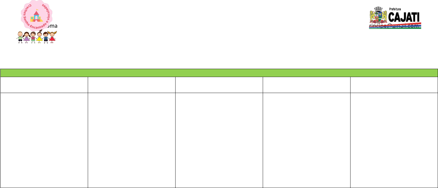 DEPARTAMENTOMUNICIPAL DE EDUCAÇÃO E CULTURA CRECHES SONHO ENCANTADO E PEQUENO PRÍNCIPE Rua: Roma, 115 – Vila Antunes – Cajati/SP Fone: (13) 38544645 – 38544606 crechesonhoencantadopprincipe@gmail.com ESCOLA: CRECHE SONHO ENCANTADO E VINCULADAS. PROFESSORA: Edna TURMA: Maternal I C MÊS: MAIO ANO: 2022 SEQUÊNCIA DIDÁTICA SEGUNDA-FEIRA 02/05 TERÇA-FEIRA 03/05 QUARTA-FEIRA 04/05 QUINTA-FEIRA 05/05 SEXTA-FEIRA 06/05 Acolhida; Café da manhã; Canto de músicas infantis; Chamadinha; Contagem de alunos; Como está o tempo? Canto do alfabeto e numerais; Roda de conversa. Atividade do dia: História na lata: Higiene Pessoal. Acolhida; Café da manhã; Canto de músicas infantis; Chamadinha; Contagem de alunos; Como está o tempo? Canto do alfabeto e numerais; Roda de conversa. Atividade do dia: Aprendendo a escovar os dentes. Acolhida; Café da manhã; Canto de músicas infantis; Chamadinha; Contagem de alunos; Como está o tempo? Canto do alfabeto e numerais; Roda de conversa. Atividade do dia: Confeccionar cartão para a mamãe. Acolhida; Café da manhã; Canto de músicas infantis; Chamadinha; Contagem de alunos; Como está o tempo? Canto do alfabeto e numerais; Roda de conversa. Atividade do dia: Painel coletivo-carimbo das mãozinhas. REUNIÃO DE PAIS E MESTRES. DEPARTAMENTOMUNICIPAL DE EDUCAÇÃO E CULTURA CRECHES SONHO ENCANTADO E PEQUENO PRÍNCIPE Rua: Roma, 115 – Vila Antunes – Cajati/SP Fone: (13) 38544645 – 38544606 crechesonhoencantadopprincipe@gmail.com ESCOLA: CRECHE SONHO ENCANTADO E VINCULADAS. PROFESSORA: Edna TURMA: Maternal I C MÊS: MAIO ANO: 2022 SEQUÊNCIA DIDÁTICA SEGUNDA-FEIRA 09/05 TERÇA-FEIRA 10/05 QUARTA-FEIRA 11/05 QUINTA-FEIRA 12/05 SEXTA-FEIRA 13/05 Acolhida; Café da manhã; Canto de músicas infantis; Chamadinha; Contagem de alunos; Como está o tempo? Canto do alfabeto e numerais; Roda de conversa. Atividade do dia: Confeccionar tapete sensorial. Acolhida; Café da manhã; Canto de músicas infantis; Chamadinha; Contagem de alunos; Como está o tempo? Canto do alfabeto e numerais; Roda de conversa. Atividade do dia: Salada de frutas. Acolhida; Café da manhã; Canto de músicas infantis; Chamadinha; Contagem de alunos; Como está o tempo? Canto do alfabeto e numerais; Roda de conversa. Atividade do dia: Caixa sensorial. Acolhida; Café da manhã; Canto de músicas infantis; Chamadinha; Contagem de alunos; Como está o tempo? Canto do alfabeto e numerais; Roda de conversa. Atividade do dia: Brincadeira Vivo ou morto. Acolhida; Café da manhã; Canto de músicas infantis; Chamadinha; Contagem de alunos; Como está o tempo? Canto do alfabeto e numerais; Roda de conversa. Atividade do dia: Brincadeiras de roda. DEPARTAMENTOMUNICIPAL DE EDUCAÇÃO E CULTURA CRECHES SONHO ENCANTADO E PEQUENO PRÍNCIPE Rua: Roma, 115 – Vila Antunes – Cajati/SP Fone: (13) 38544645 – 38544606 crechesonhoencantadopprincipe@gmail.com ESCOLA: CRECHE SONHO ENCANTADO E VINCULADAS. PROFESSORA: Edna TURMA: Maternal I C MÊS: MAIO ANO:2022 SEQUÊNCIA DIDÁTICA SEGUNDA-FEIRA 16/05 TERÇA-FEIRA 17/05 QUARTA-FEIRA 18/05 QUINTA-FEIRA 19/05 SEXTA-FEIRA 20/05 Acolhida; Café da manhã; Canto de músicas infantis; Chamadinha; Contagem de alunos; Como está o tempo? Canto do alfabeto e numerais; Roda de conversa. Atividade de hoje: Representação da idade com massinha de modelar. Acolhida; Café da manhã; Canto de músicas infantis; Chamadinha; Contagem de alunos; Como está o tempo? Canto do alfabeto e numerais; Roda de conversa. Atividade de hoje: Pintura com tinta caseira. Acolhida; Café da manhã; Canto de músicas infantis; Chamadinha; Contagem de alunos; Como está o tempo? Canto do alfabeto e numerais; Roda de conversa. Atividade de hoje: Bolo de aniversário – Pintura e colagem. FERIADO MUNICIPAL Acolhida; Café da manhã; Canto de músicas infantis; Chamadinha; Contagem de alunos; Como está o tempo? Canto do alfabeto e numerais; Roda de conversa. Atividade do dia: Brincadeiras livres DEPARTAMENTOMUNICIPAL DE EDUCAÇÃO E CULTURA CRECHES SONHO ENCANTADO E PEQUENO PRÍNCIPE Rua: Roma, 115 – Vila Antunes – Cajati/SP Fone: (13) 38544645 – 38544606 crechesonhoencantadopprincipe@gmail.com ESCOLA: CRECHE SONHO ENCANTADO E VINCULADAS PROFESSORA: EDNA TURMA: MATERNAL I C MÊS: MAIO ANO:2022 SEQUÊNCIA DIDÁTICA SEGUNDA-FEIRA 23/05 TERÇA-FEIRA 24/05 QUARTA-FEIRA 26/05 QUINTA-FEIRA 27/05 SEXTA-FEIRA 28/05 Acolhida; Café da manhã; Canto de músicas infantis; Chamadinha; Contagem de alunos; Como está o tempo? Canto do alfabeto e numerais; Roda de conversa. Atividade de hoje: Nossa família-vídeo musical. Acolhida; Café da manhã; Canto de músicas infantis; Chamadinha; Contagem de alunos; Como está o tempo? Canto do alfabeto e numerais; Roda de conversa. Atividade de hoje: Palitoches- Família dedos. Acolhida; Café da manhã; Canto de músicas infantis; Chamadinha; Contagem de alunos; Como está o tempo? Canto do alfabeto e numerais; Roda de conversa. Atividade de hoje: Roda de história- As famílias do mundinho. Brincar com fantoches. Acolhida; Café da manhã; Canto de músicas infantis; Chamadinha; Contagem de alunos; Como está o tempo? Canto do alfabeto e numerais; Roda de conversa. Atividade do dia: Poema - A casa e seu dono. Acolhida; Café da manhã; Canto de músicas infantis; Chamadinha; Contagem de alunos; Como está o tempo? Canto do alfabeto e numerais; Roda de conversa. Atividade do dia: Brincadeiras com jogos de encaixe. DEPARTAMENTOMUNICIPAL DE EDUCAÇÃO E CULTURA CRECHES SONHO ENCANTADO E PEQUENO PRÍNCIPE Rua: Roma, 115 – Vila Antunes – Cajati/SP Fone: (13) 38544645 – 38544606 crechesonhoencantadopprincipe@gmail.com ESCOLA: CRECHE SONHO ENCANTADO E VINCULADAS. PROFESSORA: Edna TURMA: Maternal I C MÊS: MAIO ANO:2022 SEQUÊNCIA DIDÁTICA SEGUNDA-FEIRA 30/05 TERÇA-FEIRA 31/05 QUARTA-FEIRA QUINTA-FEIRA SEXTA-FEIRA Acolhida; Café da manhã; Canto de músicas infantis; Chamadinha; Contagem de alunos; Como está o tempo? Canto do alfabeto e 