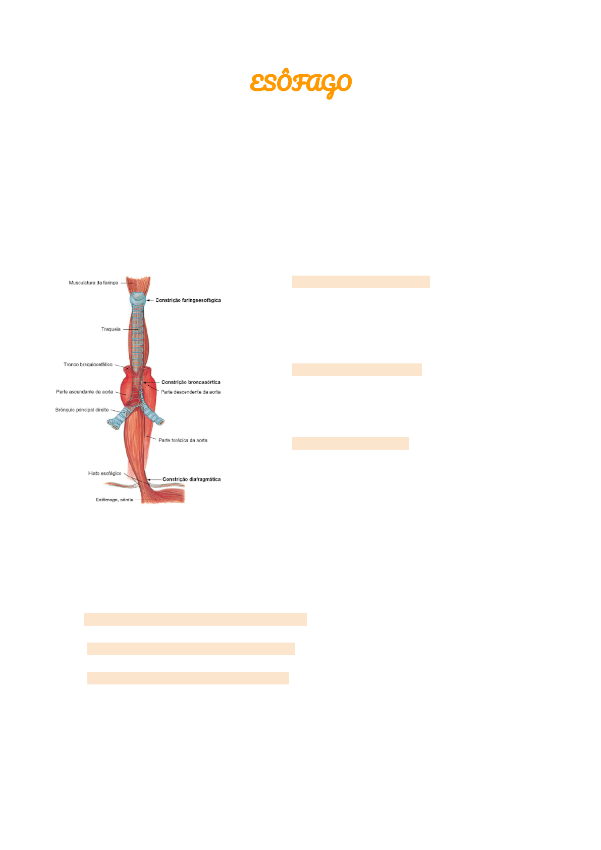 ISABELI ROCHA DE ANDRADE ESÔFAGO ANATOMIA É um tubo muscular, elástico e deformável, de 25 a 30 cm de comprimento (de acordo com o Sobotta). Se inicia a 15 cm da fileira anterior dos dentes, totalizando 40 cm (arcada dentária+esôfago). Diâmetro de 2 cm. O esôfago se inicia na 6ª vértebra cervical e termina na altura da 10ª vértebra torácica. Devido a presença de estruturas adjacentes, o esôfago se apresenta estreitado em três locais: 1. Constrição faringoesofágica (constrição superior) → é o ponto mais estreito, em repouso essa constrição está fechada, e este fechamento é assegurado por um esfíncter verdadeiro. 2. Constrição bronco aórtica (constrição média) → é estreitado pelo brônquio principal esquerdo e pelo arco da aorta. 3. Contrição diafragmática (constrição inferior) → não é esfíncter verdadeiro, a oclusão é realizada funcionalmente por meio de uma oclusão angiomuscular por expansão. *Nas constrições pode haver a retenção de corpos estranhos deglutidos (ex: espinhas de peixes), queimaduras também podem provocar grandes lesões nas constrições. ANATOMIA FUNCIONAL ➢ Esfíncter Superior do Esôfago (ESE) –tônica-mantida e sustentada (núcleo ambíguo do nervo vago) ➢ Corpo esofágico (Esôfago Tubular)-fásica -contração e relaxamento periódicos- amplitude da onda 60-140 mmhg ➢ Esfíncter Inferior do Esôfago (EIE)-tônica-mantida e sustentada ➢ 3-4 cm –tônus de repouso- atividade miogênica intrínseca ➢ Relaxamento- Peptídeo vasoativo intestinal-ácido nitroso ( inibitórios) ➢ Relaxamento transitórios- intermitente independente da deglutição ISABELI ROCHA DE ANDRADE HISTOLOGIA Epitélio escamoso estratificado. 1. Terço superior → musculatura estriada 2. Terço médio (corpo esofágico) → zona de transição (músculo estriado + músculo liso) 3. Terço distal (esôfago distal) → musculatura lisa 4 camadas do esôfago: mucosa, submucosa, muscular e adventícia. FUNÇÃO Atua no transporte de alimentos da faringe para o estômago. DEGLUTIÇÃO ➢ Ondas Peristálticas Primária-Onda propulsiva - 8 segundos- (clareamento +)- DEGLUTIÇÃO ➢Ondas Peristálticas Secundárias- Primária-Onda propulsiva -DISTENSÃO DO ESÔFAGO-Clareamento do refluxo- ➢Ondas Terciárias –Patológicas-Ondas não propulsivas (clareamento -)Sem função fisiológica conhecida-Associada a alterações motoras do esôfago MECANISMO DE FECHAMENTO Esfíncter superior do esôfago → Na constrição faringoesofágica, fibras musculares circulares do músculo constritor inferior da faringe e fibras musculares circulares do esôfago, juntamente com o plexo venoso da submucosa do esôfago, formam um esfíncter verdadeiro (esfíncter superior do esôfago). O plexo venoso garante a vedação do esôfago aos gases, cuja abertura, por exemplo, se manifesta de modo audível durante as eructações. Esfíncter inferior → não há um esfíncter verdadeiro, desse modo, o fechamento é funcionalmente realizado por meio de vários mecanismo: - Fechamento angiomuscular por extensão → em condições fisiológicas o esôfago se encontra sob uma forte tensão longitudinal elástico, isso significa que, em repouso, ele está fechado nas partes cervical e abdominal, e apenas ligeiramente dilatado na parte torácica. As fibras musculares da túnica muscular sob contração ou tensão longitudinal proporcionam um fechamento em rosca no estado fisiológico. O alimento é transportado por ondas peristálticas: a tensão longitudinal é localmente reduzida devido a chegada de uma onda peristáltica, o que significa que a musculatura longitudinal se contrai, fazendo com que a luz seja aberta para que os alimentos possam passar. - Plexo venoso esofágico na submucosa→ atua como uma estrutura de tecido erétil e, entre outros, proporciona a vedação à prova de gases. ISABELI ROCHA DE ANDRADE *Pregas da mucosa no ângulo de His → impede o refluxo do conteúdo gástrico. *Pressão basal é de 20- 30 OBSERVAÇÃO - Quando os mecanismos de fechamento da região inferior do esôfago falham, ocorre um refluxo de suco gástrico ácido no esôfago, o que provoca uma inflamação da mucosa (esofagite de refluxo). As consequências podem ser um esôfago de Barrett e uma degeneração maligna (carcinoma esofágico). Uma possível causa é a estabilização defeituosa no hiato esofágico, com afrouxamento da parede do esôfago. Isso significa que a parte abdominal e também partes do estômago podem entrar na cavidade torácica através do hiato esofágico (hérnia de hiato). Isso promove o desencadeamento do refluxo, no qual o suco gástrico, de natureza ácida, pode lesionar a mucosa do esôfago. - Além disso, podem ocorrer dilatações (divertículos), formadas por todas as camadas da parede do esôfago, em vários locais: • Os mais comuns são os divertículos de Zenker (70%). Estes divertículos passam pelo triângulo de Killian da parte laríngea da faringe (ou hipofaringe) e são considerados erroneamente como divertículos esofágicos. A causa é um afrouxamento defeituoso do músculo constritor inferior da faringe e, portanto, do esfíncter superior do esôfago. ARTÉRIA O esôfago não possui artérias próprias, mas é suprido pelos vasos circunjacentes: - Parte Cervical: ramos esofágicos da artéria tireoidiana inferior. - Parte Torácica: ramos esofágicos da parte torácica da aorta e das artérias intercostais direitas. - Parte Abdominal: ramos esofágicos da artéria gástrica e da artéria frênica inferior. *Por não possuir artérias próprias, a cirurgia do esôfago é considerada desafiadora. VEIA O sangue venoso flui através de fortes plexos venosos, presentes na submucosa, e na túnica adventícia. Estes plexos venosos também fazem parte do fechamento angiomuscular ISABELI ROCHA DE ANDRADE por extensão na região inferior do esôfago. A drenagem ocorre através das veias esofágicas: - Parte Cervical: para a veia t