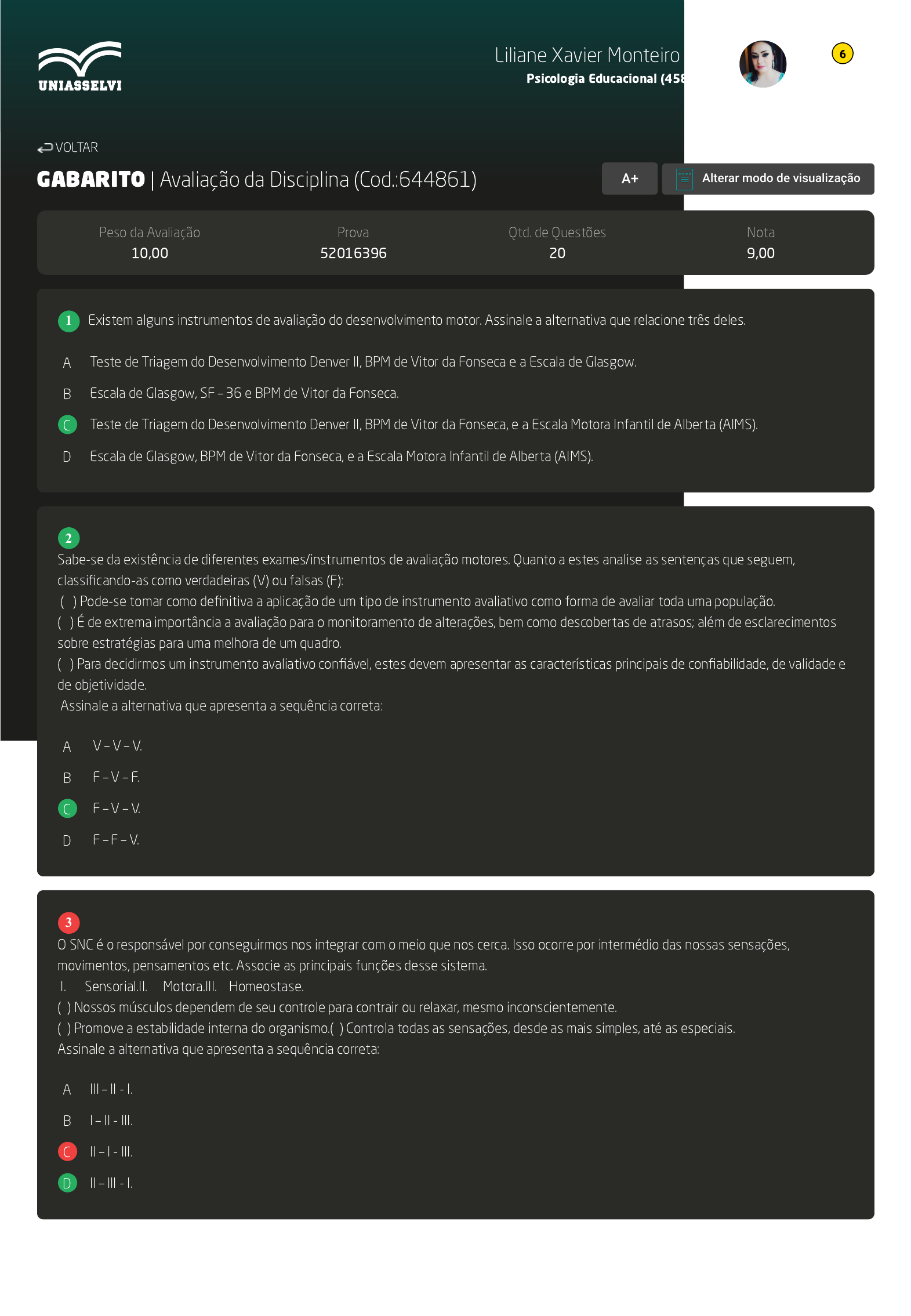 GABARITO | Avaliação da Disciplina (Cod.:644861) Peso da Avaliação 10,00 Prova 52016396 Qtd. de Questões 20 Nota 9,00 Existem alguns instrumentos de avaliação do desenvolvimento motor. Assinale a alternativa que relacione três deles. A Teste de Triagem do Desenvolvimento Denver II, BPM de Vitor da Fonseca e a Escala de Glasgow. B Escala de Glasgow, SF – 36 e BPM de Vitor da Fonseca. C Teste de Triagem do Desenvolvimento Denver II, BPM de Vitor da Fonseca, e a Escala Motora Infantil de Alberta (AIMS). D Escala de Glasgow, BPM de Vitor da Fonseca, e a Escala Motora Infantil de Alberta (AIMS). Sabe-se da existência de diferentes exames/instrumentos de avaliação motores. Quanto a estes analise as sentenças que seguem, classificando-as como verdadeiras (V) ou falsas (F): ( ) Pode-se tomar como definitiva a aplicação de um tipo de instrumento avaliativo como forma de avaliar toda uma população. ( ) É de extrema importância a avaliação para o monitoramento de alterações, bem como descobertas de atrasos; além de esclarecimentos sobre estratégias para uma melhora de um quadro. ( ) Para decidirmos um instrumento avaliativo confiável, estes devem apresentar as características principais de confiabilidade, de validade e de objetividade. Assinale a alternativa que apresenta a sequência correta: A V – V – V. B F – V – F. C F – V – V. D F – F – V. O SNC é o responsável por conseguirmos nos integrar com o meio que nos cerca. Isso ocorre por intermédio das nossas sensações, movimentos, pensamentos etc. Associe as principais funções desse sistema. I. Sensorial.II. Motora.III. Homeostase. ( ) Nossos músculos dependem de seu controle para contrair ou relaxar, mesmo inconscientemente. ( ) Promove a estabilidade interna do organismo.( ) Controla todas as sensações, desde as mais simples, até as especiais. Assinale a alternativa que apresenta a sequência correta: A III – II - I. B I – II - III. C II – I - III. D II – III - I. VOLTAR A+ Alterar modo de visualização 1 2 3 Liliane Xavier Monteiro Klein Psicologia Educacional (4584016) 6 Nós humanos processamos mentalmente de forma que diferentes estruturas cerebrais trabalham em conjunto. A atividade mental surge da cooperação de unidades funcionais. Um grande pesquisador as dividiu em três unidades funcionais. Este pesquisador chama-se: Assinale a alternativa correta: A Wallon. B Piaget. C Vigotsky. D Luria. A elaboração do plano de negócios visa criar uma oportunidade para o empreendedor analisar todas as facetas da nova empresa e refletir sobre elas. Sobre os elementos que compõe o plano de negócios, assinale V para verdadeiro e F para falso nas afirmações que seguem: ( ) A análise de mercado apresenta aspectos importantes sobre a clientela, a concorrência e os fornecedores. ( ) O planejamento financeiro visa diferenciar investimentos de despesas administrativas. ( ) O plano de marketing visa definir o preço do serviço prestado ou da produção de determinado produto. Assinale a alternativa que apresenta a sequência correta de respostas: A F – V – F. B V – V – V. C F – V – V. D V – F – V. Apesar das dificuldades de iniciar a própria empresa, sejam elas de ordem financeira, cultural, institucional ou individual, muitos indivíduos decidem empreender, e novas empresas são constituídas todos os dias em todo o mundo. Sobre o empreendedor que surgiu por necessidade ou por oportunidade, analise e associe os itens que seguem: I – Empreendedor por necessidadeII – Empreendedor por oportunidade ( ) Ausência de perspectivas no mercado de trabalho. ( ) Analisa e pesquisa o mercado antecipadamente.( ) Ausência de um planejamento elaborado. ( ) Analisa e pesquisa a existência de oportunidades. Assinale a alternativa que a presenta a sequência correta de respostas: A II – I – I – II. B II - II – II – I. C I – II – I – II. D I – I – I – II. A somatognosia trata da percepção que temos do nosso próprio corpo. É fundamental principalmente para o processo de aprendizagem da escrita. Sobre a somatognosia, analise as afirmações a seguir: I. É o mesmo que noção corporal.II. Pode ser cinestésica e de autoimagem.III. Não depende dos fusos musculares. Assinale a alternativa correta: A Apenas as afirmações I e II estão corretas. B Apenas as afirmações II e III estão corretas. C Apenas a afirmação I é correta. D Apenas a afirmação IIII é correta. 4 5 6 7 Liliane Xavier Monteiro Klein Psicologia Educacional (4584016) 6 Em suas brincadeiras a criança descobre sua forma de conduta, sua forma de comunicação. Nós educadores sabemos que a brincadeira pode proporcionar inúmeros benefícios. Sobre tais benefícios, analise as sentenças que seguem: I. Aprendizagem e socialização.II. Integração sensório-motora e esquema corporal. III. Apenas um tempo de repouso e descontração, sem objetivo algum para o desenvolvimento emocional da criança. Assinale a alternativa correta: A Apenas as afirmativas I e II estão corretas. B Apenas a afirmativa III está correta. C Todas as afirmativas estão corretas. D Apenas a afirmativa I está correta. Uma criança que apresenta características como: inclinação anormal das fissuras palpebrais, Hipertelorismo, Macroglossia e hipotonia, pode ser uma criança com... Assinale a alternativa que completa corretamente a frase: A Asperger. B Medula bífida. C Síndrome de Down. D TDAH. O cérebro humano é responsável por praticamente toda a nossa funcionalidade. Se uma de suas partes é lesionada, com certeza, haverá consequências prejudiciais para algum aspecto na vida. Temos estruturas muito importantes nele localizadas, como a Dura mater, por exemplo, a qual é responsável por manter o líquido cefalorraquidiano. Assim sendo podemos afirmar que a Dura-mater: A É a meninge mais superficial, espessa e resistente, formada por tecido conjuntivo muito rico em fibras colágenas, contendo nervos e vas