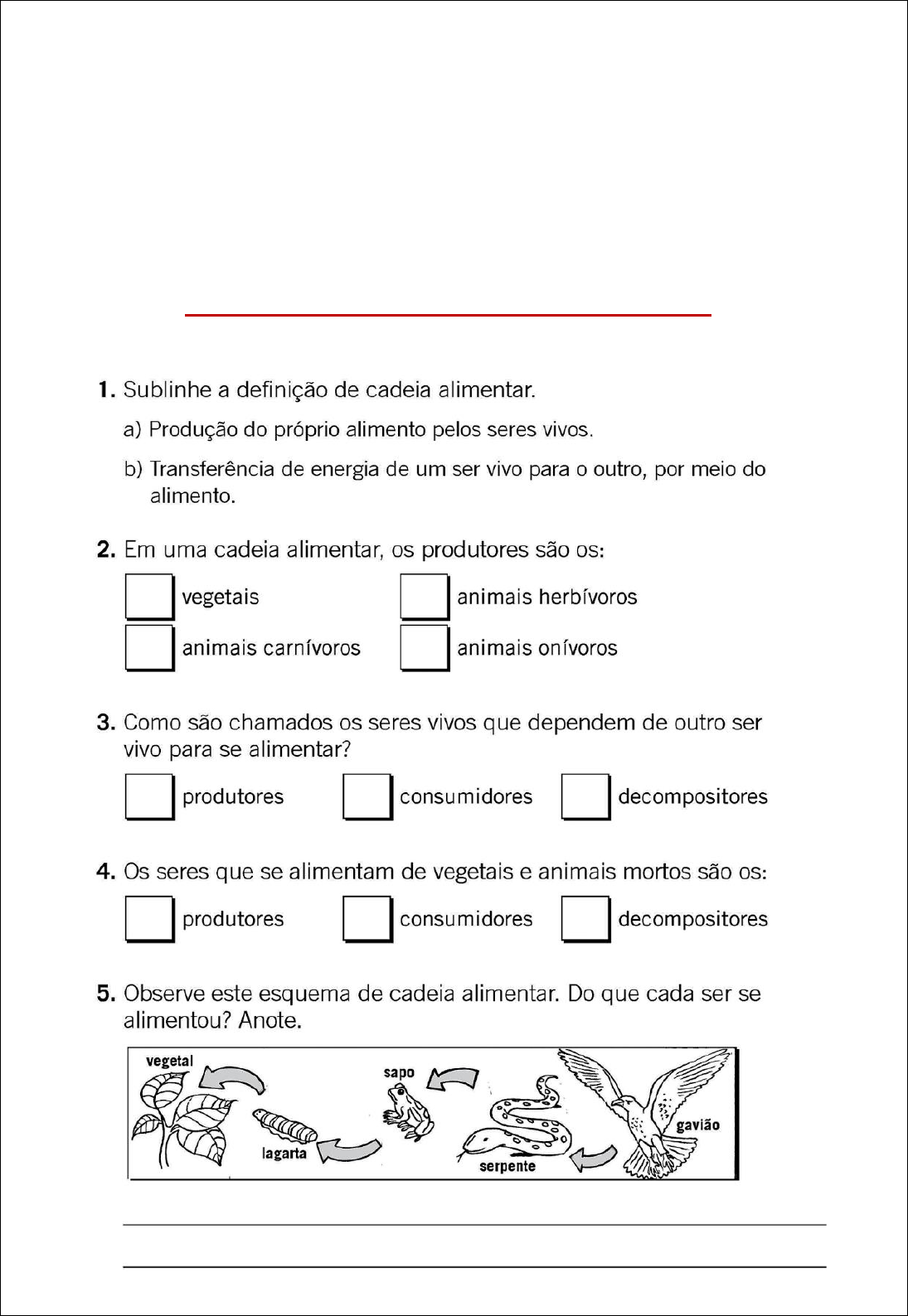 NOME: __________________________________________________ DATA: _____________________ BNCC (EF04CI04) Analisar e construir cadeias alimentares simples, reconhecendo a posição ocupada pelos seres vivos nessas cadeias e o papel do Sol como fonte primária de energia na produção de alimentos. CADEIA ALIMENTAR