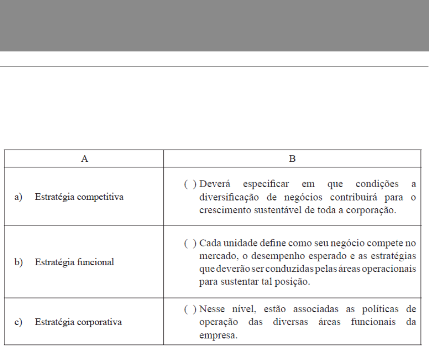 Prova Online Disciplina: 721 - ESTRATÉGIA DE GESTÃO DE PROCESSOS E DA QUALIDADE Abaixo estão as questões e as alternativas que você selecionou: Parte superior do formulário QUESTÃO 1 Dentro das organizações há três níveis hierárquicos onde se encontram as estratégias de planejamento. De acordo com esta informação, enumere as colunas A e B identificando a relação verdadeira. a ) b, a, c. b ) c, a ,b. c ) c, b, a. d ) a, c, b. QUESTÃO 2 Qual a ferramenta destinada à geração de ideias e sugestões criativas? a ) Brainstorming. b ) 5 porquês. c ) Espinha de peixe. d ) Plano de ação. QUESTÃO 3 Marque a resposta correta no que diz respeito ao diagrama de blocos. a ) Deve ser preenchido pelo setor de compras. b ) É a representação em balões para o entendimento de um processo de um sistema simples e corriqueiro. c ) Através de figuras geométricas e ligações (linhas), descrevem-se as relações entre cada subsistema e o fluxo de informação. d ) É utilizado para relacionar a hierarquia da empresa. QUESTÃO 4 Marque V para verdadeiro ou F para falso, nas questões abaixo envolvendo o diagrama de pareto. Em seguida assinale a alternativa correta. ( ) É um gráfico de barras verticais que representa uma estratificação. ( ) O princípio do pareto é também conhecido como Lei 30/70. ( ) O gráfico de pareto pode ser usado sempre que for necessário ressaltar a importância relativa entre os vários problemas ou condições. ( ) O pareto pode ser utilizado sempre que houver a necessidade de se comparar ocorrências de problemas em um processo. a ) V, V, F, F b ) V, F, V, V c ) F, V, F, V d ) F, F, F, V QUESTÃO 5 Pode-se dizer que cultura organizacional: a ) é um sistema de valores, crenças, costumes, normas e hábitos compartilhados que tornam uma empresa comum com muita burocracia. b ) algumas vezes denominada cultura corporativa, por refletir o ambiente externo e particular de cada organização sendo um elemento crítico que deve ser gerenciado. c ) é necessário entendê-la e então determinar como esta pode efetivamente contribuir, senão sustentar, a estratégia adotada pela organização. d ) para a mudança da cultura organizacional são envolvidos quatro aspectos, sendo os mais importantes: o desnivelamento das normas atuais seguido da desarticulação de novas direções. QUESTÃO 6 Em relação à matriz SWOT, qual das alternativas abaixo pode ser considerada uma força da organização? a ) Mudanças culturais e políticas. b ) Logística e distribuição eficientes. c ) Globalização dos mercados. d ) Concorrentes com dificuldades. QUESTÃO 7 Em relação às questões que focam o Hoshin Kanri, assinale V para as afirmações verdadeiras e F para as falsas e, em seguida, marque a alternativa correta. ( ) O processo de gerenciamento e planejamento de desdobramento por diretrizes estratégicas, no Japão, possui a denominação Hoshin Kanri. ( ) O Hoshin Kanri surgiu como resposta à necessidade de um sistema administrativo mais flexível, com tempo de resposta mais curto em relação às mudanças internas e externas à empresa. ( ) A palavra Hoshin é composta de dois caracteres chineses: hos e hin. A primeira significa "pedra brilhante", e hin, significa "processo". ( ) Hoshin significa uma metodologia para estabelecer a direção estratégica. a ) F, V, F, F b ) V, V, F, V c ) F, F, V, V d ) V, V, V, F QUESTÃO 8 Sobre meta e diretriz indique V para verdadeiro ou F para as afirmações falsas e em seguida assinale a alternativa correta. ( ) Diretriz é a soma da meta mais as medidas, que são os meios ou métodos específicos para se atingir a meta. ( ) Meios são direções para atingir a meta. Portanto, os meios mostram como atingir as metas. ( ) Meta é utilizada em um sentido mais amplo que diretriz, sendo que as diretrizes e os meios combinados podem ser denominados como um objetivo. a ) V, F, V b ) F, V, F c ) F, F, V d ) V, V, F QUESTÃO 9 Sobre padronização indique V, para verdadeiro ou F, para falso. ( ) A padronização de produtos e processos nas empresas é fator importante para o desenvolvimento da qualidade. ( ) Um procedimento não precisa ser escrito, pode ser apenas transmitido oralmente ou desenhado. ( ) Os procedimentos são necessários sempre que uma atividade for crítica para a qualidade, seja ela qual for. ( ) Há situações em que, mesmo uma atividade não sendo crítica para a qualidade, há a necessidade do desenvolvimento de um procedimento. a ) V, F, V, V b ) V, V, V, F c ) V, F, V, F d ) F, F, F, V QUESTÃO 10 Superar as expectativas dos clientes está relacionado ao conceito moderno de qualidade. No entanto, para se chegar à gestão da qualidade total abordada na atualidade, três períodos foram importantes. A era da inspeção, do controle estatístico e da qualidade total. Assinale a alternativa correta indicando quais são os procedimentos adotados ou o que caracteriza a era da qualidade total. a ) Ênfase na prevenção de defeitos. b ) Cliente participa da inspeção. c ) Departamento especializado faz controle da qualidade. d ) Produtos ou serviços verificados com base em amostras. Parte inferior do formulário