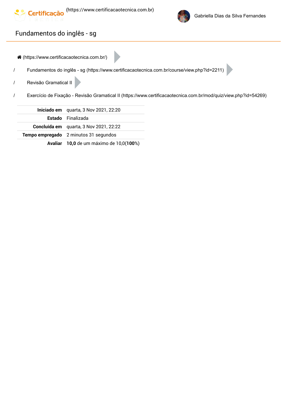 (https://www.certificacaotecnica.com.br) Gabriella Dias da Silva Fernandes Fundamentos do inglês - sg / / / Iniciado em quarta, 3 Nov 2021, 22:20 Estado Finalizada Concluída em quarta, 3 Nov 2021, 22:22 Tempo empregado 2 minutos 31 segundos Avaliar 10,0 de um máximo de 10,0(100%) (https://www.certificacaotecnica.com.br/) Fundamentos do inglês - sg (https://www.certificacaotecnica.com.br/course/view.php?id=2211) Revisão Gramatical II Exercício de Fixação - Revisão Gramatical II (https://www.certificacaotecnica.com.br/mod/quiz/view.php?id=54269) https://www.certificacaotecnica.com.br/ https://www.certificacaotecnica.com.br/ https://www.certificacaotecnica.com.br/course/view.php?id=2211 https://www.certificacaotecnica.com.br/mod/quiz/view.php?id=54269 Questão 1 Correto Atingiu 2,0 de 2,0 Leia o texto e responda às perguntas a seguir: Why do men have Adam’s Apple*? Actually, both men and women have Adam’s apple. In medical terms the Adam’s apple is called a thyroid cartilage. The reason a man’s Adam’s apple is larger than a woman’s is because his (1) larynx is larger to accommodate his (2) longer vocal cords. By the way, it (3) is men’s longer vocal cords that give them (4) deeper voices. A second reason, which (5) female readers may not like, is because women have more fat in their (6) necks, which hides their (7) Adam’s apple. The name Adam’s apple was taken from the Biblical story of Adam and Eve. As the story goes, a piece of the apple that Eve had given Adam to eat became lodged in his (8) throat. From then on, Adam and all his (9) male descendants had an enlarged larynx as a symbol of Adam’s shame. (BRITO, 1997) *pomo-de-adão A palavra "them", indicada pelo número 4, é um: Escolha uma opção: a. Pronome Relativo. b. Pronome pessoal do caso reto. c. Adjetivo possessivo. d. Pronome pessoal (como objeto). e. Pronome demonstrativo. Sua resposta está correta. A resposta correta é: Pronome pessoal (como objeto).. Questão 2 Correto Atingiu 2,0 de 2,0 Leia o texto e responda às perguntas a seguir: Why do men have Adam’s Apple*? Actually, both men and women have Adam’s apple. In medical terms the Adam’s apple is called a thyroid cartilage. The reason a man’s Adam’s apple is larger than a woman’s is because his (1) larynx is larger to accommodate his (2) longer vocal cords. By the way, it (3) is men’s longer vocal cords that give them (4) deeper voices. A second reason, which (5) female readers may not like, is because women have more fat in their (6) necks, which hides their (7) Adam’s apple. The name Adam’s apple was taken from the Biblical story of Adam and Eve. As the story goes, a piece of the apple that Eve had given Adam to eat became lodged in his (8) throat. From then on, Adam and all his (9) male descendants had an enlarged larynx as a symbol of Adam’s shame. (BRITO, 1997) *pomo-de-adão A palavra "it", indicada pelo número 3, no texto, é um: Escolha uma opção: a. Adjetivo possessivo b. Pronome possessivo. c. Pronome demonstrativo. d. Pronome pessoal do caso reto. e. Pronome pessoal (como objeto). Sua resposta está correta. A resposta correta é: Pronome pessoal do caso reto.. Questão 3 Correto Atingiu 2,0 de 2,0 Leia o texto e responda às perguntas a seguir: Why do men have Adam’s Apple*? Actually, both men and women have Adam’s apple. In medical terms the Adam’s apple is called a thyroid cartilage. The reason a man’s Adam’s apple is larger than a woman’s is because his (1) larynx is larger to accommodate his (2) longer vocal cords. By the way, it (3) is men’s longer vocal cords that give them (4) deeper voices. A second reason, which (5) female readers may not like, is because women have more fat in their (6) necks, which hides their (7) Adam’s apple. The name Adam’s apple was taken from the Biblical story of Adam and Eve. As the story goes, a piece of the apple that Eve had given Adam to eat became lodged in his (8) throat. From then on, Adam and all his (9) male descendants had an enlarged larynx as a symbol of Adam’s shame. (BRITO, 1997) *pomo-de-adão A palavra "which", indicada pelo número 5, é um: Escolha uma opção: a. Pronome pessoal (como objeto). b. Adjetivo possessivo. c. Pronome demonstrativo. d. Pronome pessoal do caso reto. e. Pronome relativo. Sua resposta está correta. A resposta correta é: Pronome relativo.. Questão 4 Correto Atingiu 2,0 de 2,0 Leia o texto e responda às perguntas a seguir: Why do men have Adam’s Apple*? Actually, both men and women have Adam’s apple. In medical terms the Adam’s apple is called a thyroid cartilage. The reason a man’s Adam’s apple is larger than a woman’s is because his (1) larynx is larger to accommodate his (2) longer vocal cords. By the way, it (3) is men’s longer vocal cords that give them (4) deeper voices. A second reason, which (5) female readers may not like, is because women have more fat in their (6) necks, which hides their (7) Adam’s apple. The name Adam’s apple was taken from the Biblical story of Adam and Eve. As the story goes, a piece of the apple that Eve had given Adam to eat became lodged in his (8) throat. From then on, Adam and all his (9) male descendants had an enlarged larynx as a symbol of Adam’s shame. (BRITO, 1997) *pomo-de-adão A palavra "their", indicada pelos números 6 e 7, é um: Escolha uma opção: a. Adjetivo possessivo. b. Pronome possessivo. c. Pronome demonstrativo. d. Pronome pessoal do caso reto. e. Pronome relativo. Sua resposta está correta. A resposta correta é: Adjetivo possessivo.. Questão 5 Correto Atingiu 2,0 de 2,0 Leia o texto e responda às perguntas a seguir: Why do men have Adam’s Apple*? Actually, both men and women have Adam’s apple. In medical terms the Adam’s apple is called a thyroid cartilage. The reason a man’s Adam’s apple is larger than a woman’s is because his (1) larynx is larger to accommodate his (2) longer vocal cords. By the way, it (3) is me