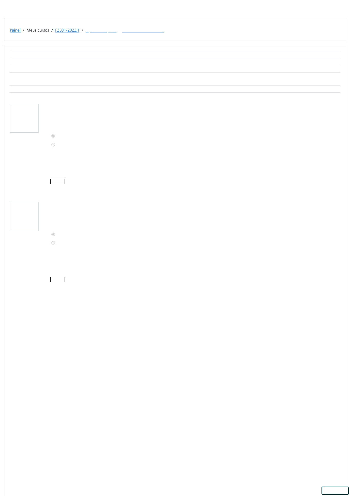Painel / Meus cursos / F2E01-2022.1 / 5 julho - 11 julho / Pré-relatório - Pêndulo Questão 1 Correto Atingiu 1,00 de 1,00 Questão 2 Correto Atingiu 1,00 de 1,00 Iniciado em segunda, 11 jul 2022, 20:36 Estado Finalizada Concluída em segunda, 11 jul 2022, 20:46 Tempo empregado 9 minutos 48 segundos Notas 10,00/10,00 Avaliar 100,00 de um máximo de 100,00 O ângulo de oscilação do pêndulo será medido em função do tempo transcorrido por um sistema de aquisição de dados. Para que o ângulo possa ser medido, sugere-se calibrá-lo nas posições angulares de +45 graus e -45 graus. Escolha uma opção: Verdadeiro Falso Correto. É preciso informar ao computador o que você considera ser o ângulo de 45 graus e de -45 graus. A resposta correta é 'Verdadeiro'. Correto Notas para este envio: 1,00/1,00. A determinação precisa do valor da aceleração local da gravidade pode ser feita com esse experimento, desde que sejam tomados cuidados especiais. Um desses cuidados consiste em levar em consideração o momento de inércia da haste. Escolha uma opção: Verdadeiro Falso Correto. O momento de inércia da haste afeta o período, logo deve ser levado em consideração. A resposta correta é 'Verdadeiro'. Correto Notas para este envio: 1,00/1,00. AtendimentoAtendimentoAtendimento https://aprender3.unb.br/my/ https://aprender3.unb.br/course/view.php?id=14730 https://aprender3.unb.br/course/view.php?id=14730#section-5 https://aprender3.unb.br/mod/quiz/view.php?id=760507 Questão 3 Correto Atingiu 1,00 de 1,00 Questão 4 Correto Atingiu 1,00 de 1,00 De acordo com a expressão (19), o período do pêndulo composto com duas massas deve ser igual ao período de um pêndulo simples de comprimento L em duas situações: 1) quando uma das massas está sobre o eixo de sustentação e a outra a uma distância , e 2) se fosse fisicamente possível, quando as duas estivessem na mesma posição a uma distância do eixo. Em qualquer outra situação em que uma das massas está na posição e a outra se encontrar entre , o período do pêndulo composto será maior. Escolha uma opção: Verdadeiro Falso ( = 0)L1 = LL2 = = LL1 L2 = LL2 0 < < LL1 Errado.Para verificar isso basta substituir e na expressão (19) para ver que o período é menor que . A resposta correta é 'Falso'. Correto Notas para este envio: 1,00/1,00. = L/2L1 = LL2 2π L/g − −− √ Para colocar o pêndulo em movimento, o roteiro sugere segurar o peso, afastá-lo do eixo vertical e largá-lo do ângulo apropriado. Escolha uma opção: Verdadeiro Falso De fato. Pede-se que o pêndulo seja embalado, pouco a pouco, fazendo-se força junto ao eixo, de forma a garantir que o plano de oscilação seja perpendicular ao movimento do eixo. A resposta correta é 'Falso'. Correto Notas para este envio: 1,00/1,00. AtendimentoAtendimentoAtendimento Questão 5 Correto Atingiu 1,00 de 1,00 Questão 6 Correto Atingiu 1,00 de 1,00 O período de um pêndulo com duas massas, localizadas nas posições e , respectivamente, é igual ao período de uma única massa localizada na posição do centro de massa do sistema. Escolha uma opção: Verdadeiro Falso L1 L2 Certo. A parte teórica do experimento mostra que o período desse sistema é diferente do período de uma única massa no centro de massa do sistema. Basta ver o seguinte exemplo: considere que uma massa se encontra exatamente sobre o eixo de rotação e a outra está a uma distância . A que está no eixo de rotação não contribui com nenhuma força restauradora e, portanto, não afeta o período da outra massa. Assim, o período do sistema seria . Se fossemos considerar o centro de massa do sistema o período seria . A resposta correta é 'Falso'. Correto Notas para este envio: 1,00/1,00. L T = 2π L g −− √ T = 2π L 2g −−− √ Para haver movimento harmônico simples, é necessário que a força restauradora seja proporcional ao afastamento da posição de equilíbrio, como acontece em um sistema massa mola, em que . Para que o pêndulo tivesse movimento harmônico simples, seria necessário que a força restauradora crescesse proporcionalmente ao ângulo . Como , para movimentos com ângulos grandes, a força real é menor que aquela exigida para garantir um movimento harmônico simples e, por isso, gasta-se tanto mais tempo para completar um ciclo de oscilação quanto maior for a amplitude de oscilação.O período do movimento, portanto, aumenta com a amplitude. Escolha uma opção: Verdadeiro Falso F = −kx θ sinθ < θ Correto. É mesmo essa a razão de o período do pêndulo aumentar com o aumento da amplitude de oscilação. A resposta correta é 'Verdadeiro'. Correto Notas para este envio: 1,00/1,00. AtendimentoAtendimentoAtendimento Questão 7 Correto Atingiu 1,00 de 1,00 Questão 8 Correto Atingiu 1,00 de 1,00 Se a barra tivesse momento de inércia desprezível, esperaría-se que o período obedecesse à equação , ou seja, quando . Como ele não é desprezível, espera-se que quando . Escolha uma opção: Verdadeiro Falso T = 2π L g −− √ T → 0 L → 0 T → constante L → 0 Correto. A idéia é mostrar que a equação do pêndulo simples falha quando o peso fica muito próximo ao eixo de rotação do pêndulo. A resposta correta é 'Verdadeiro'. Correto Notas para este envio: 1,00/1,00. Dois pêndulos físicos com mesmo formato, mas feitos com materiais homogêneos de diferentes densidades, possuem períodos diferentes. Escolha uma opção: Verdadeiro Falso Certo. Só seria errado se o corpo não fosse homogêneo. , ou seja, o momento de inércia depende de como a massa está distribuída em torno do eixo de rotação. O período do pêndulo é dado por . Para um corpo homogêneo, e, portanto, , a menos que seja uma função da posição dentro do corpo, ou seja, que o corpo não seja homogêneo. No caso do corpo ser homogêneo, o fator dentro da raiz quadrada na expressão do período fica independente da massa. Ou seja, o período só depen A resposta