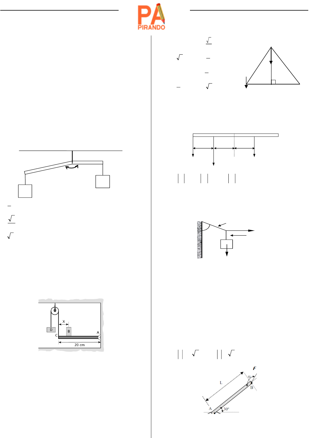 ESTÁTICA DOS SÓLIDOS PROFESSOR: Valentim Física – EEAr 01 – (EEAR) Em Estática existem duas condições de equilíbrio: a 1a diz que a resultante do sistema de forças deve ser nula e a 2a, que a soma algébrica dos momentos das forças do sistema, em relação ao mesmo ponto, também deve ser nula. Das condições citadas, estabelece o equilíbrio de um corpo extenso a) apenas a 1a. b) apenas a 2a. c) a 1a e a 2a alternadamente. d) a 1a e a 2a simultaneamente. 02 – (EEAR) A figura abaixo mostra um sistema constituído de duas barras A e B, rigidamente ligadas e em equilíbrio, suspensas pelo ponto P. A barra B, na horizontal, forma um ângulo de 150º com a barra A. Desprezando o peso das barras e sabendo que o comprimento da barra A é o dobro do comprimento da barra B, a relação entre os pesos dos corpos 2 e 1, suspensos nas extremi- dades das barras, vale 1 A 2 B 150 º • P a) 3 1 b) 3 3 c) 3 d) 3 03 – A figura mostra um bloco D de massa 0,50 kg preso a uma corda inextensível que passa por uma roldana. A outra extremidade da corda está presa à barra CA que pode girar em torno do eixo fixado à parede. Desprezando-se as forças de atrito e as massas da corda, da barra e da roldana, torna-se possível movimentar o bloco B, de 2,0 kg, ao longo da barra horizontal. A posição X, em cm, do bloco B para manter o sistema em equilíbrio estático é a) 20. b) 15. c) 10. d) 5,0. e) 2,5. 04 – (EEAR) As forças F1 e F2 atuam nos vértices de um triângulo eqüilátero de lado igual a x , conforme a figura. Os momentos de F1 e F2 em relação ao vértice C, possuem módulos, respectivamente, iguais a a) F1 x e F2 2 3 x b) F1 2 x e F2 2 x c) F1 x e F2 2 x d) F1 2 x e F2 2 x 05 – (EEAR) Considere as forças atuantes sobre a barra, de peso desprezível, conforme a figura. Qual o módulo do momento resultante, em N.m, em relação ao ponto O? Dados: N3FeN5F,N3F 321 === a) 30 b) 40 c) 50 d) 70 06 – (EEAR) A figura, abaixo, mostra um bloco de peso P sustentado por fios ideais. Calcule o módulo da força F horizontal, supondo que o conjunto esteja em repouso. a) F = P . tg b) F = P . sen c) F = P . cos d) F = P . sen . cos 07 – (EEAR) A figura a seguir mostra uma barra homogênea de peso P e comprimento AB = L. Esta barra possui uma articulação na extremidade A e está em equilíbrio devido à aplicação de uma força F na extremidade B. Qual deve ser o valor do ângulo , em graus, para que o equilíbrio seja mantido? Dados: N3FeN22P == a) 135° b) 120° c) 60° d) 45° O 5m 5m 5m 1 F 2 F 3 F F P Fio 1 Fio 2 x F2 A B C F1 ESTÁTICA DOS SÓLIDOS PROFESSOR: Valentim Física – EEAr 08 – Na figura, os fios são ideais, o corpo tem massa M e a aceleração da gravidade no local tem módulo g. A intensidade da tração no fio AB e a intensidade da força F que mantém o sistema em equilíbrio, valem, respectivamente, a) Mg cos ; Mg sen b) cos Mg ; Mg sen c) Mg sen ; Mg cos d) cos Mg ; Mg tg 09 – Um corpo é sustentado por duas cordas inextensíveis, conforme a figura. Sabendo-se que a intensidade da tração na corda AB é de 80 N, a intensidade da tração na corda BC será: a) 60 N. b) 340 N. c) 40 N. d) 360 N. 10 – Um móbile está preso no teto, conforme apresentado na figura. Cada barra horizontal tem tamanho h e a sua massa é desprezível. Sabendo-se que a única massa conhecida é a massa m e que o sistema se encontra em equilíbrio, o valor das massas x, y e z é, sequencialmente: a) m, 2 m3 e 2m b) m, 2 m3 e 2m c) 2m, 2m e 2m d) 2m, m e 2 m9 e) 2m, 2 m3 e 2 m9 11 – Dois baldes A e B, de massas desprezíveis, estão suspensos por roldanas e fios ideais, como está representado na figura abaixo. Eles contêm água e, quando o sistema está em equilíbrio, as massas de água nos baldes podem ser a) iguais. b) desiguais, sendo a massa de água do balde A o dobro da massa de água do balde B. c) diferentes, sendo a massa de água do balde B o dobro da massa de água do balde A. d) desiguais, sendo a massa de água do balde A o quádruplo da massa de água do balde B. e) diferentes, sendo a massa de água do balde B o quádruplo da massa de água do balde A. 12 – [EEAR] Uma barra rígida, uniforme e homogênea, pesando 720 N tem uma de suas extremidades articulada no ponto A da parede vertical AB = 8 m, conforme a figura. A outra extremidade da barra está presa a um fio ideal, no ponto C, que está ligado, segundo uma reta horizontal, no ponto D da outra parede vertical. Sendo a distância BC = 6 m, a intensidade da tração T, em N, no fio CD, vale: a) 450 b) 360 c) 300 d) 270 13 – [EEAR] Uma barra AB, rígida e homogênea, medindo 50 cm de comprimento e pesando 20 N, encontra-se equilibrada na horizontal, conforme a figura abaixo. O apoio, aplicado no ponto O da barra, está a 10 cm da extremidade A , onde um fio ideal suspende a carga Q1 = 50 N. A distância, em cm, entre a extremidade B e o ponto C da barra, onde um fio ideal suspende a carga Q2 = 10 N, é de: a) 5. b) 10. c) 15. d) 20. M B C A ESTÁTICA DOS SÓLIDOS PROFESSOR: Valentim Física – EEAr 14 - [EEAR] A barra homogênea, representada a seguir, tem 1m de comprimento, está submetida a uma força-peso de módulo igual a 200 N e se encontra equilibrada na horizontal sobre dois apoios A e B. Um bloco, homogêneo e com o centro de gravidade C, é colocado na extremidade sem apoio, conforme o desenho. Para a barra iniciar um giro no sentido anti-horário, apoiado em A e com um momento resultante igual a +10 N · m, esse bloco deve ter uma massa igual a kg. (Considere: módulo da aceleração da gravidade igual a 10 m/s2). a) 7, 5 b) 2, 5 c) 75 d) 25 15 – [EEAR] Na figura abaixo notamos uma esfera de peso P = 20 N, que esta apoiada numa superfície horizontal lisa, presa por uma corda ideal e solicitada por uma força F, igual a 10N. Determine a intensidade, em N, da força de reação normal da superfície horizontal sobre a esfera. (adote √3 = 1,7 ) a) 5 b) 10 c) 11,5 d) 15,5 16 – [EEAR] C