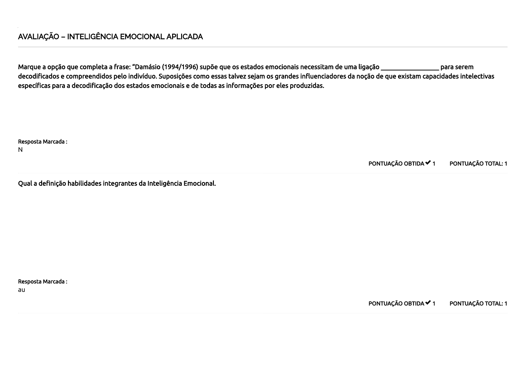 08/08/2022 22:56 Course Status – Pós Graduação Cerquilho https://ava.faculdadecerquilho.com.br/course-status/ 1/6 AVALIAÇÃO – INTELIGÊNCIA EMOCIONAL APLICADA PONTUAÇÃO TOTAL: 1PONTUAÇÃO OBTIDA 1 Marque a opção que completa a frase: “Damásio (1994/1996) supõe que os estados emocionais necessitam de uma ligação __________________ para serem decodi�cados e compreendidos pelo indivíduo. Suposições como essas talvez sejam os grandes in�uenciadores da noção de que existam capacidades intelectivas especí�cas para a decodi�cação dos estados emocionais e de todas as informações por eles produzidas. Resposta Marcada : Neocortical PONTUAÇÃO TOTAL: 1PONTUAÇÃO OBTIDA 1 Qual a de�nição habilidades integrantes da Inteligência Emocional. Resposta Marcada : autoconsciência, automotivação, autocontrole, empatia e sociabilidade. 08/08/2022 22:56 Course Status – Pós Graduação Cerquilho https://ava.faculdadecerquilho.com.br/course-status/ 2/6 PONTUAÇÃO TOTAL: 1PONTUAÇÃO OBTIDA 1 Dentre as alternativas abaixo marque a assertivas que melhor descreve a autoconsciência. Resposta Marcada : Conotação positiva: facilidade de lidar com os próprios sentimentos no que se refere a identi�cação, nomeação, avaliação, reconhecimento e atenção a estes sentimentos. Conotação negativa: di�culdade de lidar com os próprios sentimentos no que se refere a identi�cação, nomeação, avaliação, reconhecimento e atenção a estes sentimentos. PONTUAÇÃO TOTAL: 1PONTUAÇÃO OBTIDA 0 A autoconsciência é um modo neutro que está em constante vigilância, mesmo quando o indivíduo se encontra em situações emocionalmente perturbadoras. Segundo: Resposta Marcada : Brasovisk (1995:60). 08/08/2022 22:56 Course Status – Pós Graduação Cerquilho https://ava.faculdadecerquilho.com.br/course-status/ 3/6 PONTUAÇÃO TOTAL: 1PONTUAÇÃO OBTIDA 1 Relacione a primeira coluna de acordo com a segunda: 1. Autocontrole: 2. Empatia: 3. Sociabilidade: ( ) Conotação positiva: facilidade de administrar os próprios sentimentos, impulsos, pensamentos e comportamentos. Conotação negativa: di�culdade de administrar os próprios sentimentos, impulsos, pensamentos e comportamentos. ( ) Conotação positiva: facilidade de identi�car os sentimentos, desejos, intenções, problemas, motivos e interesses dos outros, através da leitura e compreensão de comportamentos não verbais de comunicação, tais como, expressões faciais, tom de voz e postura corporal. Conotação negativa: di�culdade de identi�car os sentimentos, desejos, intenções, problemas, motivos e interesses dos outros, através da leitura e compreensão de comportamentos não verbais de comunicação, tais como, expressões faciais, tom de voz e postura corporal. ( ) Conotação positiva: facilidade de iniciar e preservar as amizades, ser aceito pelas pessoas, valorizar as relações sociais, adaptar–se a situações novas, liderar, coordenar e orientar as ações das outras pessoas. Conotação negativa: di�culdade de iniciar e preservar amizades, ser pouco aceito pelas pessoas, evitar reuniões sociais, não adaptar-se a situações novas, bem como possuir di�culdades em liderar e coordenar grupos ou ações de outras pessoas. Resposta Marcada : 1,2,3 08/08/2022 22:56 Course Status – Pós Graduação Cerquilho https://ava.faculdadecerquilho.com.br/course-status/ 4/6 PONTUAÇÃO TOTAL: 1PONTUAÇÃO OBTIDA 1 A formulação da teoria das inteligências múltiplas tem seu início histórico em: Resposta Marcada : 1979 PONTUAÇÃO TOTAL: 1PONTUAÇÃO OBTIDA 1 A Inteligência Interpessoal é caracterizada pela sua: Resposta Marcada : Capacidade do indivíduo de ouvir, entender e apreciar os sentimentos dos outros. 08/08/2022 22:56 Course Status – Pós Graduação Cerquilho https://ava.faculdadecerquilho.com.br/course-status/ 5/6 PONTUAÇÃO TOTAL: 1PONTUAÇÃO OBTIDA 1 é o caminho para assumir algum controle sobre as emoções. Neste controle, o primeiro passo é a consciência dos sentimentos e o segundo é a ação propriamente dita. Complete a frase: Resposta Marcada : A auto percepção PONTUAÇÃO TOTAL: 1PONTUAÇÃO OBTIDA 1 Os pesquisadores emergentes desse movimento cientí�co de reforma das concepções de inteligência humana têm sugerido de�nições menos restritas, enfatizando a natureza multifacetada da: Resposta Marcada : Inteligência humana 08/08/2022 22:56 Course Status – Pós Graduação Cerquilho https://ava.faculdadecerquilho.com.br/course-status/ 6/6 9 / 10 PONTUAÇÃO TOTAL: 1PONTUAÇÃO OBTIDA 1 A capacidade de utilizar o próprio corpo ou parte dele para resolver um problema ou elaborar produtos. Resposta Marcada : A Inteligência Corporal – Cinestésica Total