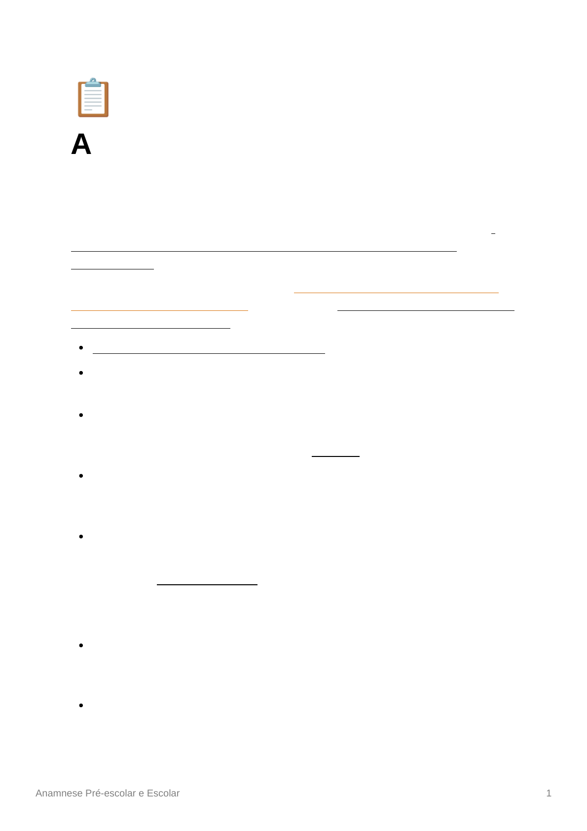 Anamnese Pré-escolar e Escolar 1 📋 Anamnese Pré-escolar e Escolar Esse período da vida da criança é marcado por intensa atividade motora, com rápida aquisição de habilidades, linguagem e grande capacidade de aprendizagem. Por isso é importante, durante a consulta, avaliar a dinâmica familiar e o estilo pessoal da criança e da família, com objetivo de promover integração e atender às necessidades da criança para o desenvolvimento. Exploram-se as dúvidas e preocupações dos pais. A partir da idade de 3 a 4 anos, deve-se estabelecer um diálogo com a criança durante a consulta. Para avaliar o cotidiano da criança, devem ser feitas perguntas sobre a alimentação, a participação nas refeições familiares e os padrões de lanches, além da conduta em relação às recusas alimentares. Outros tópicos incluem padrões e preocupações com o sono, especialmente o despertar noturno perturbado, progressos e dificuldades no treinamento esfincteriano, cuidados dentários e medidas de prevenção de acidentes. As habilidades motoras e a sociais também devem ser motivo de questionamentos. Com relação às crianças maiores, indaga-se e estimula-se a prática de esportes e exercícios físicos. Abordar os pais a respeito da avaliação deles em relação à saúde geral da criança, com ênfase na frequência de infecções comuns da infância e reações alérgicas. No conteúdo afetivo, os pais são incentivados a falarem sobre as reações do pré-escolar que oscilam entre manifestações de dependência e Anamnese Pré-escolar e Escolar 2 independência, negativismo, ansiedade de separação e dificuldade para controlar os impulsos. Brincadeiras preferidas e a integração entre o pré-escolar e os demais familiares. Comportamento (extrovertido, tímido), na adaptação ao ritmo de 1 ano escolar formal e nas interações com os colegas. Conteúdo cognitivo= conteúdo e a complexidade da linguagem. Aos 2 anos de idade, cerca de 50% da fala da criança deve ser inteligível. Erros de articulação, como substituir “r” por “l” ou “c” por “t”, são comuns e normais no segundo ano de vida. Aos 4 anos, quase toda a fala da criança deve ser compreensível. Desempenho da criança na escola, o que gosta e desgosta nela, notas, absenteísmo e repetência. História familiar, antecedentes e condições atuais de saúde da família.