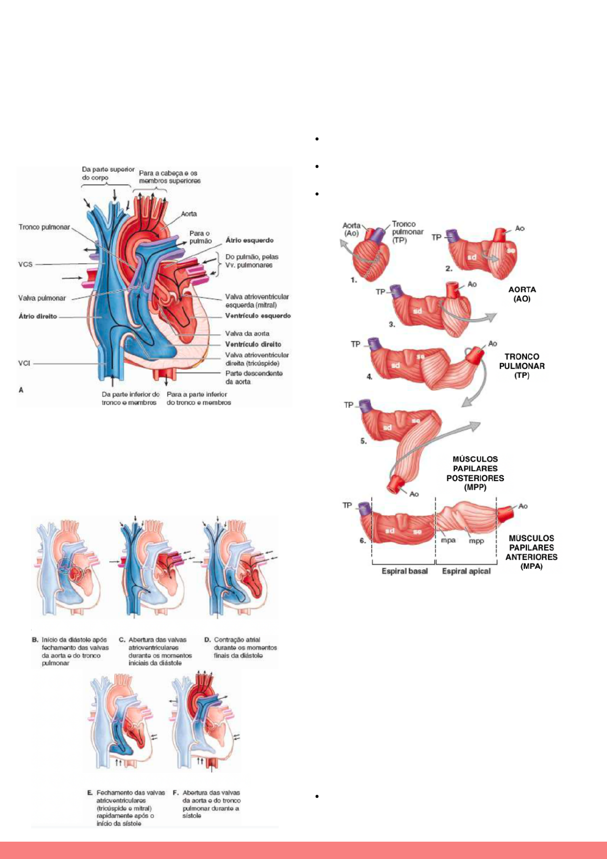 A N A T O M I A D O C O R A Ç Ã O É uma bomba dupla, autoajustável, de sucção e pressão, pouco maior do que um mão fechada, cujas partes trabalham em conjunto para impulsionar o sangue para o corpo, o lado direito do coração (coração direito) recebe sangue pouco oxigenado (venoso) do corpo pelas VCS e VCI e o bombeia através do tronco e das artérias pulmonares para ser oxigenado nos pulmões, já o lado esquerdo do coração (coração esquerdo) recebe sangue bem oxigenado (arterial) dos pulmões através das veias pulmonares e o bombeia para a aorta, de onde é distribuído para o corpo. LAYANE SILVA ENDOCÁRDIO: fina camada interna ou membrana de revestimento do coração que também cobre de suas valvas; MIOCÁRDIO: camada intermediária helicoidal e espessa, formada por músculo cardíaco; EPICÁRDIO: camada externa fina (mesotélio) formada pela lâmina visceral do pericárdio seroso. Dois sons cardíacos (bulhas cardíacas) são auscultados com um estetoscópio: um som TUM (1o) quando o sangue é transferido dos átrios para os ventrículos e um som TÁ (2o) quando os ventrículos ejetam o sangue do coração. Os sons são produzidos pelo estalido de fechamento das valvas unidirecionais que impedem o refluxo do sangue durante as contrações do coração, a parede de cada câmara cardíaca tem 3 camadas, da superficial para a profunda: mantém os óstios das valvas AV e arteriais permeáveis e impede que sejam excessivamente distendidos por um aumento do volume de sangue bombeado através deles; As paredes do coração são formadas por miocárdio espesso, sobretudo nos ventrículos, cuja contração produz uma torção devido à orientação helicoidal dupla das fibras musculares cardíacas. Inicialmente, esse movimento ejeta o sangue dos ventrículos enquanto a camada espiral externa (basal) contrai, estreitando e depois encurtando o coração, reduzindo o volume das câmaras ventriculares. A contração sequencial contínua da camada espiral interna (apical) alonga o coração, seguida por alargamento enquanto o miocárdio relaxa rapidamente, aumentando o volume das câmaras para receber sangue dos átrios. As fibras musculares cardíacas estão fixadas ao esqueleto fibroso do coração, uma estrutura complexa de colágeno denso que forma 4 anéis fibrosos que circundam os óstios das valvas e os trígonos fibrosos direito e esquerdo, cujas funções são: O coração tem 4 câmaras: átrios direito e esquerdo, ventrículos direito e esquerdo, aqueles são câmaras de recepção que bombeiam sangue para os ventrículos (câmaras de ejeção), as ações sincrônicas das 2 bombas atrioventriculares (AV) cardíacas (câmaras direita e esquerda) constituem o ciclo cardíaco, que começa com alongamento e enchimento ventricular (diástole) e termina com encurtamento e esvaziamento ventricular (sístole). LAYANE SILVA fixação para as válvulas das valvas e o miocárdio, que, quando não espiralado, forma uma faixa miocárdica ventricular contínua originada no anel fibroso da valva do tronco pulmonar e inserida no anel fibroso da valva da aorta; "isolante" elétrico, separando os impulsos conduzidos mioentericamente dos átrios e ventrículos, de forma que a contração delas seja independente, e circundando e dando passagem à parte inicial do feixe AV do complexo estimulante. FACE ESTERNOCOSTAL (anterior): ventrículo direito; FACE DIAFRAGMÁTICA (inferior): ventrículo esquerdo e em parte pelo ventrículo direito, está relacionada principalmente ao centro tendíneo do diafragma; FACE PULMONAR DIREITA: átrio direito; FACE PULMONAR ESQUERDA: ventrículo esquerdo, forma a impressão cardíaca do pulmão esquerdo. As 4 faces do coração são formadas por: Parte inferolateral do VE, situa-se posteriormente ao 5o espaço intercostal esquerdo em adultos, em geral, a 9 cm do plano mediano, fica imóvel durante o ciclo cardíaco, é o local onde os batimentos cardíacos podem ser auscultados na parede torácica. ÁPICE DO CORAÇÃO Na parte externa, os átrios são demarcados dos ventrículos pela sulco coronário e os ventrículos direito e esquerdo são separados pelos sulcos interventriculares (IV) anterior e posterior, o coração parece trapezóide em uma vista anterior ou posterior, mas seu formato tridimensional é semelhante ao de uma pirâmide tombada com o ápice (voltado anteriormente e para a esquerda), uma base (oposta ao ápice) e 4 faces. Face posterior do coração, formada pelo átrio esquerdo, está voltada posteriormente em direção aos corpos das vértebras T VI a T IX e separada delas pelo pericárdio, seio oblíquo do pericárdio, esôfago e aorta, estende-se superiormente até a bifurcação do tronco pulmonar e inferiormente até o sulco coronário, recebe as veias pulmonares nos lados direito e esquerdo de sua porção atrial esquerda e as veias cavas superior e inferior nas extremidades superior e inferior de sua porção atrial direita. BASE DO CORAÇÃO MARGEM DIREITA (ligeiramente convexa): átrio direito e estendendo-se entre a VCS e a VCI; MARGEM INFERIOR (quase horizontal): ventrículo direito e pequena parte pelo ventrículo esquerdo; As 4 margens do coração são formadas por: LAYANE SILVA MARGEM ESQUERDA: ventrículo esquerdo e pequena parte pela aurícula esquerda; MARGEM SUPERIOR: átrios e aurículas direita e esquerda em vista anterior, a parte ascendente da aorta e o tronco pulmonar emergem dessa margem e a VCS entre no seu lado direito, posteriormente à aorta e ao tronco pulmonar e anteriormente à VCS, forma o limite inferior do seio transverso do pericárdio. O tronco pulmonar, com 5 cm de comprimento e 3 cm de largura, é a continuação arterial do ventrículo direito e divide-se em artérias pulmonares direita e esquerda, que juntas conduzem o sangue pouco oxigenado para oxigenação nos pulmões. Lisa, paredes finas (seio das veias cavas), onde se abrem as veias cavas e o seio coronário, que trazem sangue pouco oxigenado