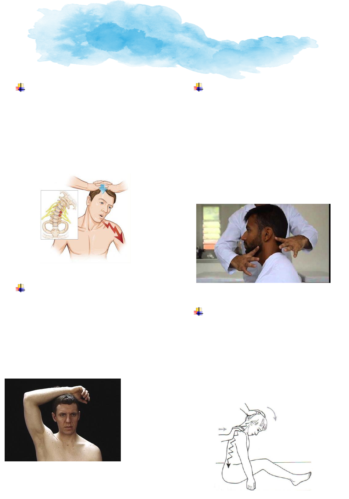 Ana Vitória Dias 2º Período Manobras da Coluna Manobra de Spurling Estender a cervical inclinando-a para o lado sintomático e aplicar pressão sobre o topo da cabeça O resultado é positivo quando gera dor similar a referida pelo paciente, com irradiação para o membro acometido ( braço) Sinal do Alivio da Abdução Os pacientes que experimentam uma redução da dor no braço ao sentar-se com a mão no lado afetado no topo da cabeça (sinal de alívio de abdução, Figura 8-9 ) podem estar diminuindo a irritação da raiz nervosa ao reduzir a tensão no plexo inferior ou nas raízes cervicais inferiores . Teste da distração Com o paciente sentado, segurar a cabeça posicionando uma mão abaixo do queixo e outra na região occipital aplicando gradualmente uma força de distração na direção oposta ao tronco Esta manobra pode aliviar a dor consequente a compressão radicular. Manobra de Lhermite Faz – se a extensão da cervical, possibilitando que o queixo toque a base do pescoço É positivo quando ao ser realizado o movimento e percebe-se uma dor irradiada. Coluna Cervical Ana Vitória Dias 2º Período Manobras da Coluna Teste da deglutição Observa-se a deglutição do paciente É positivo quando ocorre disfagia (dificuldade para engolir) podendo comprovar alguma patologia da coluna cervical) Vasalva Pede-se ao paciente forçar uma tosse, ou uma força de evacuação, aumentando a pressão abdominal. É positivo quando houver alguma dor irradiando Avaliação vascular – teste da patência da artéria vertebral Faz –se a extensão da cabeça, em seguida, rotaciona a cabeça para a esquerda e direita, deixando- o nessa posição por 30 segundos. Deve-se perceber o movimento dos olhos, vertigem, etc. Avaliação vascular - teste de Adson (patência da artéria subclávia) Palpando-se o pulso radial, deve-se abduzir e rodar externamente o braço, em seguida, o paciente deve prender a respiração (em inspiração) e mover a cabeça em direção ao membro examinado O resultado positivo é a diminuição da percepção ou mesmo o desaparecimento do pulso braquial - o teste pode ser feito bilateralmente. Ana Vitória Dias 2º Período Manobras da Coluna Expansibilidade Torácica (reduzida se menor que 3 cm) A manobra da expansibilidade torácica deve ser feita de ambos os lados, anterior e posterior, posicionando os polegares entre a linha média e pedindo para o paciente inspirar profundamente. A expansibilidade é reduzida ser for menor que 3 cm. Pode-se utilizar também a fita métrica para medir Mobilidade Torácica – Manobra de Stibor (distância de C7 a T12 – aumento de no mínimo 2,5 cm) Entre as posições ereta e em flexão da coluna lombar, utiliza-se para medir a fita métrica. Alinhamento da coluna Torácica Coluna Torácica Ana Vitória Dias 2º Período Manobras da Coluna Coluna Lombar Mobilidade da coluna lombar – Manobra de Shober Distância de S1 a uma marcação de 10 cm acima Aumento mínimo de 5 cm com o movimento de flexão do tronco Manobra das contrações dos glúteos Em busca de atrofias Pressiona-se com as pontas dos dedos os glúteos, e pede- se ao paciente para contrai-los, deve-se perceber uma contração igualitária de ambos os lados. Ana Vitória Dias 2º Período Manobras da Coluna Manobra de Trendelenburg (glúteo médio) Teste de Thomas (contratura em flexão do quadril) Consistiu em posicionar o paciente em decúbito dorsal, o qual faz uma flexão do membro inferior em teste (no mínimo a 90º de flexão), elevando-se o joelho até ao peito, com o objetivo de diminuir a curvatura lombar e estabilizar a pelve. O teste foi é considerado concluído se o joelho e anca contralateral se mantiverem apoiados na marquesa. Coluna Sacral/ articulação sacroilíaca Manobra de Lewis (contratura em flexão do quadril) O paciente é posicionado em decúbito lateral, na posição semi fetal. O examinador colocará a mão sobre a sacro- ilíaca e com a outra mão comprime as cristas ilíacas. O teste é positivo caso haja dor irradiada para as nádegas. Manobra de Menel (bilateral) Paciente em decúbito lateral com uma perna em flexão sendo segurado pelo paciente. A perna voltada para cima é segurada com as duas mãos do examinador, uma no joelho e a outra na nádega, sendo feita a extensão da perna. O exame é positivo se o paciente se queixa de dor em nadega. É realizada na suspeita de sacroileite. Pressionar Ana Vitória Dias 2º Período Manobras da Coluna Manobra de Volkman - (Afastamento) Diferentemente da foto, pode-se fazer o afastamento com as mãos em X, segurando as cristas ilíacas e afastando- as. Manobra de Erichensen – (Aproximação) O contrário da manobra de Volkman Manobra de Patrick Fabere Com o paciente em decúbito dorsal pede-se que ele realize flexão seguida de abdução e rotação externa do membro inferior a ser investigado. Força-se a coxa do paciente em direção a maca, tentado aproxima-la da superfície. O paciente pode queixar-se de dor em região anterior ou mesmo posterior nas nadegas.