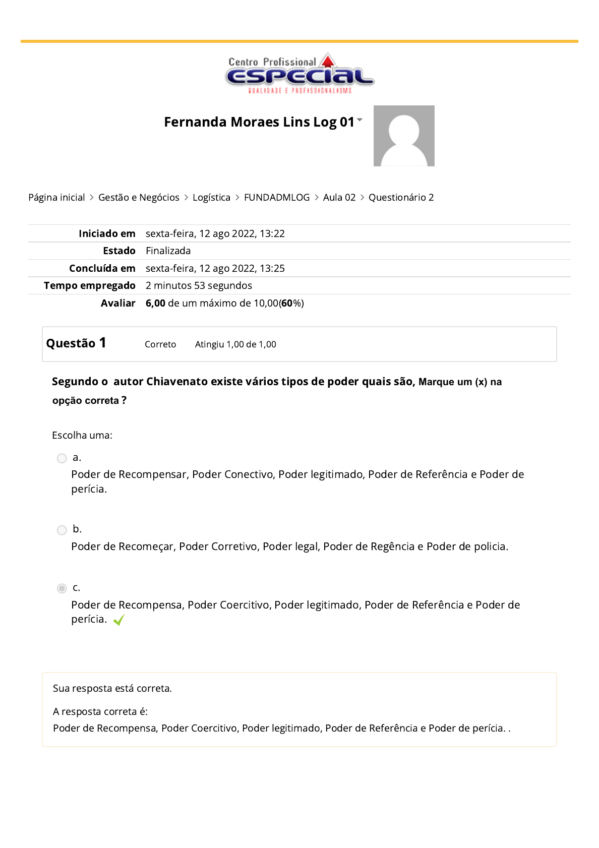 Iniciado em sexta-feira, 12 ago 2022, 13:22 Estado Finalizada Concluída em sexta-feira, 12 ago 2022, 13:25 Tempo empregado 2 minutos 53 segundos Avaliar 6,00 de um máximo de 10,00(60%) Questão 1 Correto Atingiu 1,00 de 1,00 Segundo o autor Chiavenato existe vários tipos de poder quais são, Marque um (x) na opção correta ? Escolha uma: a. Poder de Recompensar, Poder Conectivo, Poder legitimado, Poder de Referência e Poder de perícia. b. Poder de Recomeçar, Poder Corretivo, Poder legal, Poder de Regência e Poder de policia. c. Poder de Recompensa, Poder Coercitivo, Poder legitimado, Poder de Referência e Poder de perícia. Sua resposta está correta. A resposta correta é: Poder de Recompensa, Poder Coercitivo, Poder legitimado, Poder de Referência e Poder de perícia. . Página inicial Gestão e Negócios Logística FUNDADMLOG Aula 02 Questionário 2 Fernanda Moraes Lins Log 01 http://centroprofissionalespecial.com.br/moodle http://centroprofissionalespecial.com.br/moodle/user/view.php?id=6278&course=438 http://centroprofissionalespecial.com.br/moodle/ http://centroprofissionalespecial.com.br/moodle/course/index.php?categoryid=8 http://centroprofissionalespecial.com.br/moodle/course/index.php?categoryid=28 http://centroprofissionalespecial.com.br/moodle/course/view.php?id=438 http://centroprofissionalespecial.com.br/moodle/mod/quiz/view.php?id=13242 Questão 2 Correto Atingiu 1,00 de 1,00 Diante do que foi estudado marque um (x) na opção correta no que diz respeito sobre as características de linha? Escolha uma: a. Responsabilidade direta sobre os objetivos organizacionais e possui autoridade. b. Atuam em diferentes funções e facilitadores do processo decisório e possuem autoridade Sua resposta está correta. A resposta correta é: Responsabilidade direta sobre os objetivos organizacionais e possui autoridade.. Questão 3 Correto Atingiu 1,00 de 1,00 1 - Marque um (x) na opção correta no que diz respeito ao ato de dirigir na administração? Escolha uma: a. Interpretar os planos para os outros e dar as instruções sobre como executá-los. b. Interromper os planos para os outros e dar as instruções sobre como executá-los. c. Interpretar os planos para os outros e dar as instruções sobre como não executá-los. Sua resposta está correta. A resposta correta é: Interpretar os planos para os outros e dar as instruções sobre como executá-los.. Questão 4 Incorreto Atingiu 0,00 de 1,00 A Descentralização acontece quando a autoridade para tomar decisões está concentrada no topo da organização. Esta afirmação é? Escolha uma opção: Verdadeiro Falso A resposta correta é 'Falso'. Questão 5 Correto Atingiu 1,00 de 1,00 Marque X na alternativa correta, para o que se diz respeito as vantagens da Centralização. Escolha uma: a. Controle -> melhor método de controlar e coordenar as atividades e recursos da organização; Custos -> Menos recursos para se administrar; Novas Tecnologias -> a tecnologia da informação permite maior descentralização de autoridade. b. Custos -> Mais recursos para não administrar; Velhas Tecnologias -> a tecnologia da informação permite maior descentralização de autoridade. Sua resposta está correta. A resposta correta é: Controle -> melhor método de controlar e coordenar as atividades e recursos da organização; Custos -> Menos recursos para se administrar; Novas Tecnologias -> a tecnologia da informação permite maior descentralização de autoridade.. Questão 6 Incorreto Atingiu 0,00 de 1,00 Como é conhecida amplitude administrativa? Marque um (x) na opção correta. Escolha uma: a. Amplitude de conformidade b. Amplitude de controle c. Amplitude de direção Sua resposta está incorreta. A resposta correta é: Amplitude de controle. Questão 7 Correto Atingiu 1,00 de 1,00 Entendendo conceitos temos o que é LEALDADE, Marque um (x) na opção correta? Escolha uma: a. a-É a transferência de determinado nível de autoridade de um chefe para seu subordinado, criando a correspondente responsabilidade pela execução. b. a-É uma atitude de sentimento de ligação, pela comunhão de ideias entre um mesmo grupo - chefes/subordinados, pares. c. É a aceitação do papel a ser desempenhado na organização e atribuído ao ocupante do cargo. Sua resposta está correta. A resposta correta é: a-É uma atitude de sentimento de ligação, pela comunhão de ideias entre um mesmo grupo - chefes/subordinados, pares. . Questão 8 Incorreto Atingiu 0,00 de 1,00 A direção está relacionada com... Marque um (x) na opção correta? Escolha uma: a. a-Lealdade e cumplicidade b. Autoridade e poder c. a-Determinação de controle Sua resposta está incorreta. A resposta correta é: Autoridade e poder . Questão 9 Correto Atingiu 1,00 de 1,00 Características Staff são atuam em diferentes funções; facilitadores do processo decisório e possuem autoridade. Esta afirmação é? Escolha uma opção: Verdadeiro Falso A resposta correta é 'Verdadeiro' Questão 10 Incorreto Atingiu 0,00 de 1,00 A Centralização acontece quando a autoridade para tomar decisões está dispersa na base da organização. Esta afirmação é? Escolha uma opção: Verdadeiro Falso A resposta correta é 'Falso'.