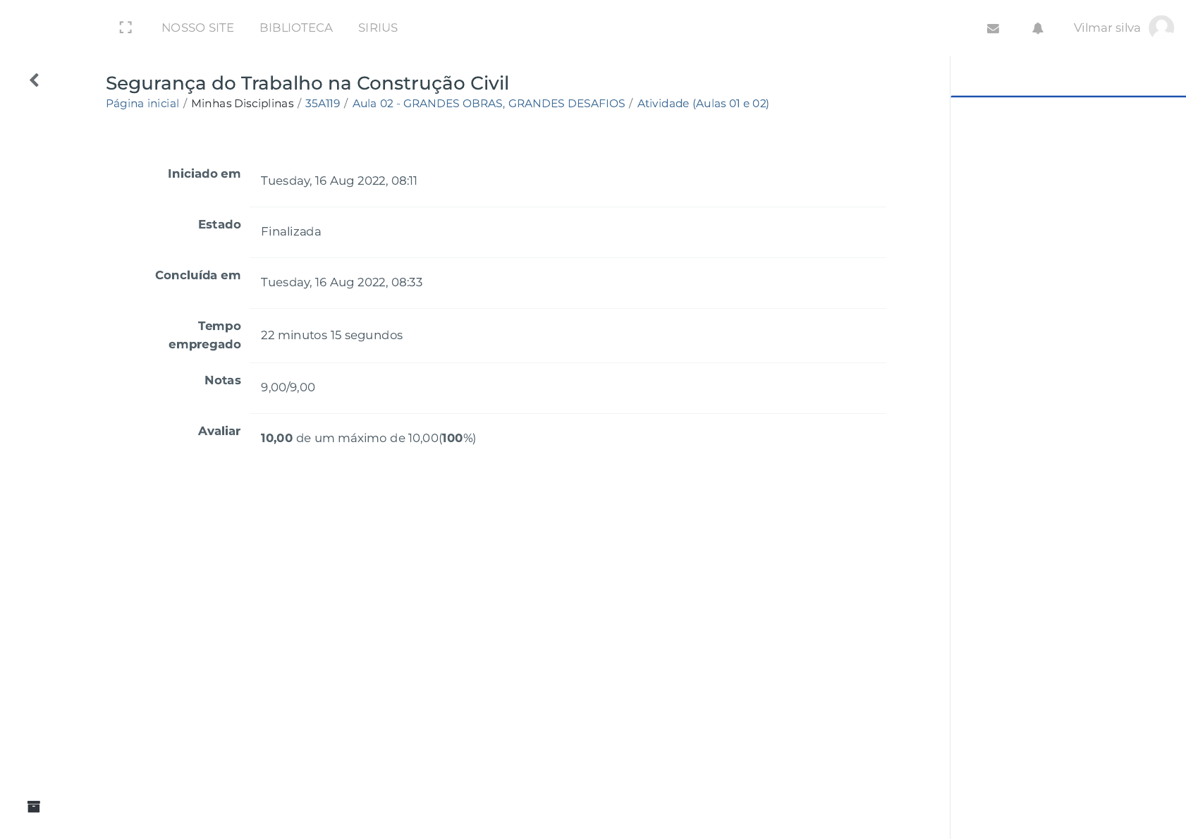 Página inicial / Minhas Disciplinas / 35A119 / Aula 02 - GRANDES OBRAS, GRANDES DESAFIOS / Atividade (Aulas 01 e 02) Segurança do Trabalho na Construção Civil Iniciado em Tuesday, 16 Aug 2022, 08:11 Estado Finalizada Concluída em Tuesday, 16 Aug 2022, 08:33 Tempo empregado 22 minutos 15 segundos Notas 9,00/9,00 Avaliar 10,00 de um máximo de 10,00(100%) NOSSO SITE BIBLIOTECA SIRIUS Vilmar silva https://ava.politecnicabr.com.br/ https://ava.politecnicabr.com.br/course/view.php?id=1041 https://ava.politecnicabr.com.br/course/view.php?id=1041#section-4 https://ava.politecnicabr.com.br/mod/quiz/view.php?id=32254 https://ava.politecnicabr.com.br/course/view.php?id=1041 javascript:void(0) javascript:void(0) javascript:void(0) javascript:void(0) javascript:void(0) javascript:void(0) javascript:void(0) javascript:void(0) javascript:void(0) javascript:void(0) javascript:void(0) javascript:void(0) javascript:void(0) javascript:void(0) javascript:void(0) https://ava.politecnicabr.com.br/course/index.php https://ava.politecnicabr.com.br/ https://www.politecnicabr.com.br/ https://biblioteca.politecnicabr.com.br/student http://sirius.politecnicabr.com.br/ javascript:void(0) javascript:void(0) Questão 1 Correto Atingiu 1,00 de 1,00 Sabe-se que os acidentes com lesões graves ou fatais nesta indústria são originados, em sua maioria (70% ou mais dos casos), em um restrito grupo de causas, para as quais já existem medidas preventivas e protetivas estabelecidas. Dados nacionais, que encontram correspondência em nível local, apontam que as principais causas de acidentes na Construção Civil, por ordem de contribuição para o número total de casos, são respectivamente. Escolha uma opção: a. 1. Queda de altura; 2. Choque elétrico; 3. Soterramentos; 4. Choque ou impacto mecânico. b. 1. Queda de altura; 2. Soterramentos; 3. Choque elétrico; 4. Choque ou impacto mecânico. c. 1. Queda de altura; 2. Choque elétrico; 3. Choque ou impacto mecânico; 4. Soterramentos. d. 1. Choque elétrico; 2. Queda de altura; 3. Soterramentos; 4. Choque ou impacto mecânico. NOSSO SITE BIBLIOTECA SIRIUS Vilmar silva https://ava.politecnicabr.com.br/course/view.php?id=1041 javascript:void(0) javascript:void(0) javascript:void(0) javascript:void(0) javascript:void(0) javascript:void(0) javascript:void(0) javascript:void(0) javascript:void(0) javascript:void(0) javascript:void(0) javascript:void(0) javascript:void(0) javascript:void(0) javascript:void(0) javascript:void(0) javascript:void(0) javascript:void(0) https://ava.politecnicabr.com.br/course/index.php https://ava.politecnicabr.com.br/ https://www.politecnicabr.com.br/ https://biblioteca.politecnicabr.com.br/student http://sirius.politecnicabr.com.br/ javascript:void(0) javascript:void(0) Questão 2 Correto Atingiu 2,00 de 2,00 Assinale (V) Verdadeiro e (F) Falso, relacionado aos acidentes em grandes obras. ( ) O Empire State Building (381 m, anos 1930), o mais alto edifício do mundo por um largo período de tempo, registra em sua construção números entre 5 e 10 mortes de operários. ( ) O Canal do Panamá (80 km de extensão, iniciado em 1880 e construído em duas etapas: franceses à frente até 1889, nesse período há o registro de, pelo menos, 20 mil mortes; e de 1900 a 1914, a obra foi realizada pelos americanos, quando são computadas outras 6 mil mortes o�ciais) é a obra mundial recordista em óbitos de trabalhadores (mais de 25 mil ao longo de seus 35 anos). ( ) a construção da Torre Eiffel (324 m de altura e peso de cerca de 10.000 ton., 1889-1900), na França, não registrou nenhum acidente fatal em todas as suas etapas, desde a confecção, transporte e montagem de suas 18.000 peças de aço, maior parte das quais fundidas e unidas por cerca de 2,5 milhões de rebites, o que nos leva a crer que, apesar de toda a grandiosidade de uma obra, é possível a sua conclusão sem perda de vidas humanas. ( ) A Ponte Rio-Niterói, ícone da Engenharia Civil de nosso país (13 km de extensão, anos 1950), registra, o�cialmente, que menos de 20 operários faleceram em sua construção. Contudo, ecoa a lenda de que para cada um de seus pilares, repousa sob o concreto um ou mais trabalhadores. Escolha uma opção: a. V, V, F, F b. F, V, V, V c. V, V, V, F d. V, V, V, V e. F, F, V, V NOSSO SITE BIBLIOTECA SIRIUS Vilmar silva https://ava.politecnicabr.com.br/course/view.php?id=1041 javascript:void(0) javascript:void(0) javascript:void(0) javascript:void(0) javascript:void(0) javascript:void(0) javascript:void(0) javascript:void(0) javascript:void(0) javascript:void(0) javascript:void(0) javascript:void(0) javascript:void(0) javascript:void(0) javascript:void(0) javascript:void(0) javascript:void(0) javascript:void(0) https://ava.politecnicabr.com.br/course/index.php https://ava.politecnicabr.com.br/ https://www.politecnicabr.com.br/ https://biblioteca.politecnicabr.com.br/student http://sirius.politecnicabr.com.br/ javascript:void(0) javascript:void(0) Questão 3 Correto Atingiu 2,00 de 2,00 Assinale (V) Verdadeiro e (F) Falso, relacionado aos acidentes em grandes obras. ( ) O que torna uma obra mais perigosa é a complexidade das atividades, o tamanho das peças a serem construídas, transportadas e içadas, além das características do meio ambiente de trabalho local onde as obras são feitas. ( ) Infelizmente, não raro, essas obras são obtidas com um grande custo humano. Seja em decorrência das condições de trabalho inadequadas, seja dos acidentes resultantes, muitos dos quais fatais. ( ) Os riscos existentes em uma obra são resultado de algumas variáveis como método construtivo, equipamentos utilizados, condições climáticas, acesso, quantidade, volume e tamanho dos materiais utilizados, trabalhos sobrepostos, número de trabalhadores etc. ( ) A construção da Torre Eiffel é emblemática não só pelos números alcançados pelo processo de produção, sobretudo em razão da fundição de peças de grandes dimensões, montadas em tre